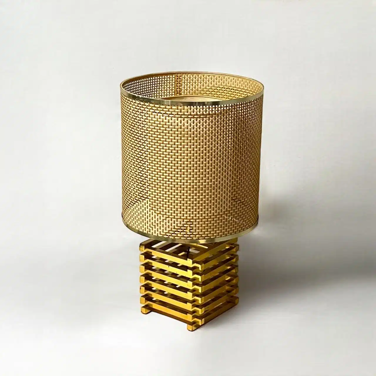 This handmade lamp is made of 28 interlocked brass bars that supports the bulb holder. The quality of materials is outstanding, typical of the maker.