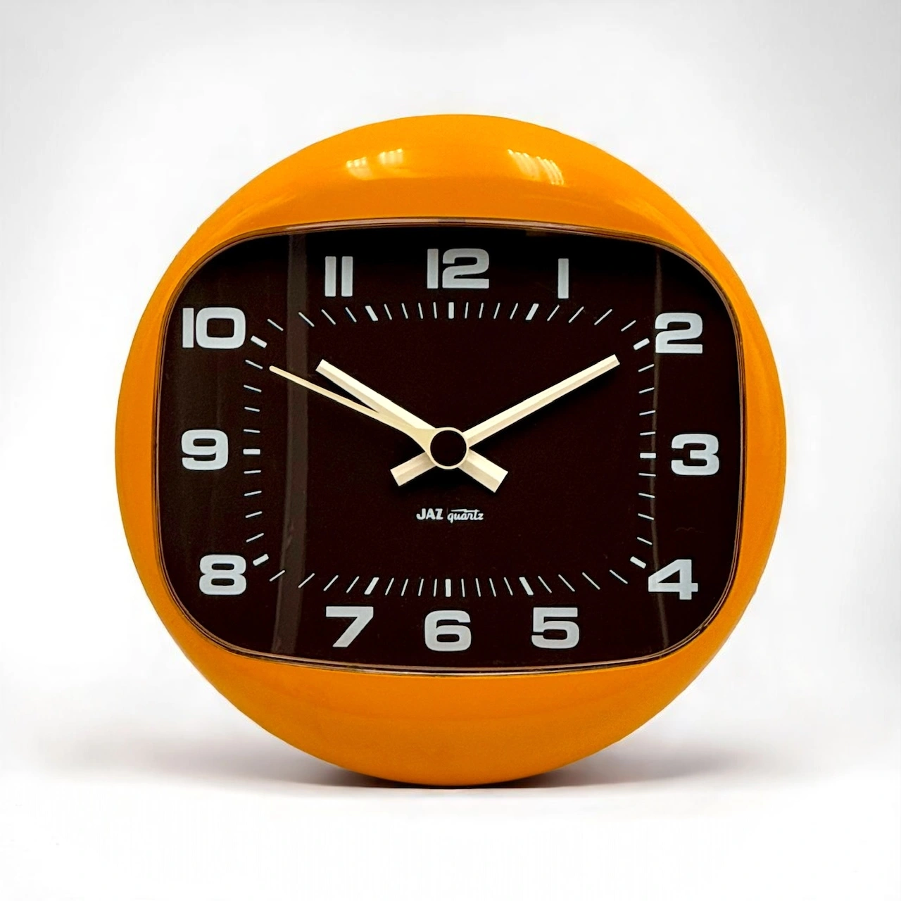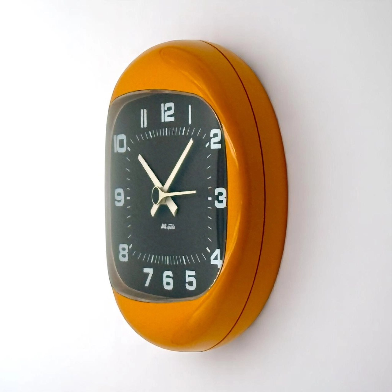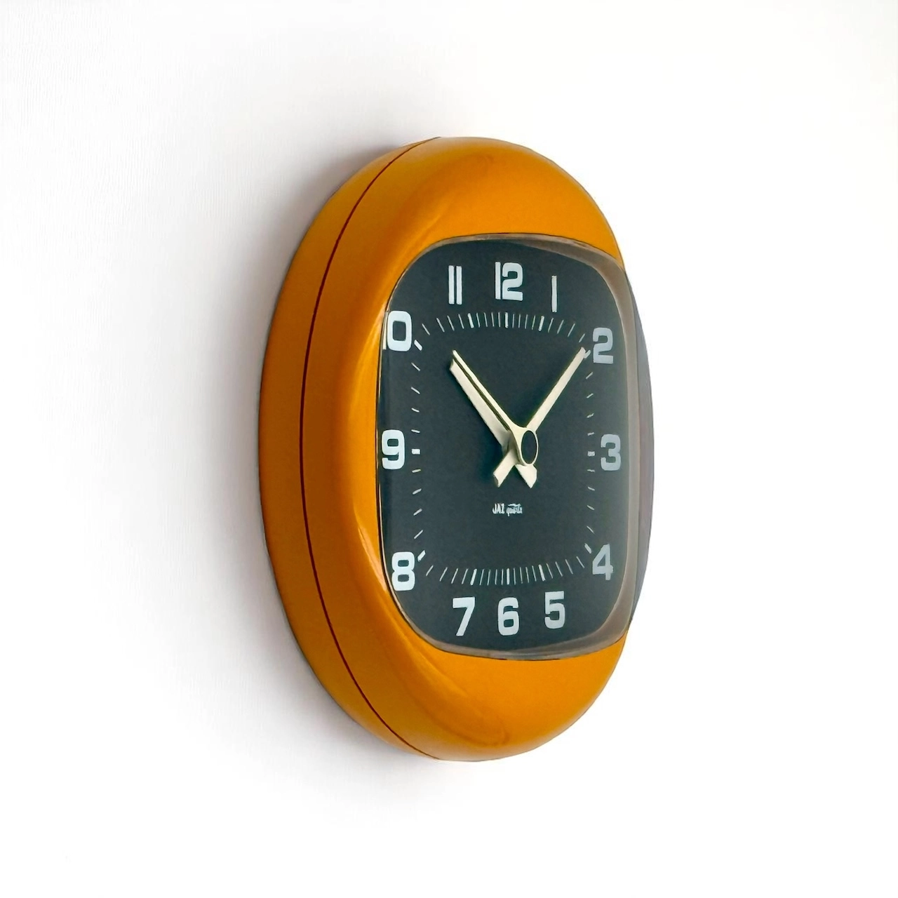 Vintage 70s space age wall clock by JAZ. Bold mustard and black design, German quartz, futuristic curves. Excellent condition, rare collectible.