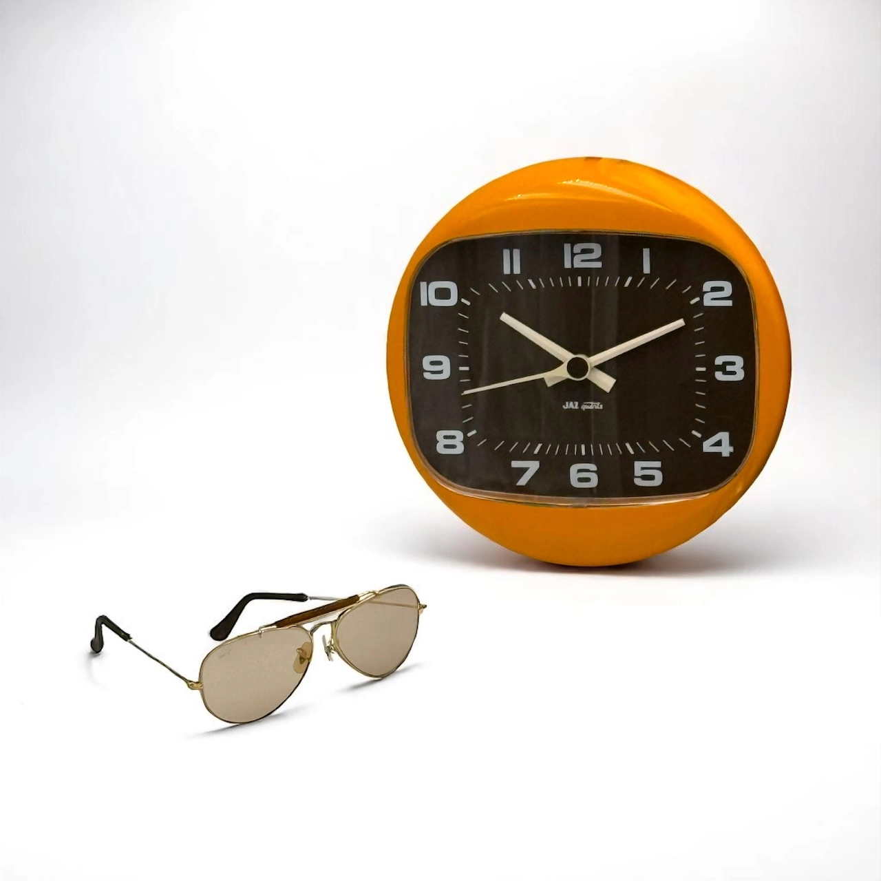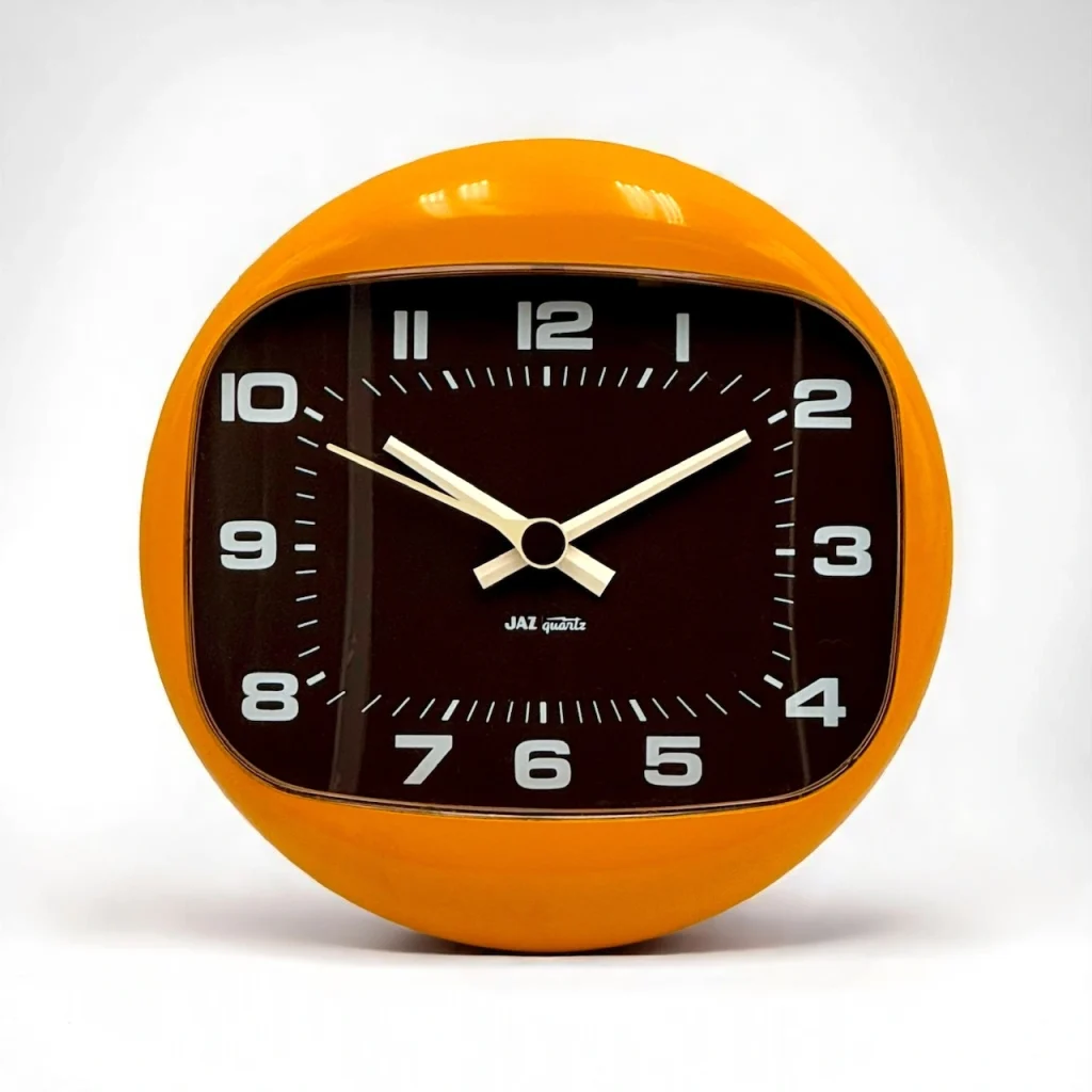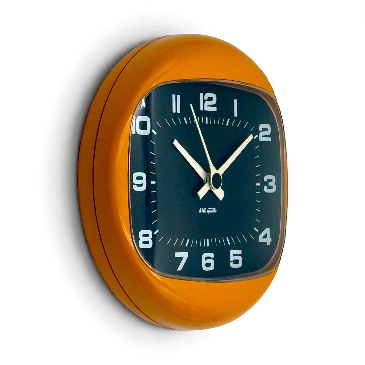 Vintage 70s space age wall clock by JAZ. Bold mustard and black design, German quartz, futuristic curves. Excellent condition, rare collectible.