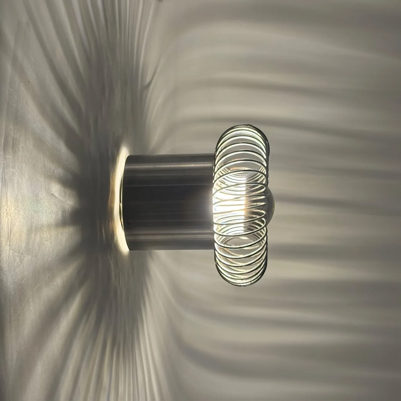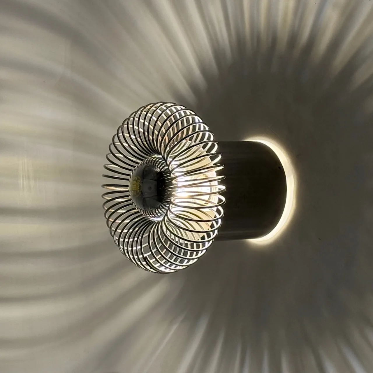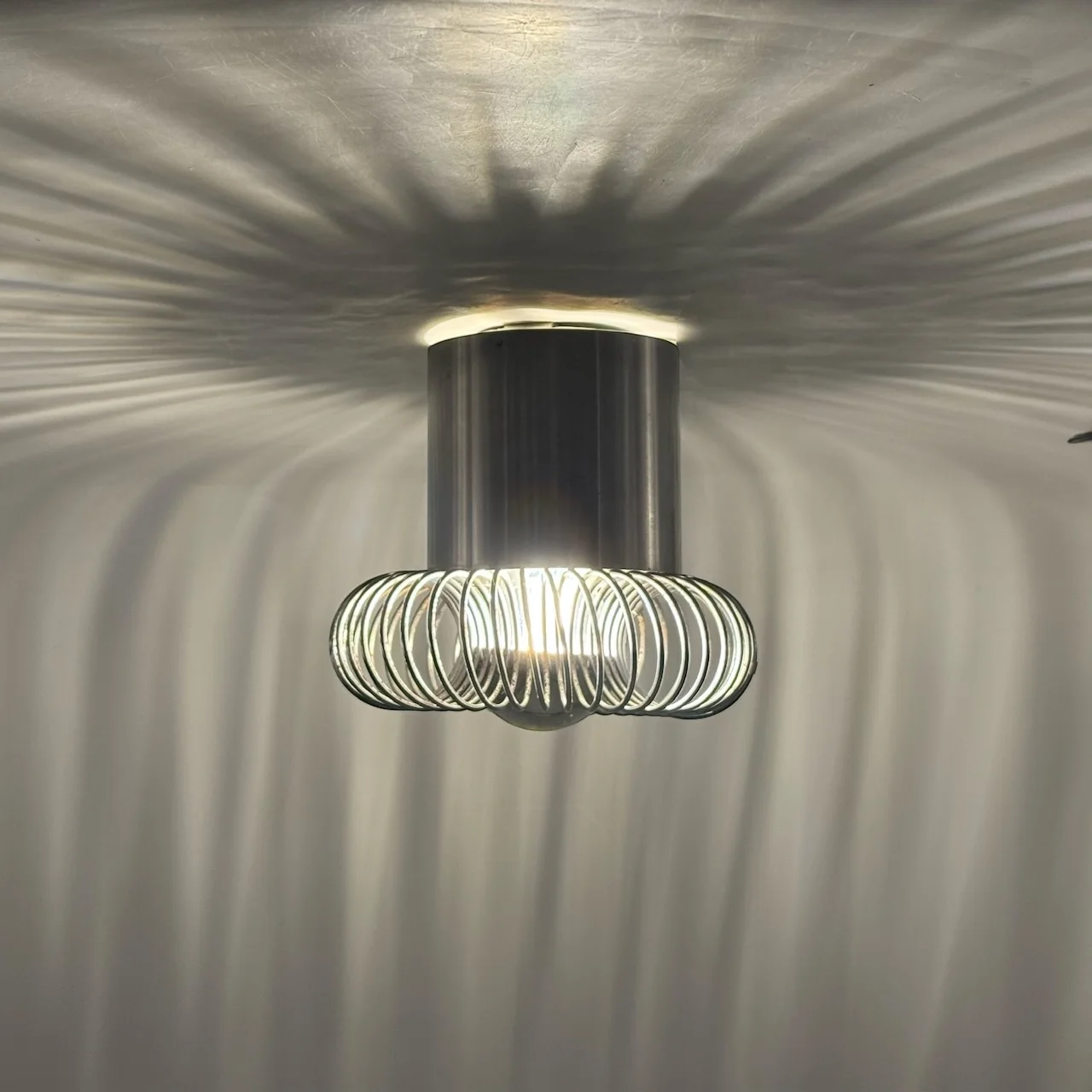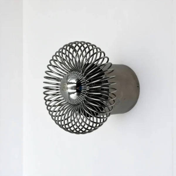Its cylindrical metal base supports a chromed spiral diffuser finished with a reflective central cap. When illuminated, the spiral construction produces a dramatic radial light pattern that expands across the wall, transforming the surrounding surface into part of the composition. The lamp is lucid and clean, with visible but discreet signs of age, including light oxidation inside the spiral and minor marks on the metal support consistent with time.