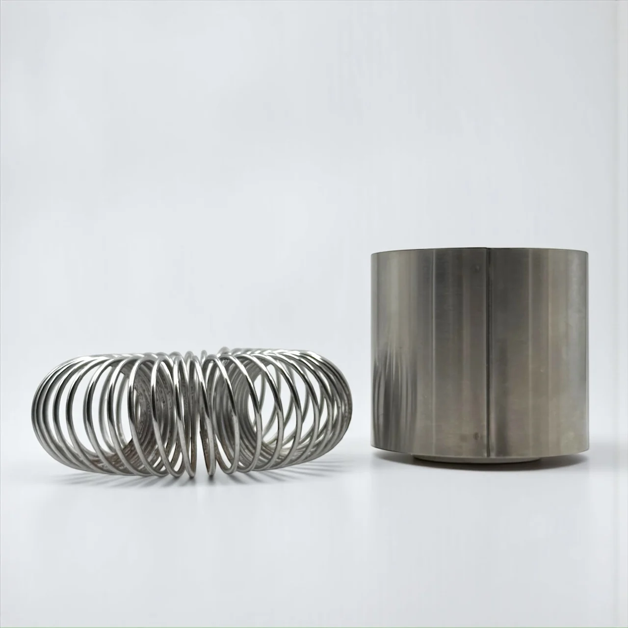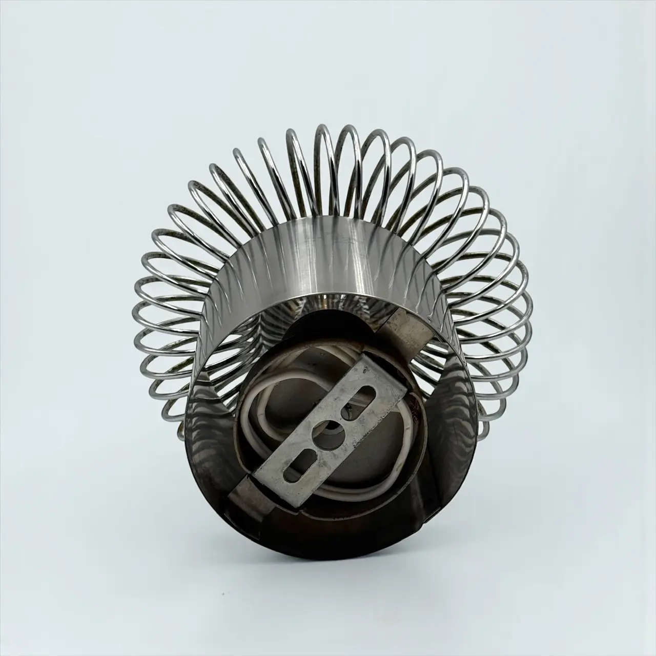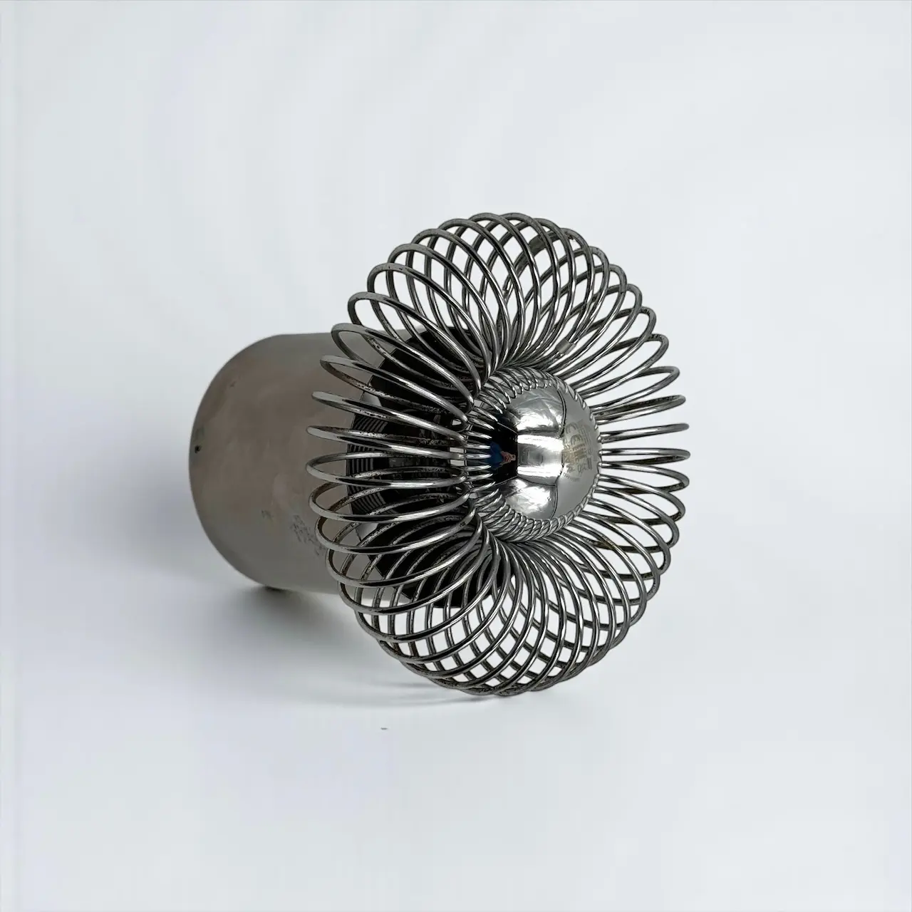 Its cylindrical metal base supports a chromed spiral diffuser finished with a reflective central cap. When illuminated, the spiral construction produces a dramatic radial light pattern that expands across the wall, transforming the surrounding surface into part of the composition. The lamp is lucid and clean, with visible but discreet signs of age, including light oxidation inside the spiral and minor marks on the metal support consistent with time.
