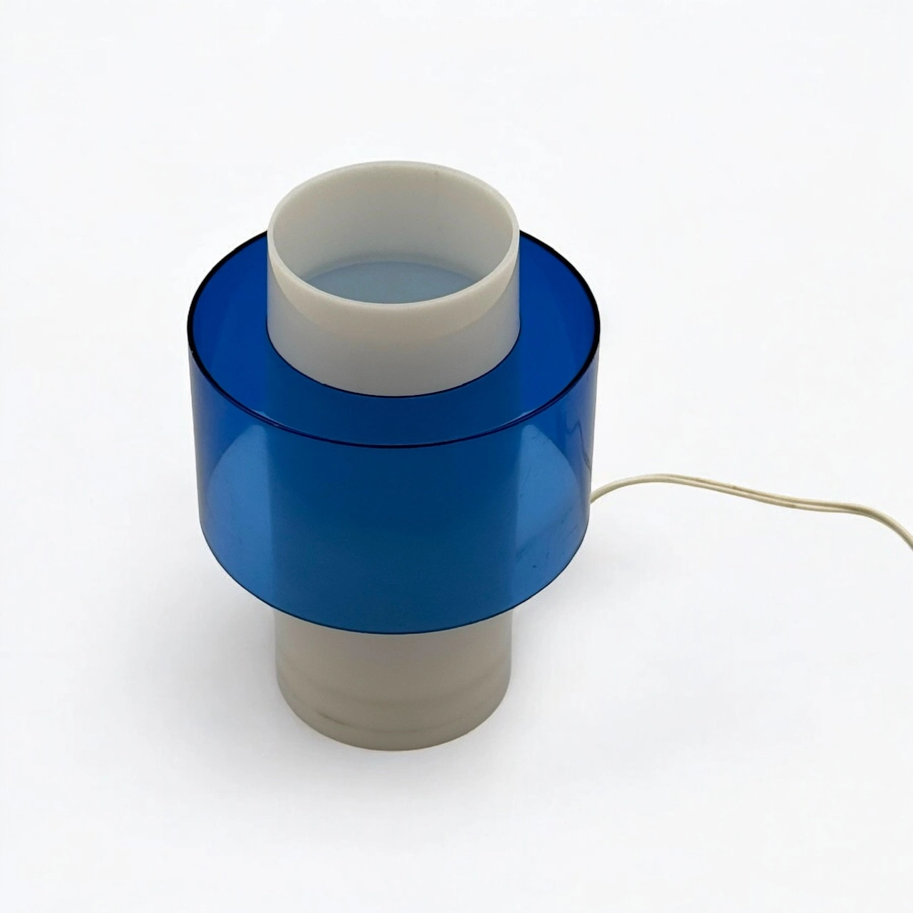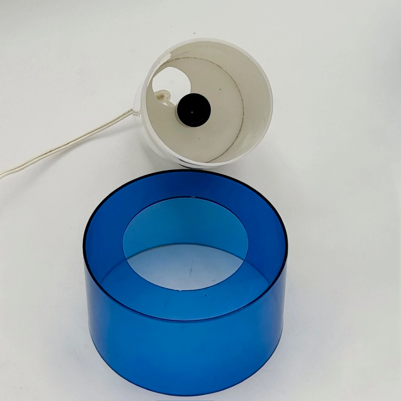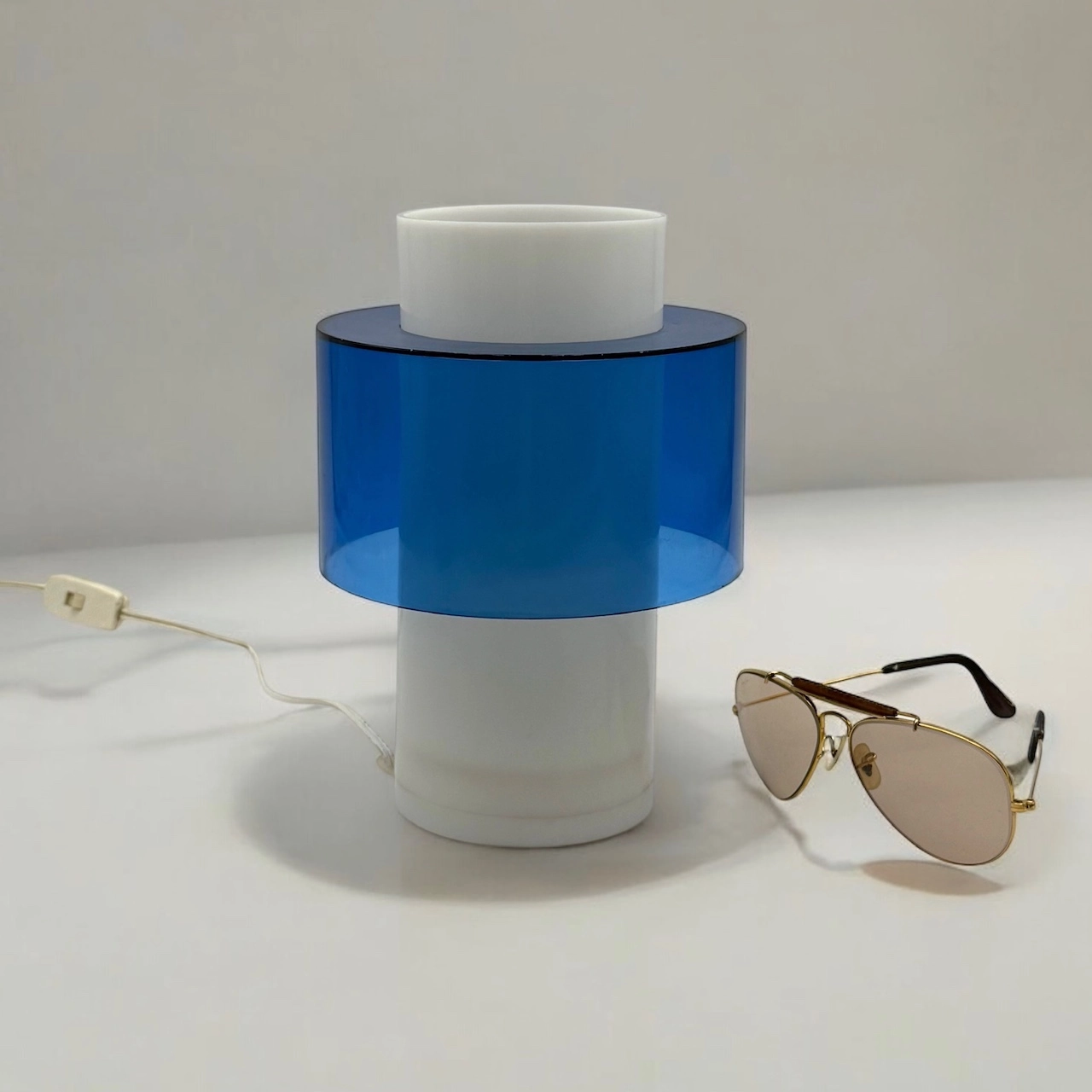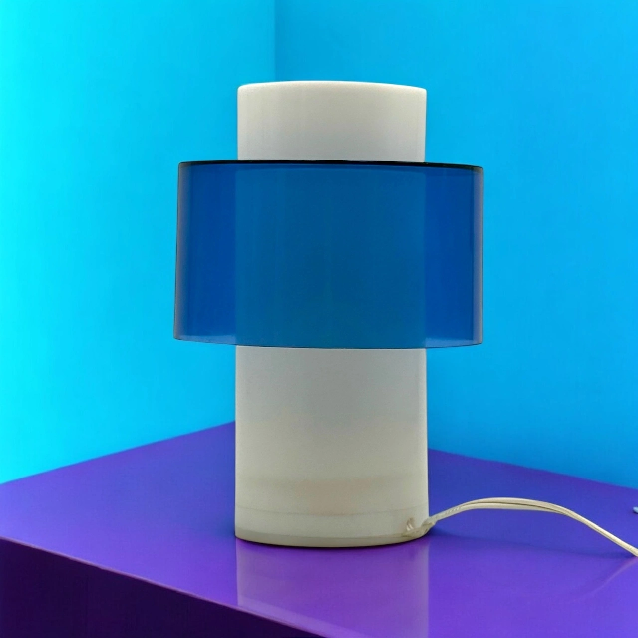 Original Scandinavian 70s lamp in acrylic with blue detail. Clean design, warm glow—perfect for bedside or ambient lighting with a vintage modern feel.