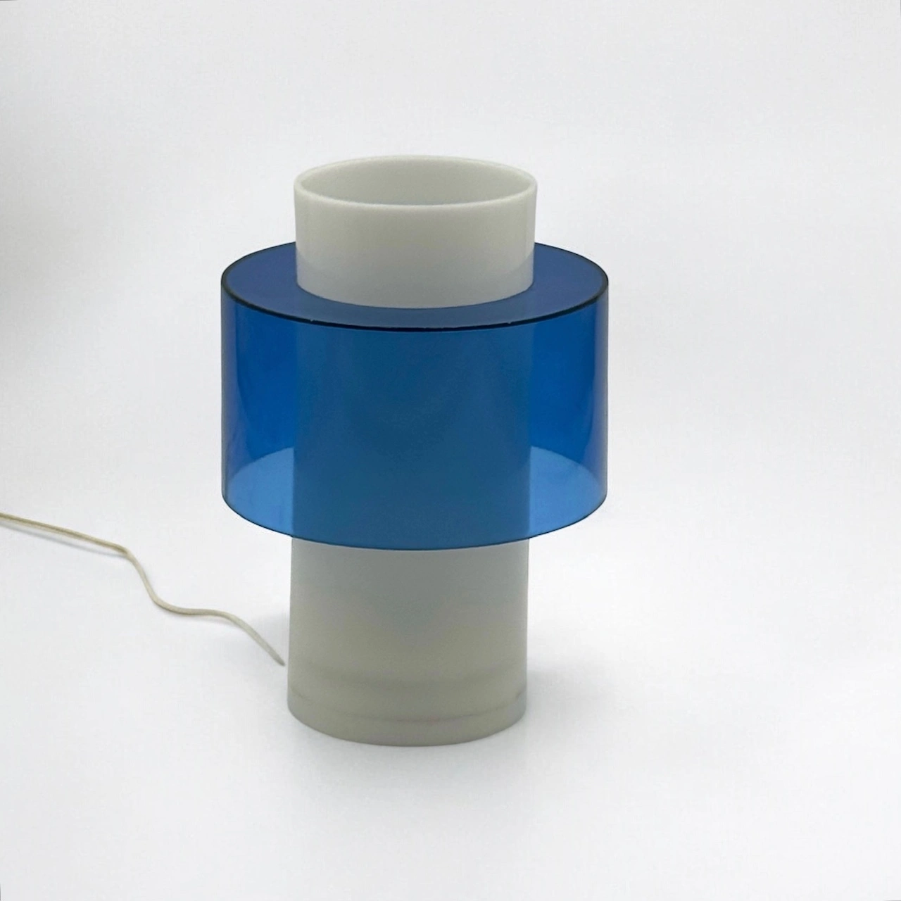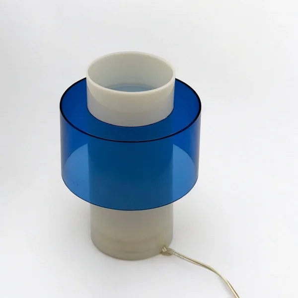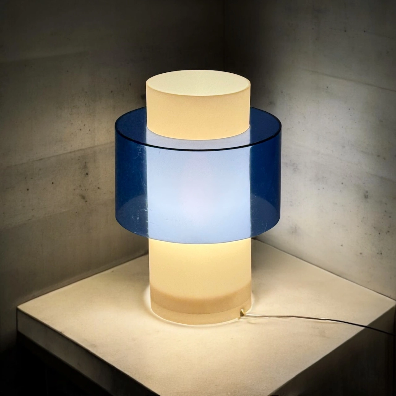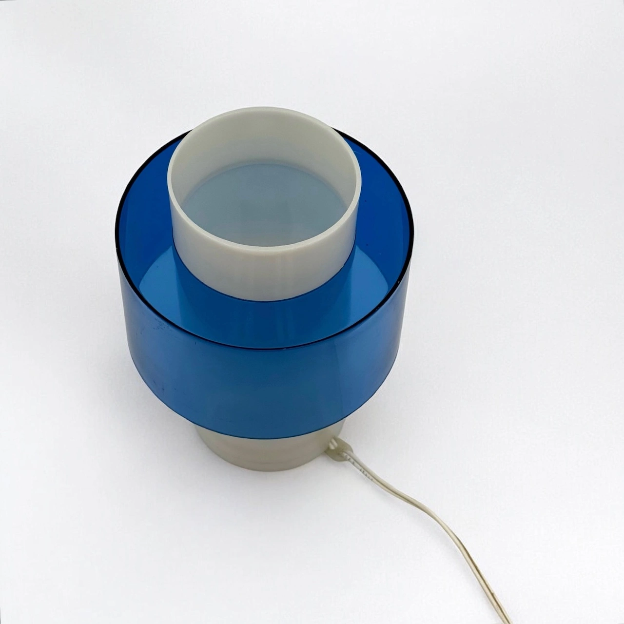 Original Scandinavian 70s lamp in acrylic with blue detail. Clean design, warm glow—perfect for bedside or ambient lighting with a vintage modern feel.