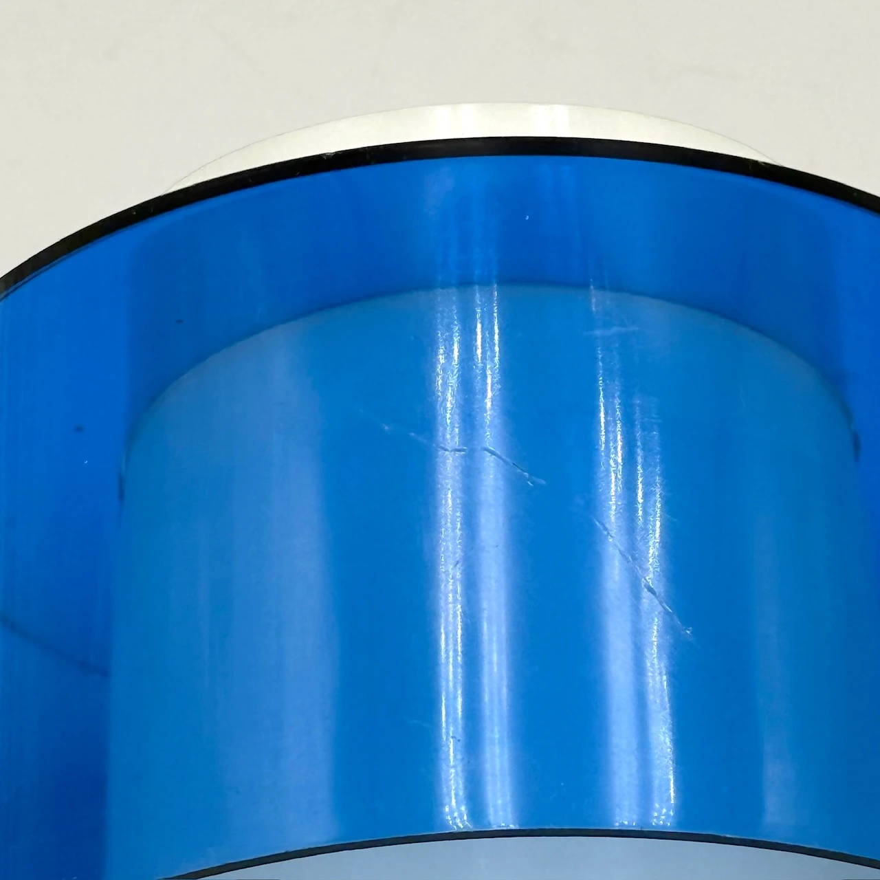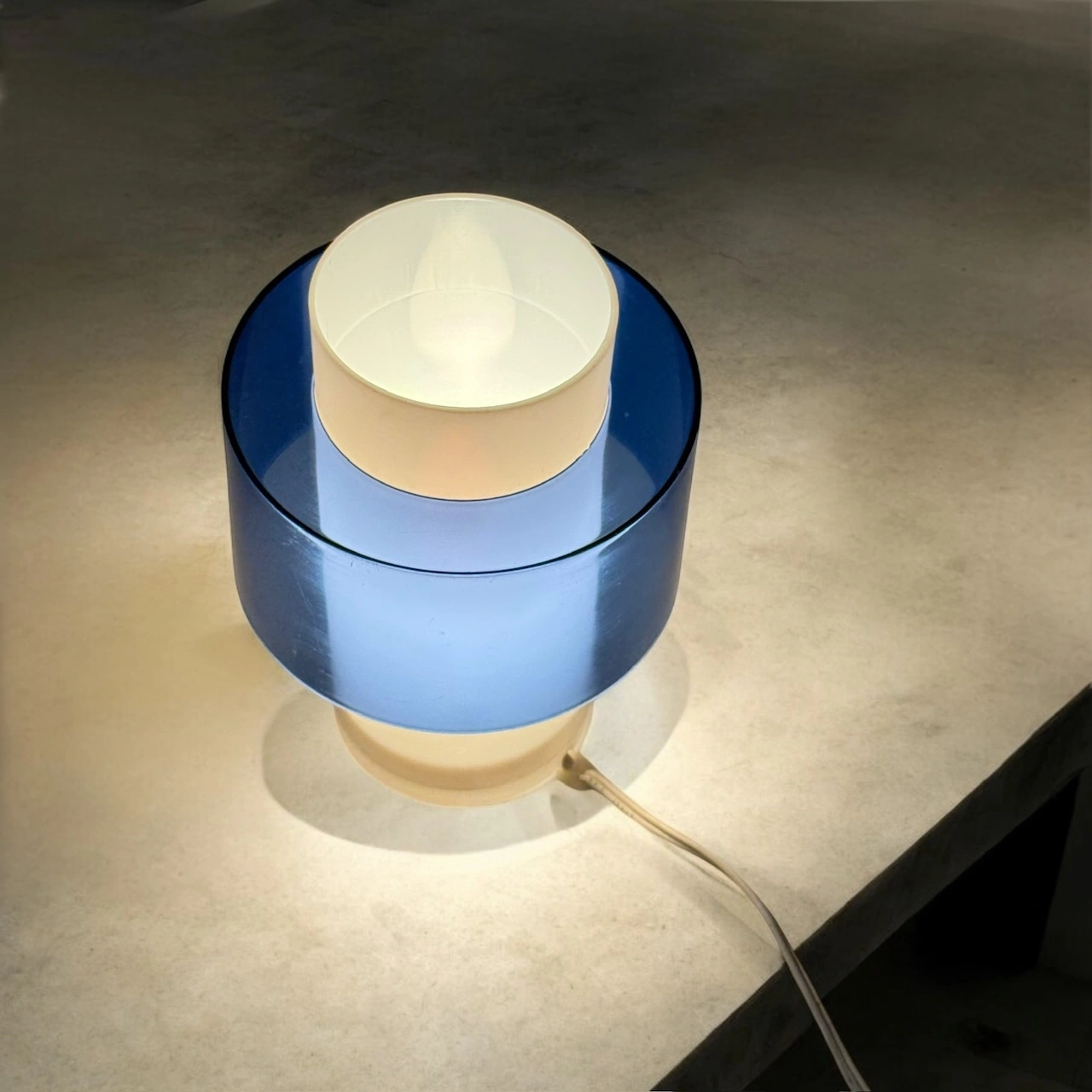A glowing tribute to minimalist Nordic style: this Scandinavian 70s lamp captures the essence of clean design and atmospheric light. The structure combines a matte white acrylic cylinder with a striking translucent blue insert, creating a soft yet vivid lighting effect.