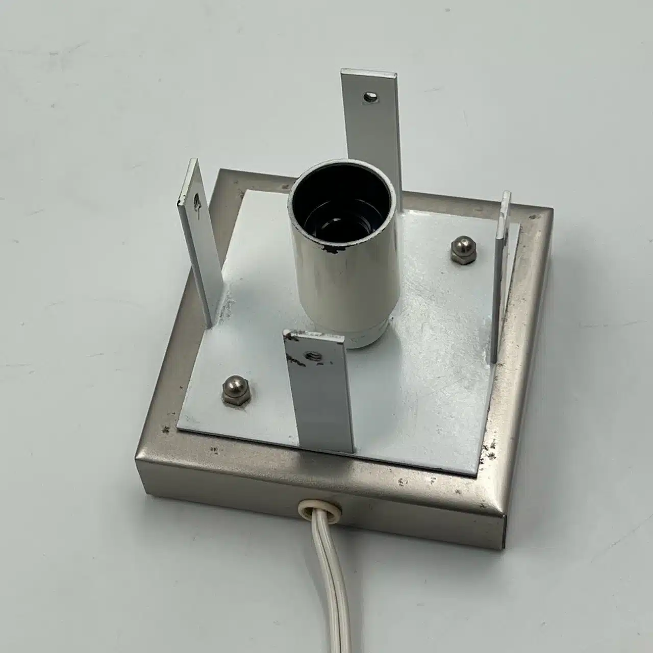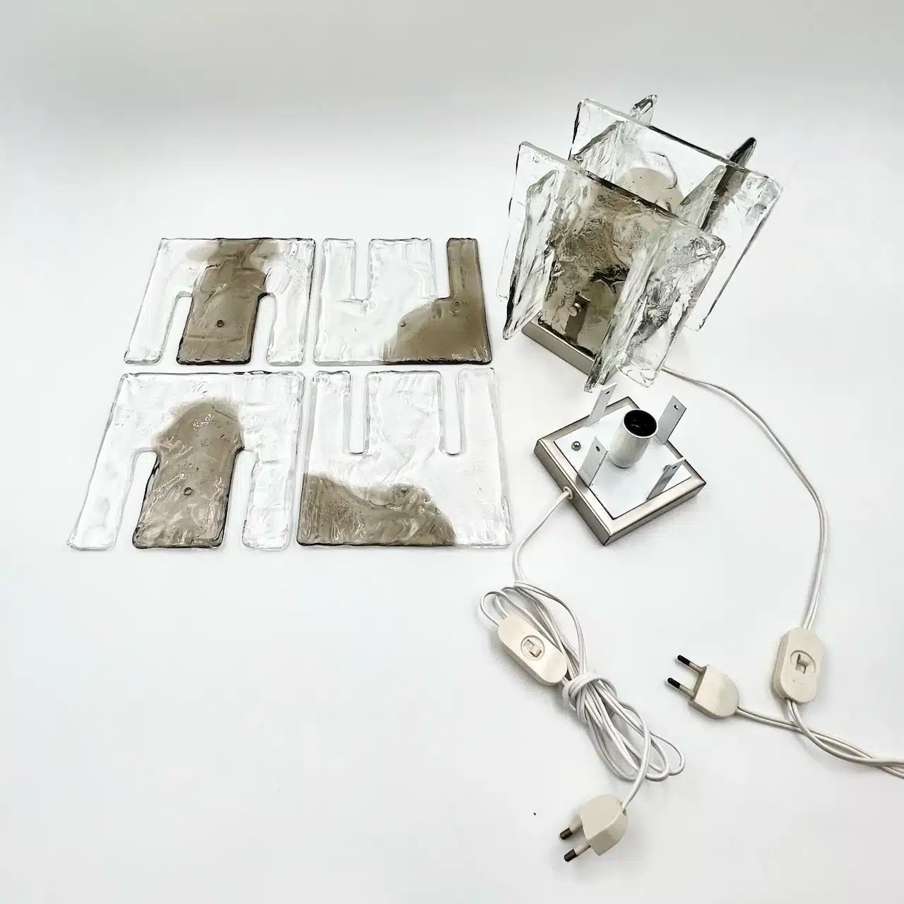 item. table lampsmodel. LT 361designer. carlo nasonmaker. mazzegaperiod. 1970scountry. Italymaterial. ice-like murano glass, metalcolor. brown, clear, chrome silverdimensions (cm). 17.5 x 17.5 x 20 Hcondition. new old stock, never used. excellent vintage conditions, with healthy glass and minor traces of oxidation of the metallic base and the bulb holder.art. no. 1549