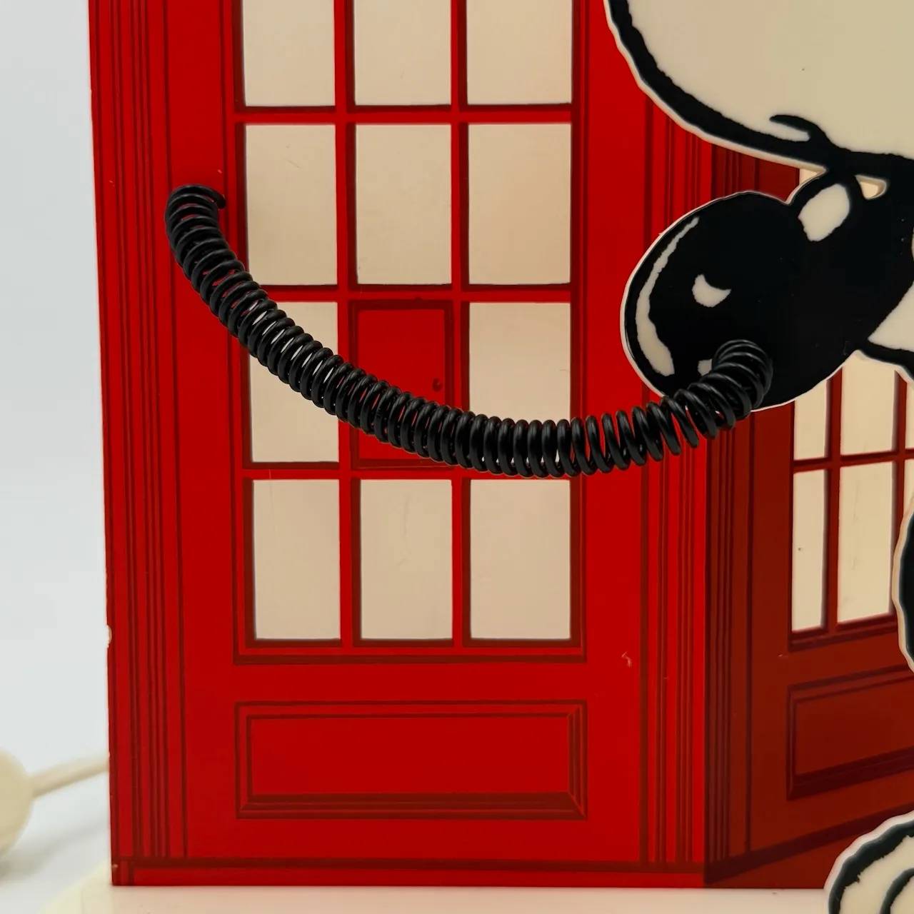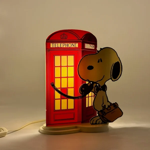 The design features Snoopy standing beside a stylized British red telephone booth, reinterpreted as a luminous architectural element. When lit, the translucent red structure emits a warm, diffused glow that enhances the silhouette of the character and transforms the piece from a simple object into an atmospheric presence.