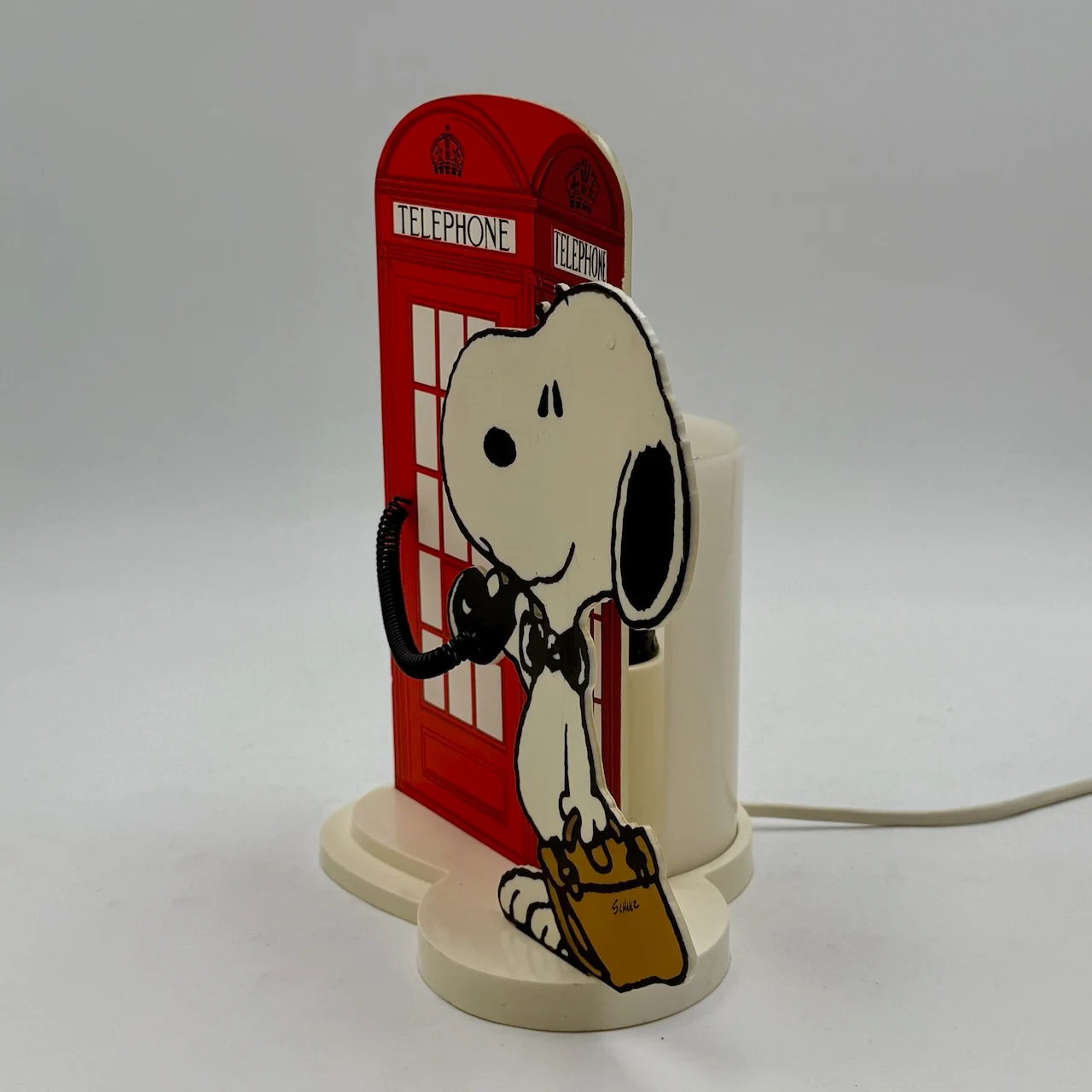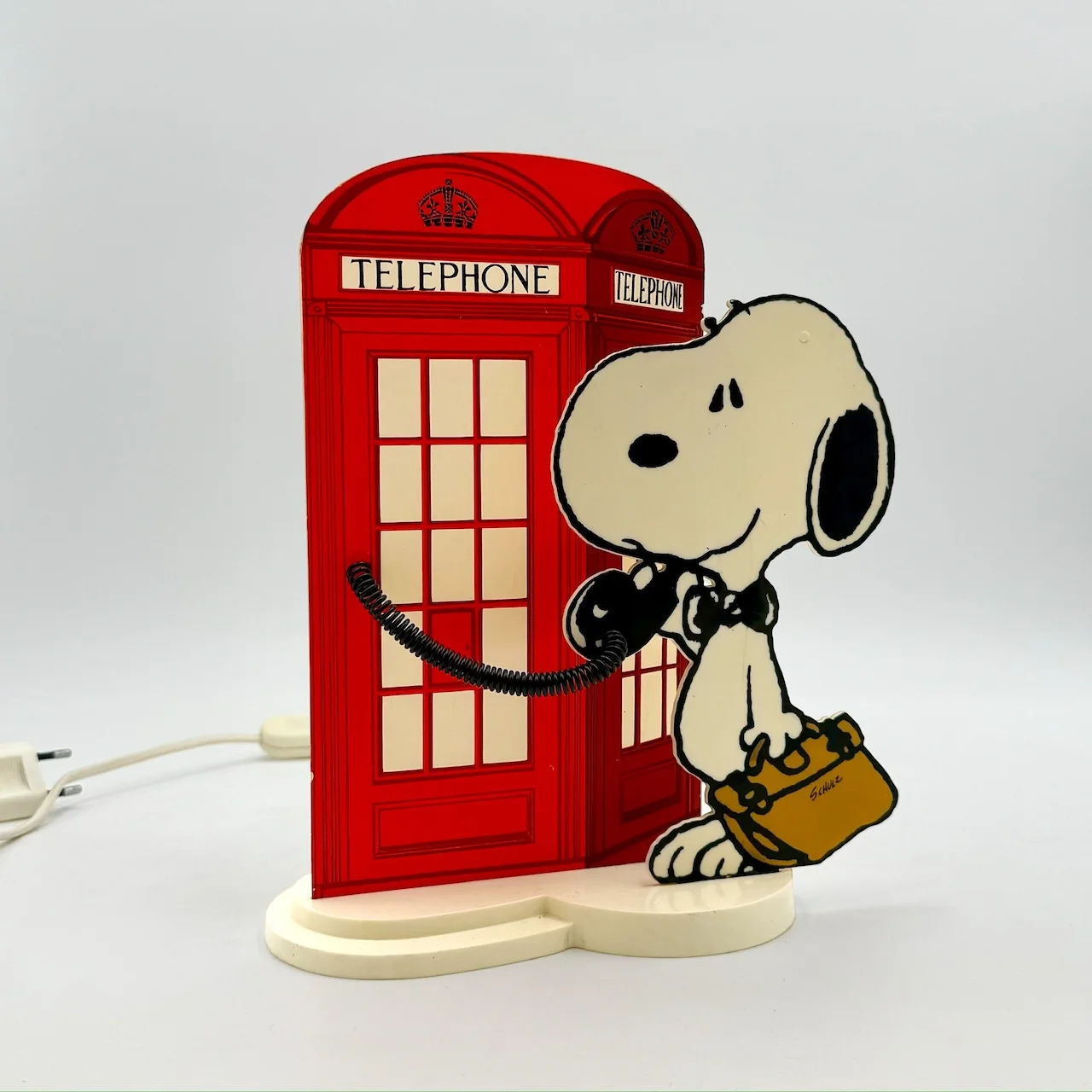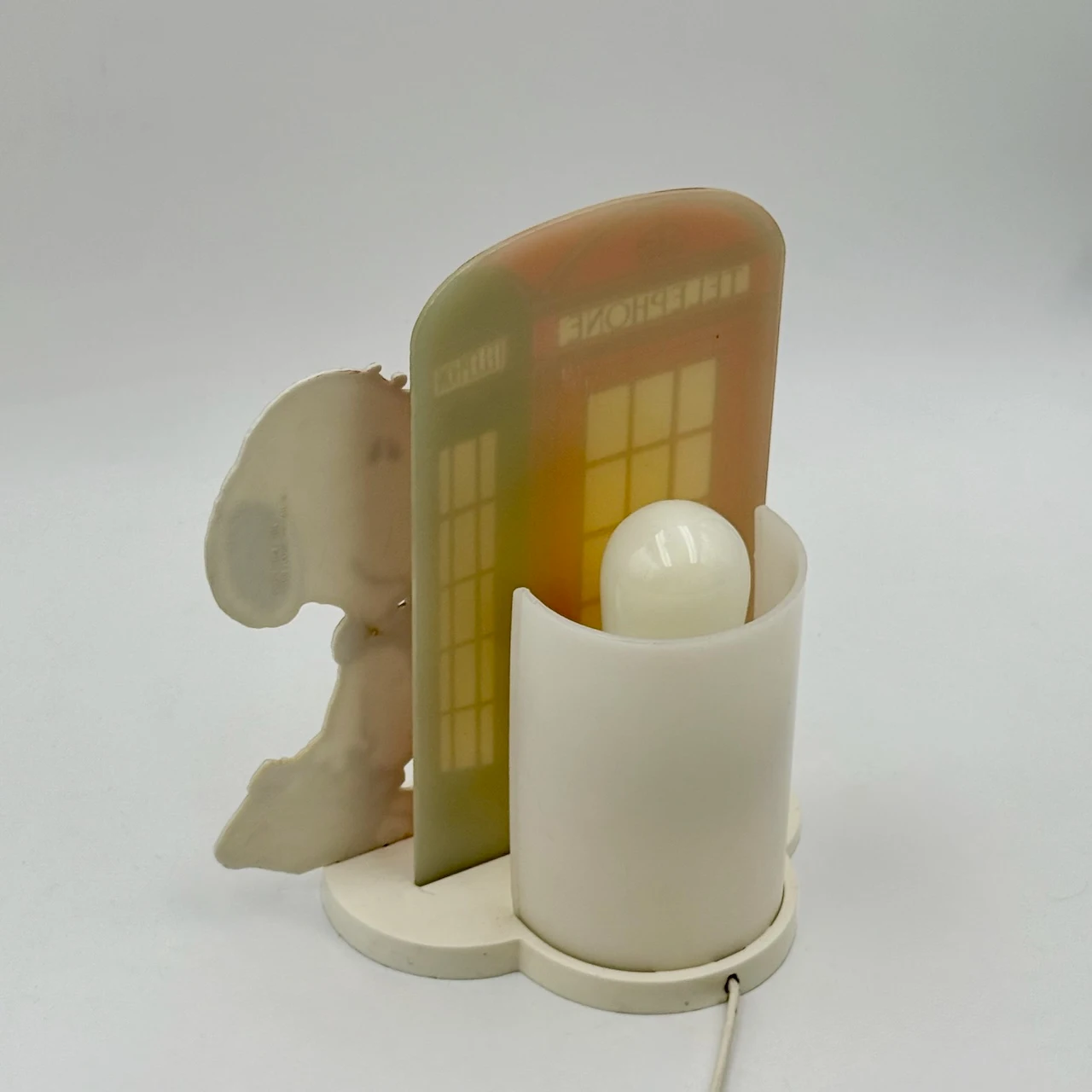What defines this lamp is its strong visual clarity: the contrast between the flat, graphic outline of Snoopy and the bold geometric volume of the telephone booth creates a composition that feels both illustrative and spatial. The use of molded plastic, combined with saturated color, places the piece firmly within the language of late 20th-century decorative design.
