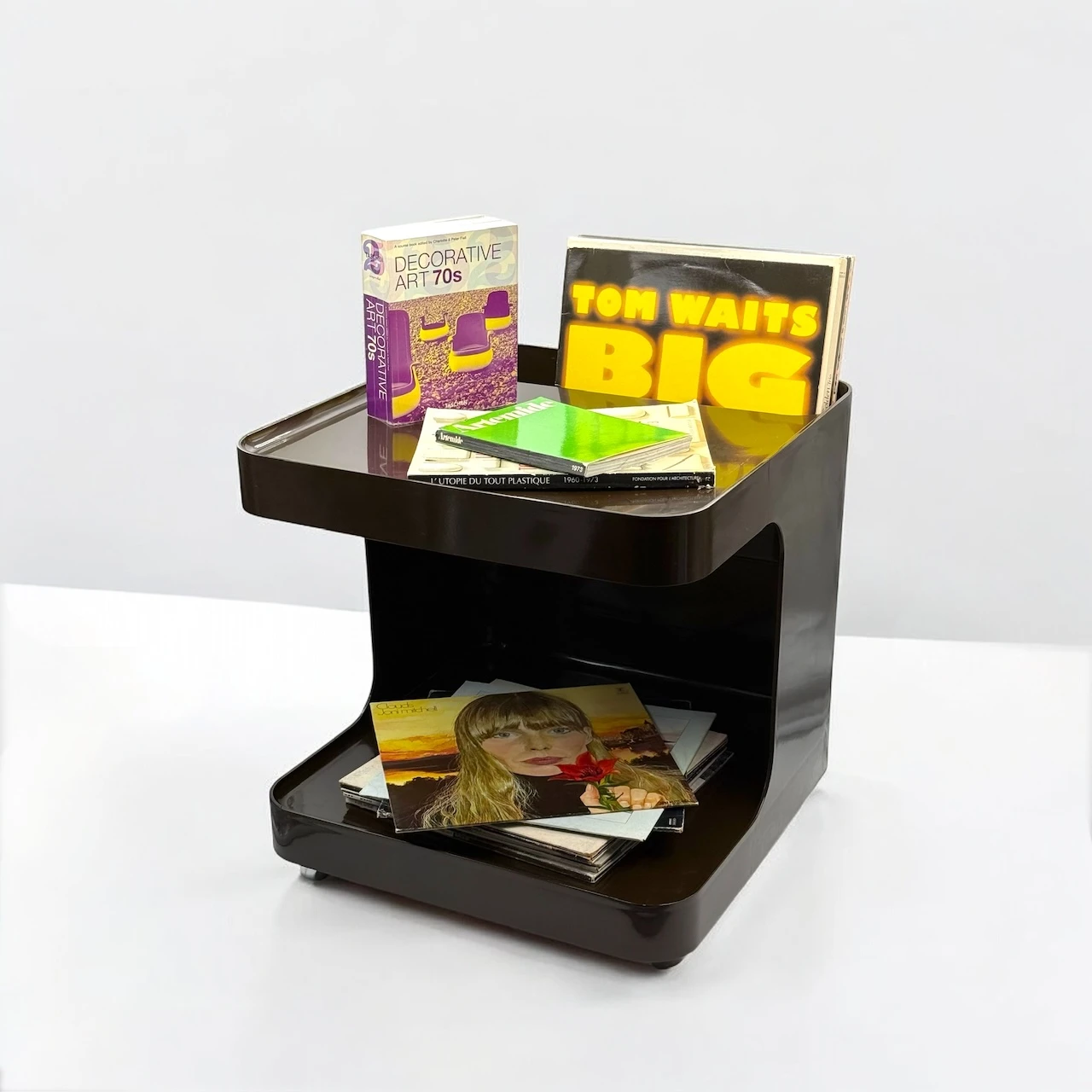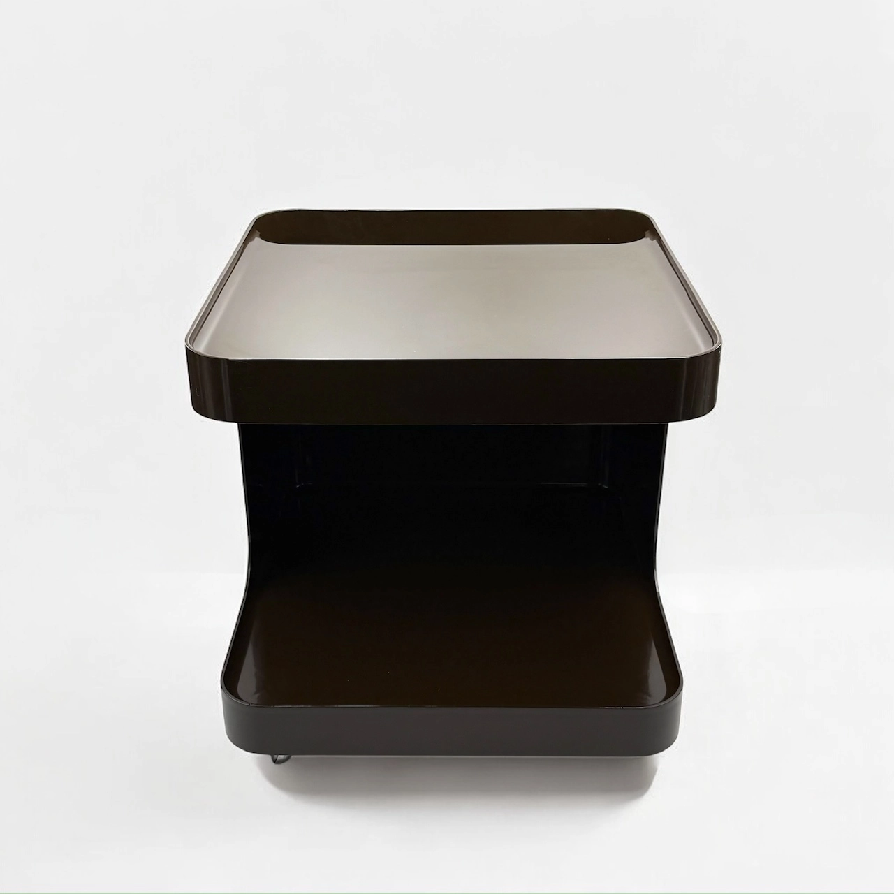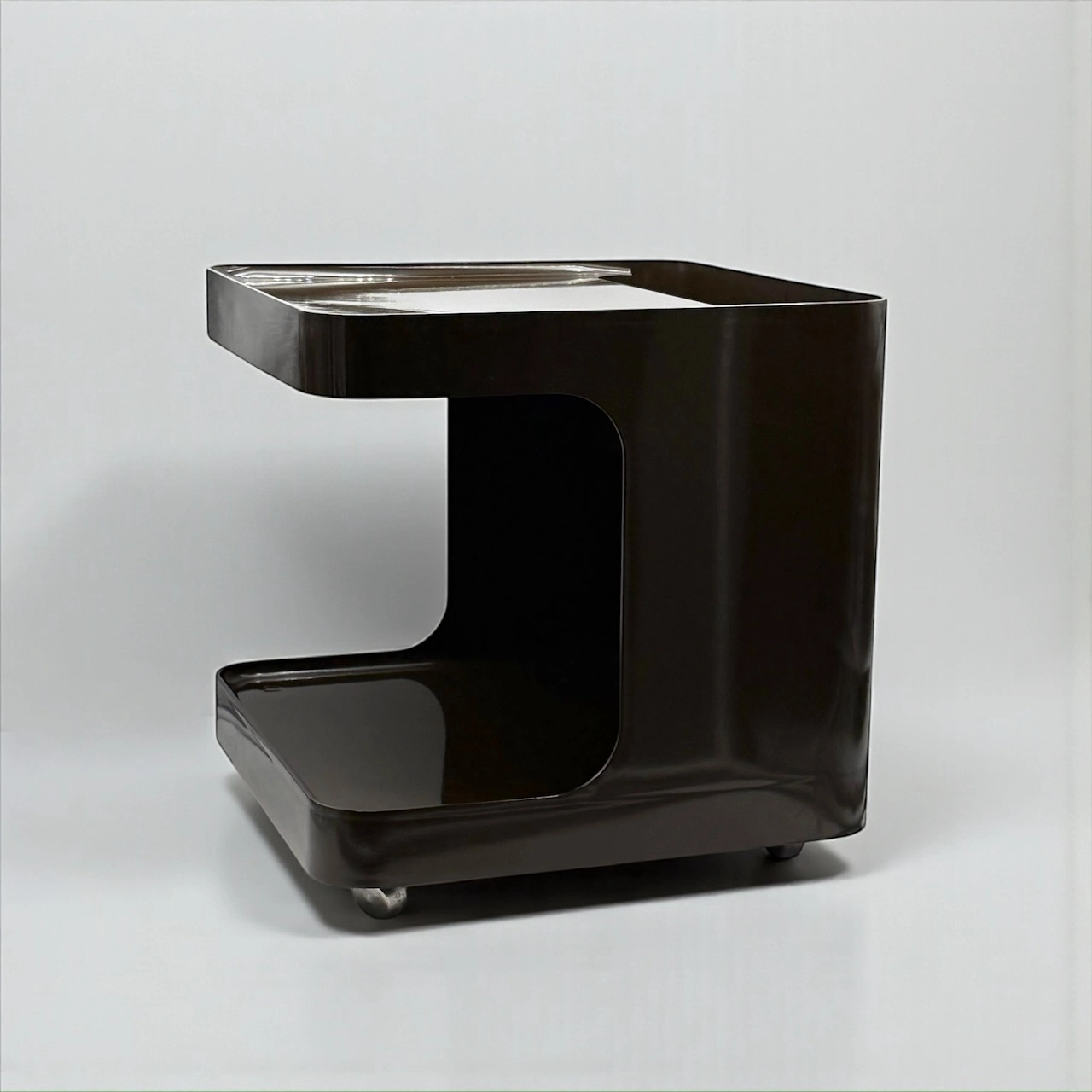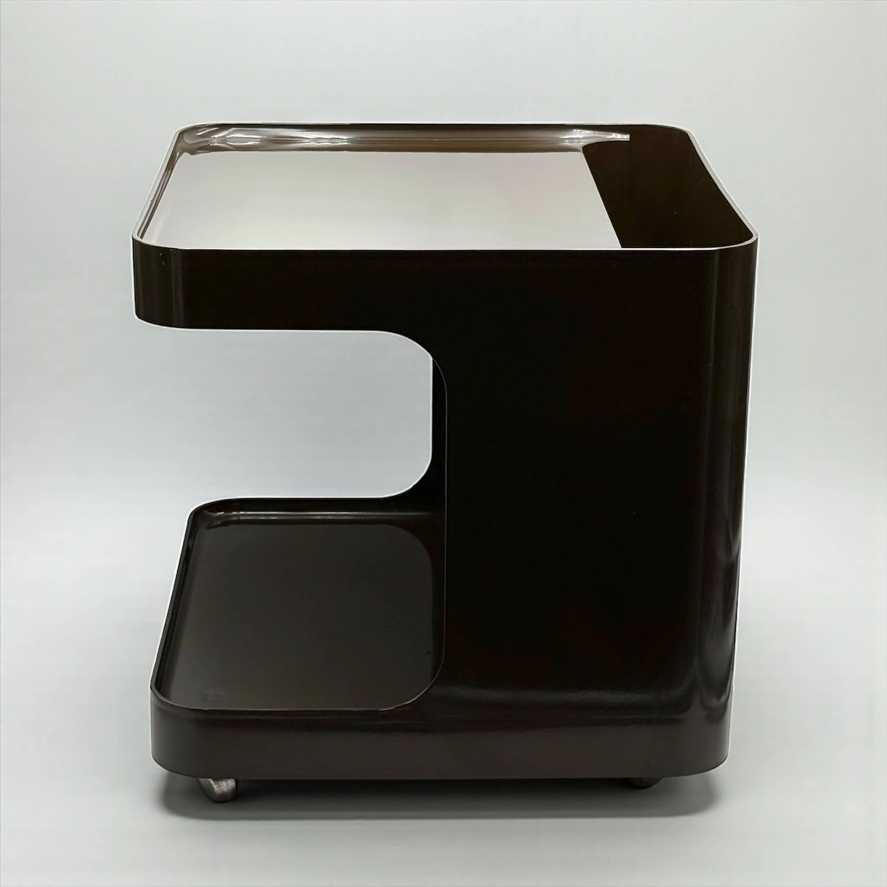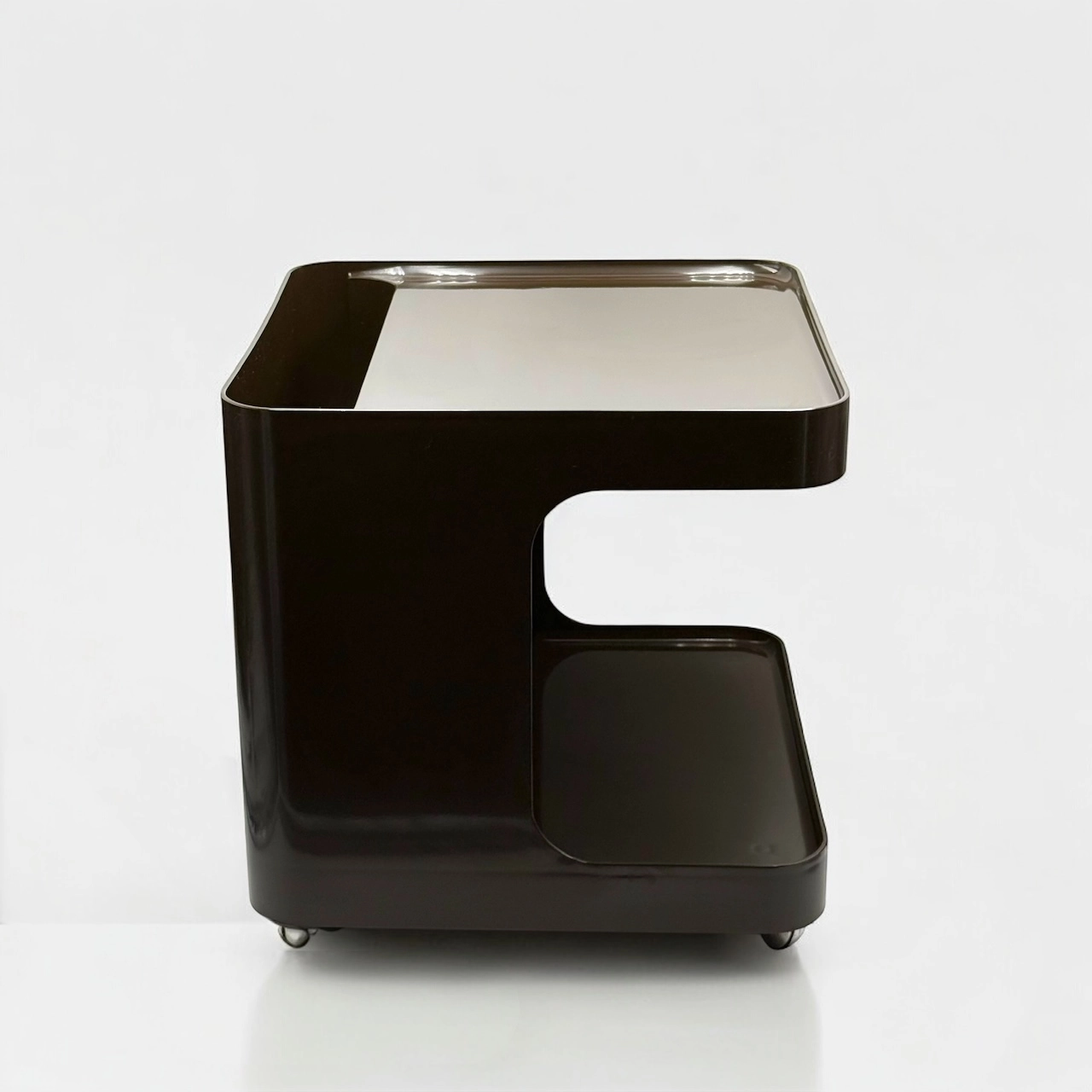 Rare brown 1970s Space Age bar cart from the GAME series by Marcello Siard for Longato. Made in glossy Novodur resin with sculptural lines and hidden wheels — a striking Italian design icon of the Space Age era.