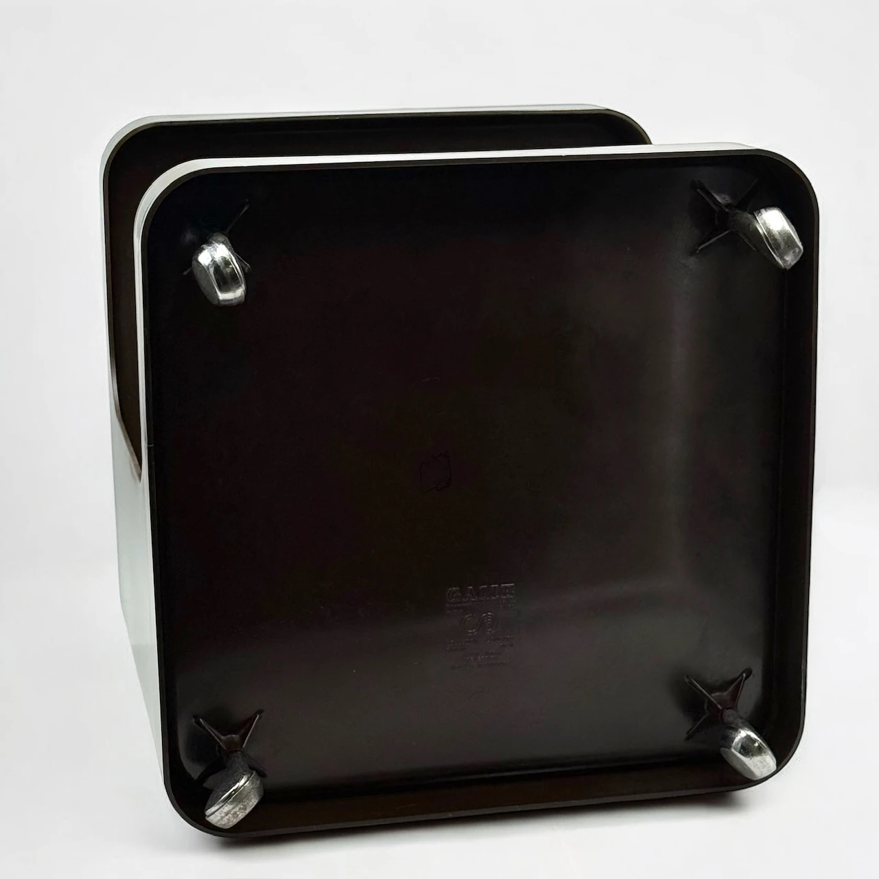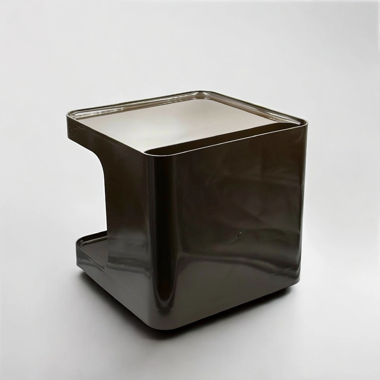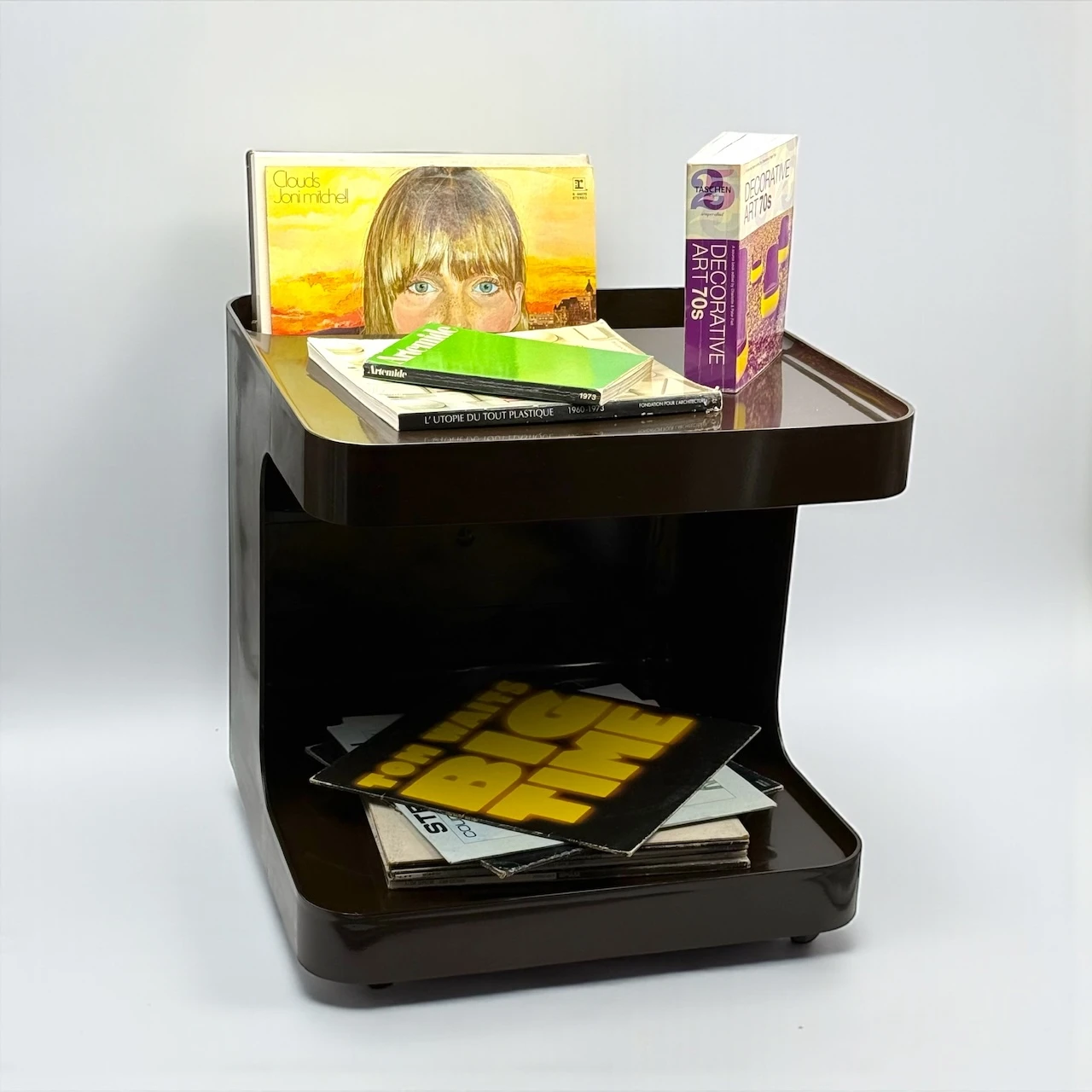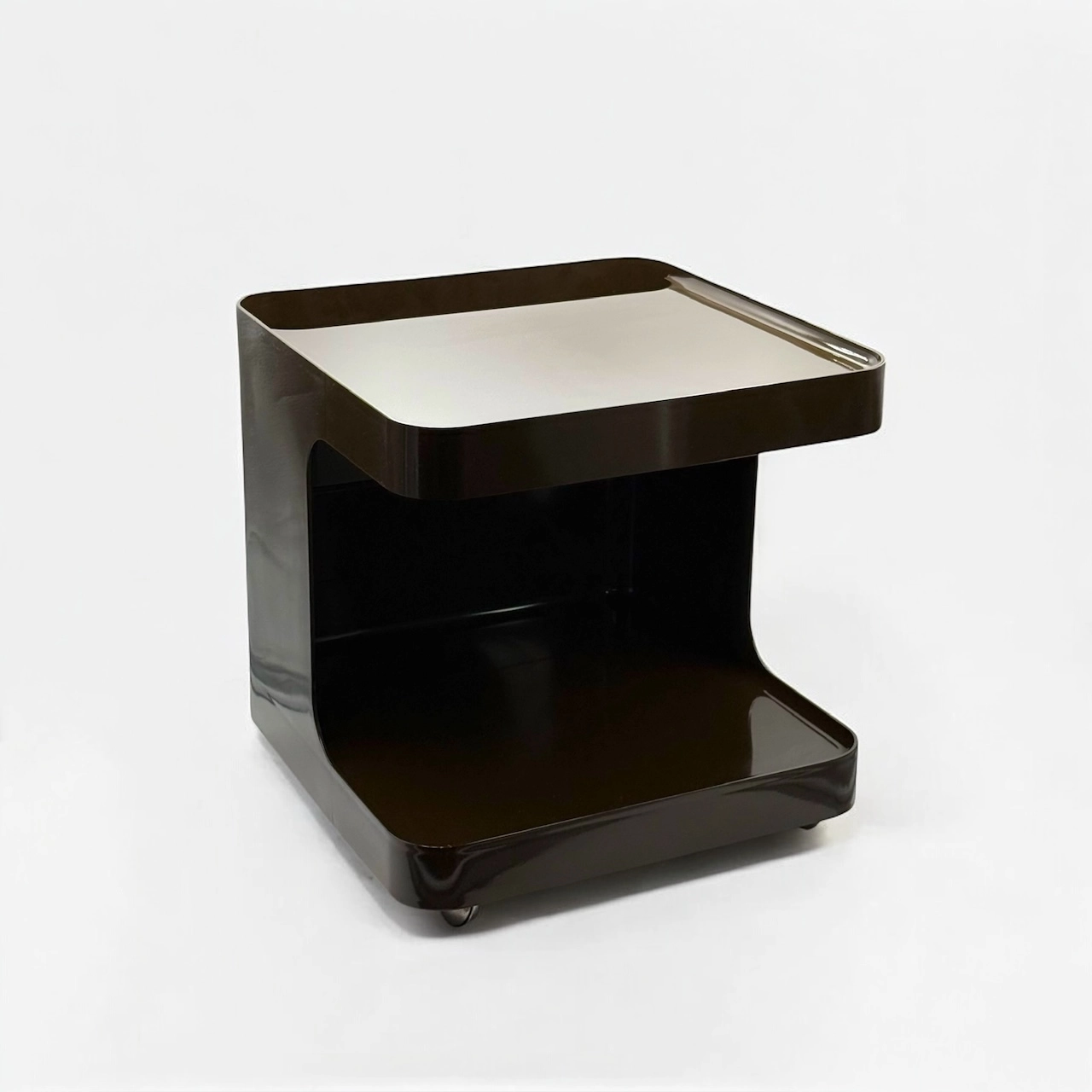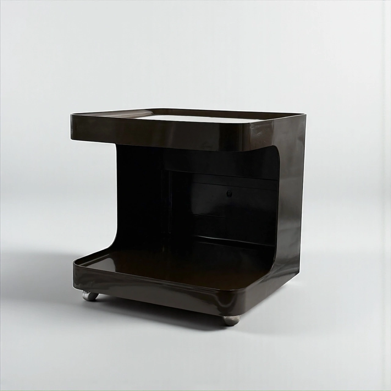 Rare brown 1970s Space Age bar cart from the GAME series by Marcello Siard for Longato. Made in glossy Novodur resin with sculptural lines and hidden wheels — a striking Italian design icon of the Space Age era.