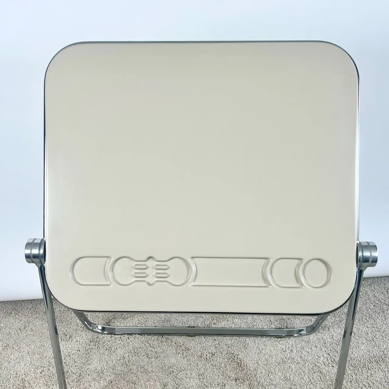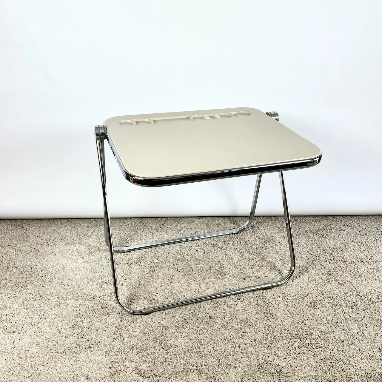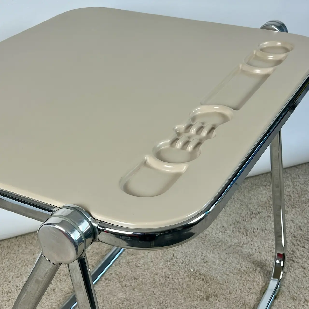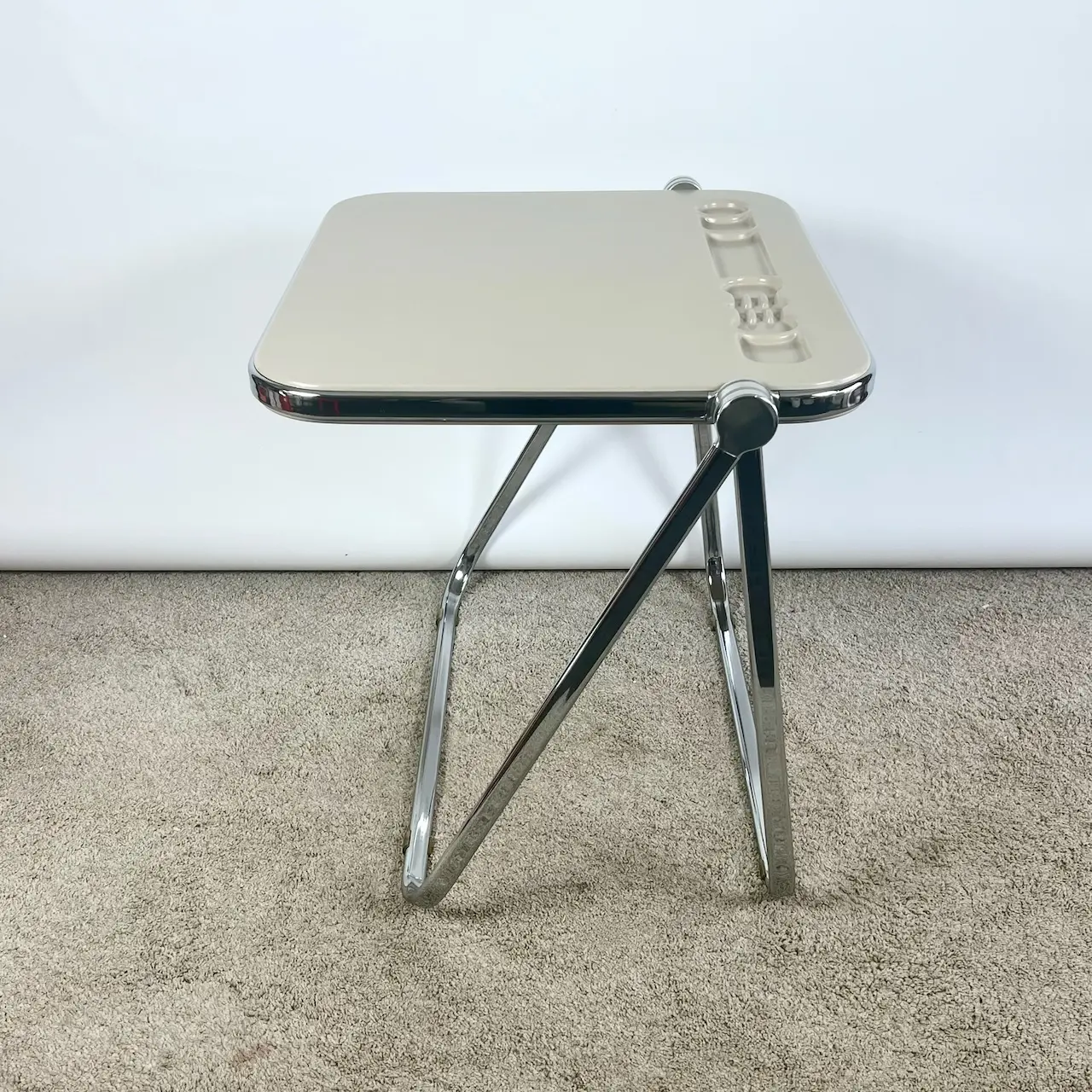item. writing deskdesigner. Giancarlo Pirettimaker. Anonima Castellimodel. Platoneperiod. 1970scountry. Italymaterial. chrome steel, aluminum alloy joints, rigid beige polyurethanecolor. beige, chromed silverdimensions (cm). 82 x 64 x 69.5 Hcondition. excellent condition. The chrome steel frame remains shiny and clean, showing only minor oxidation visible upon close inspection. The beige surface is intact and well-maintained, with some scratches and small stains mostly confined to the underside.