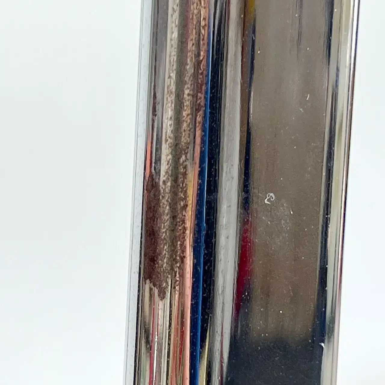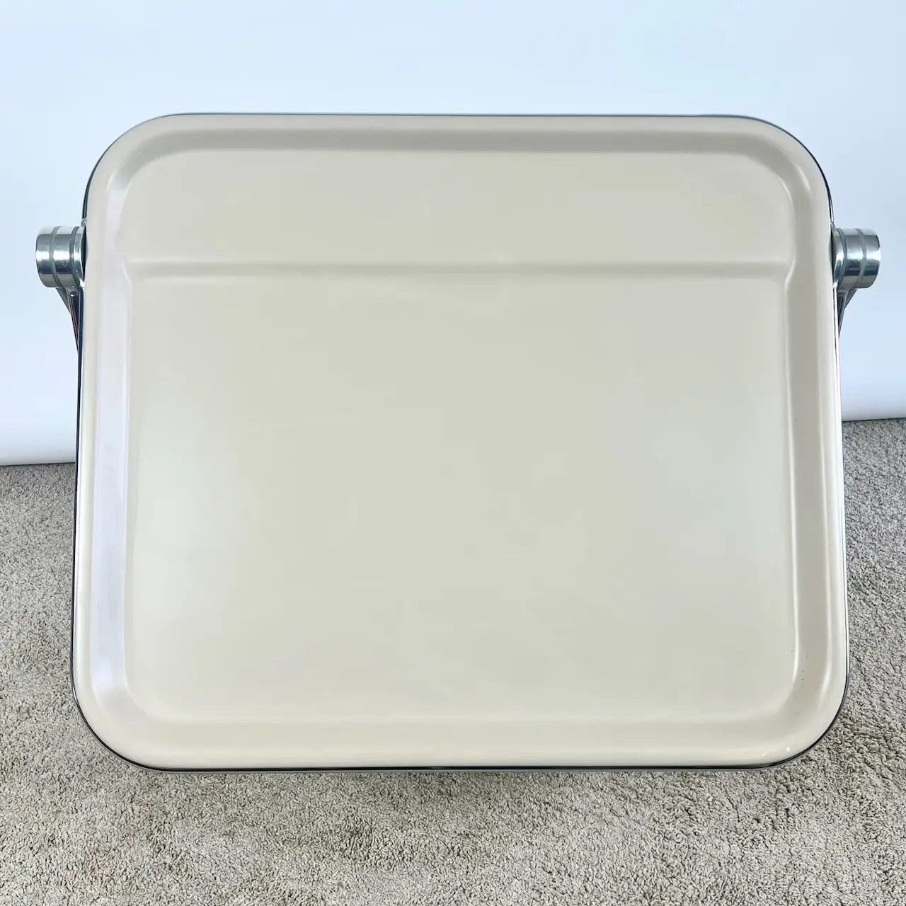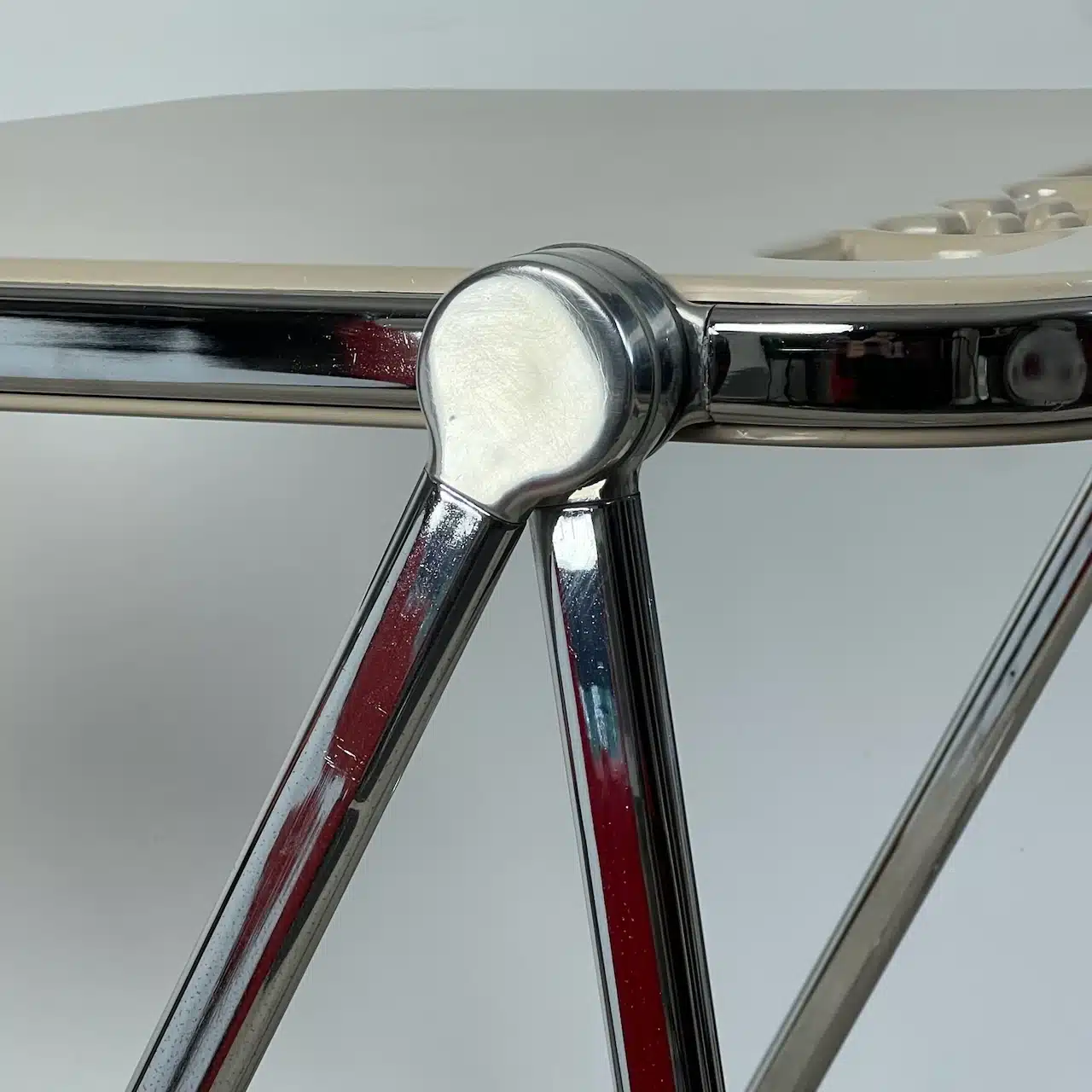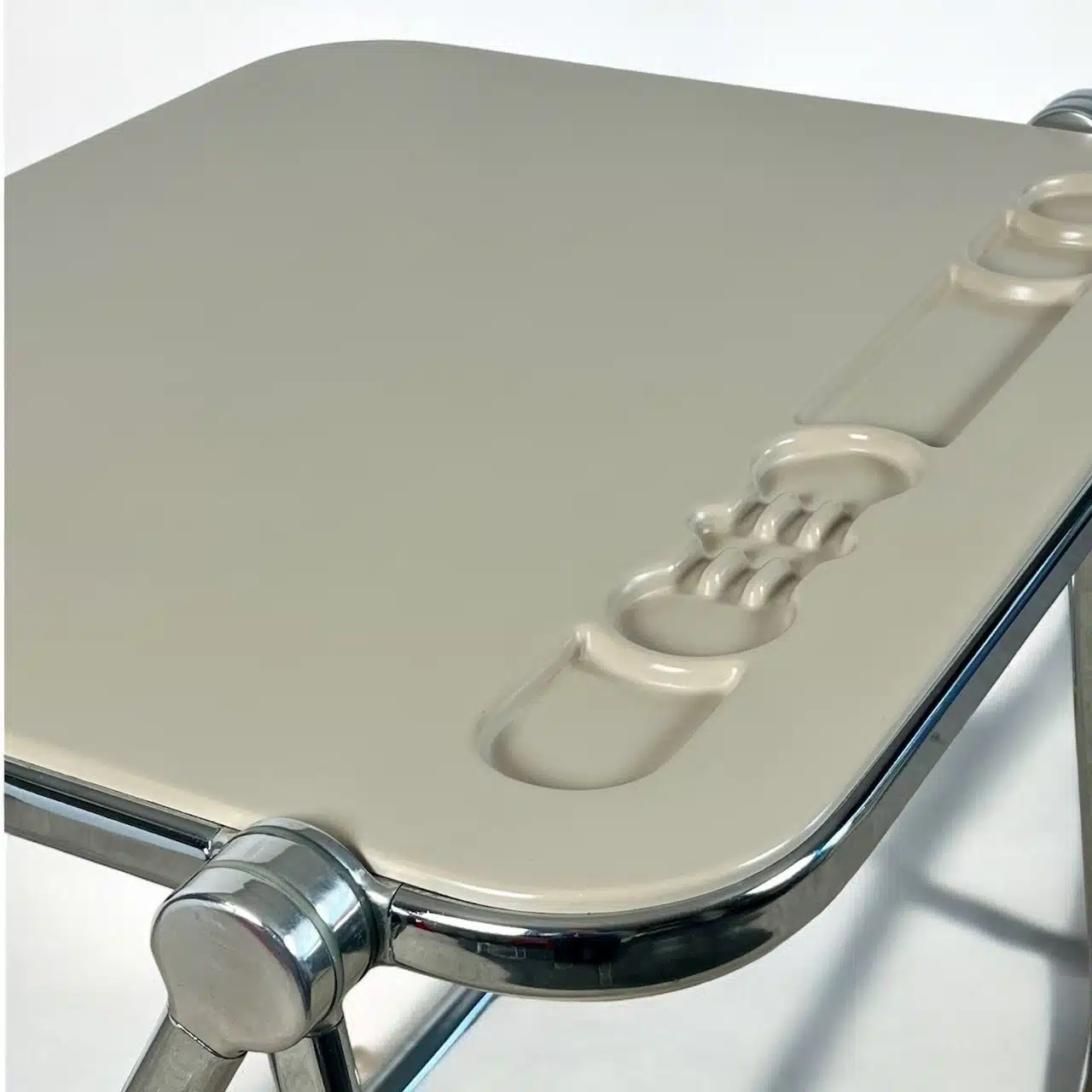 Despite its age, this vintage piece is in excellent condition. The chrome steel frame remains shiny and clean, showing only minor oxidation visible upon close inspection. The beige surface is intact and well-maintained, with some scratches and small stains mostly confined to the underside, adding to its authentic vintage charm without detracting from its overall aesthetic appeal.