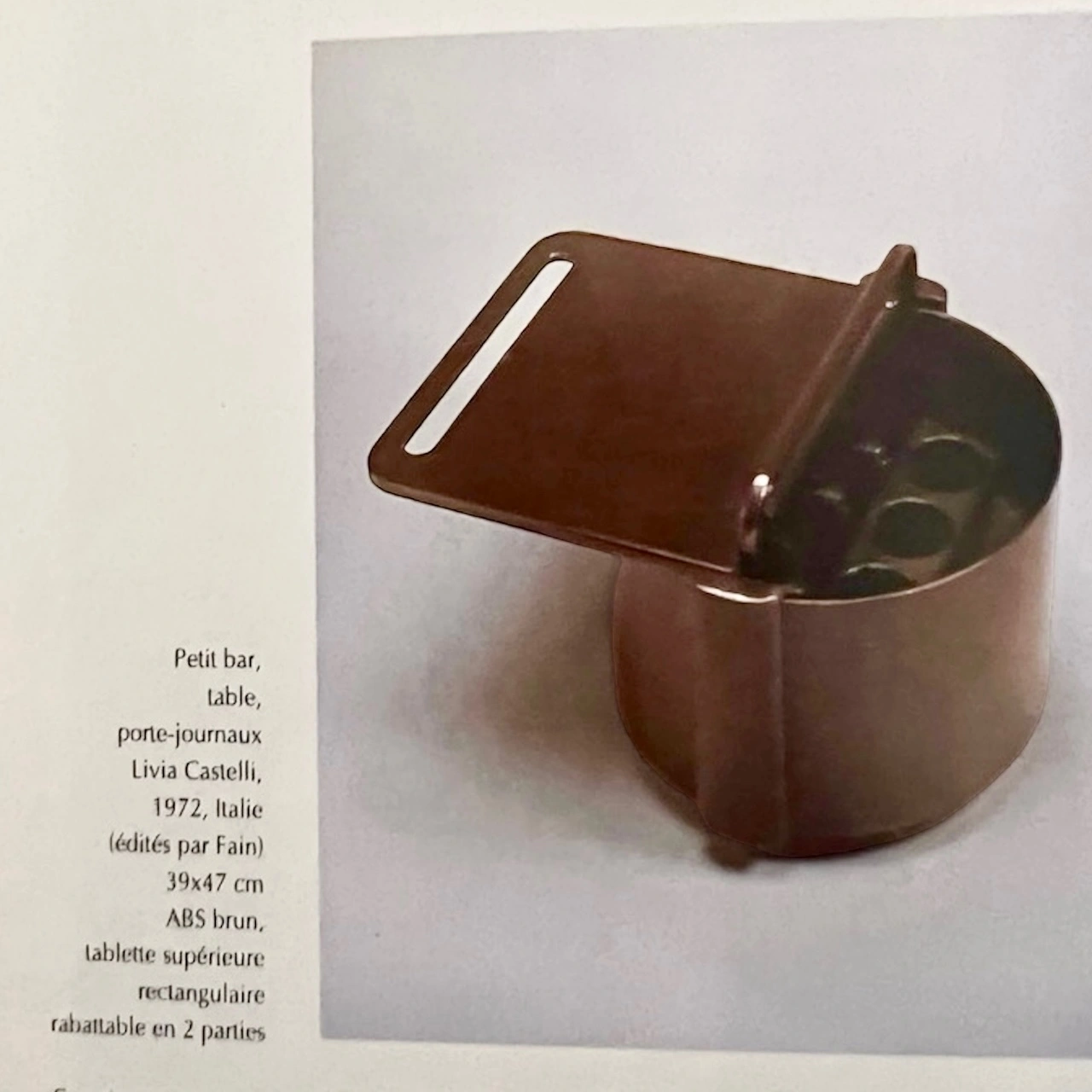 item. mobile bar, coffe table, serving trolleydesigner. Livia Castellimaker. Fainperiod. 1970scountry. Italymaterial. ABScolor. browndimensions (cm). 50 x 50 x 55 – maximum width 86condition. very good vintage conditions with little scuffs and marks consistent with age and use art. no. 1022