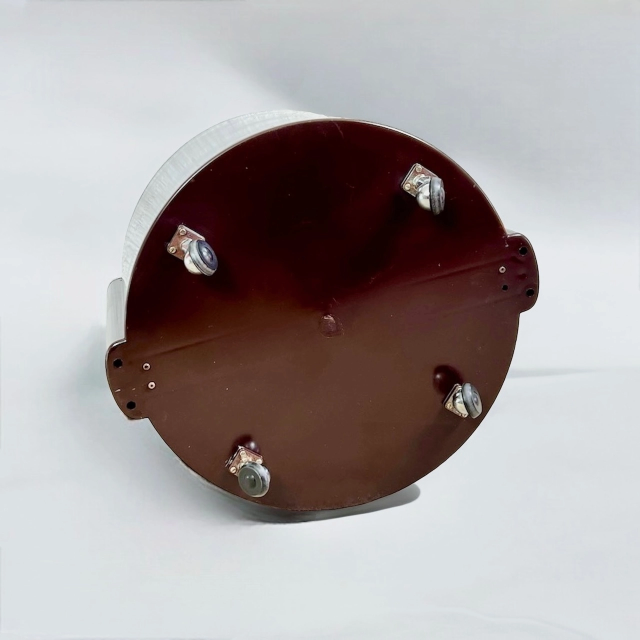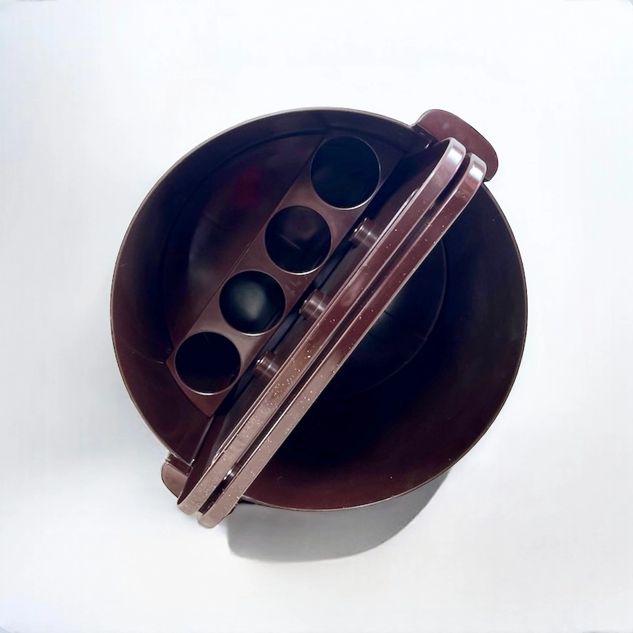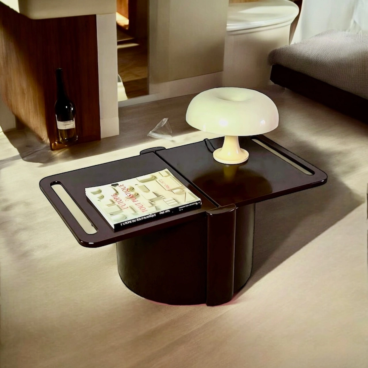 Inside the round body there is a compartment for four bottles and a compartment for magazines.