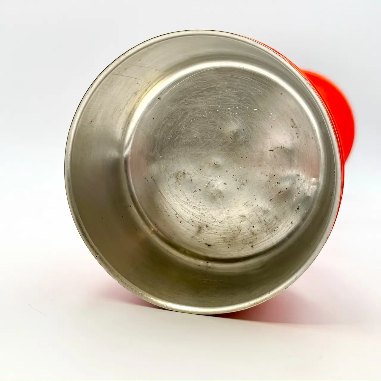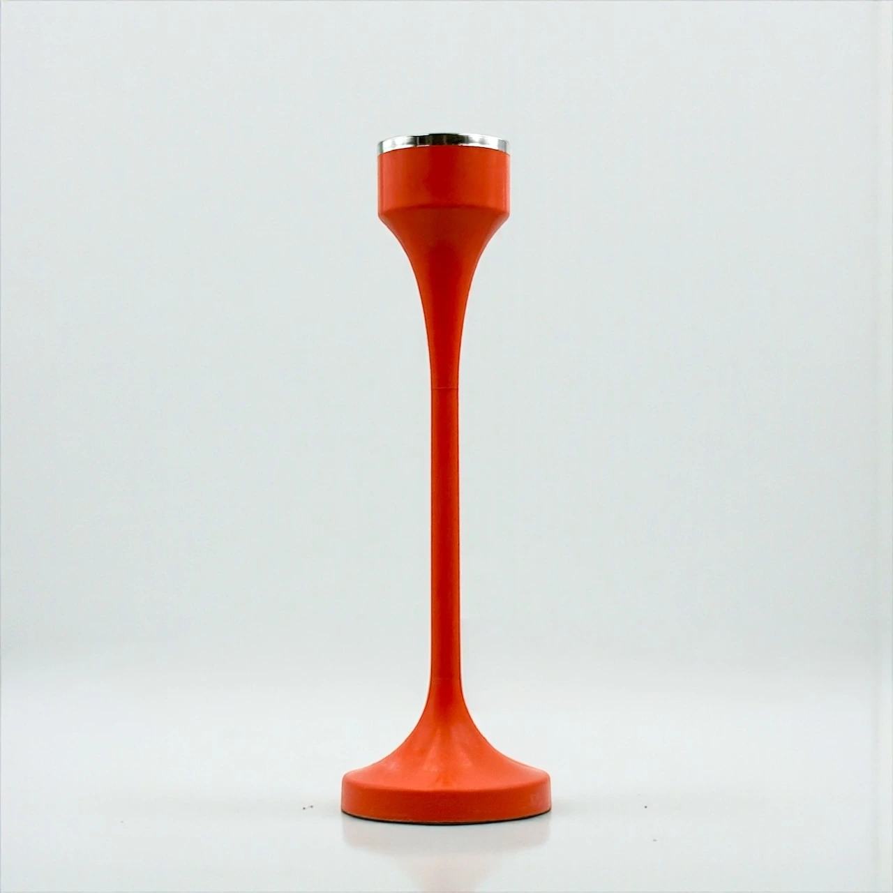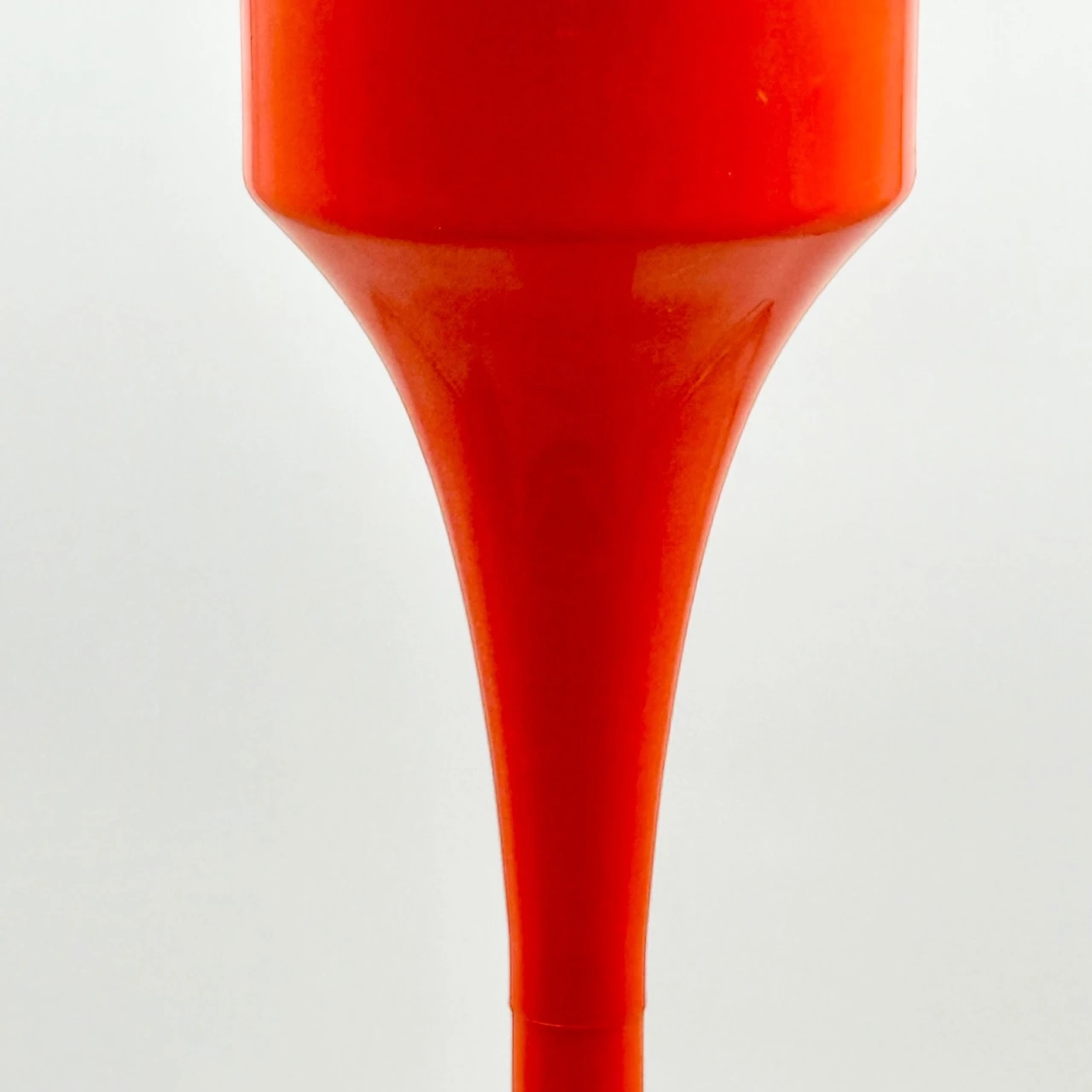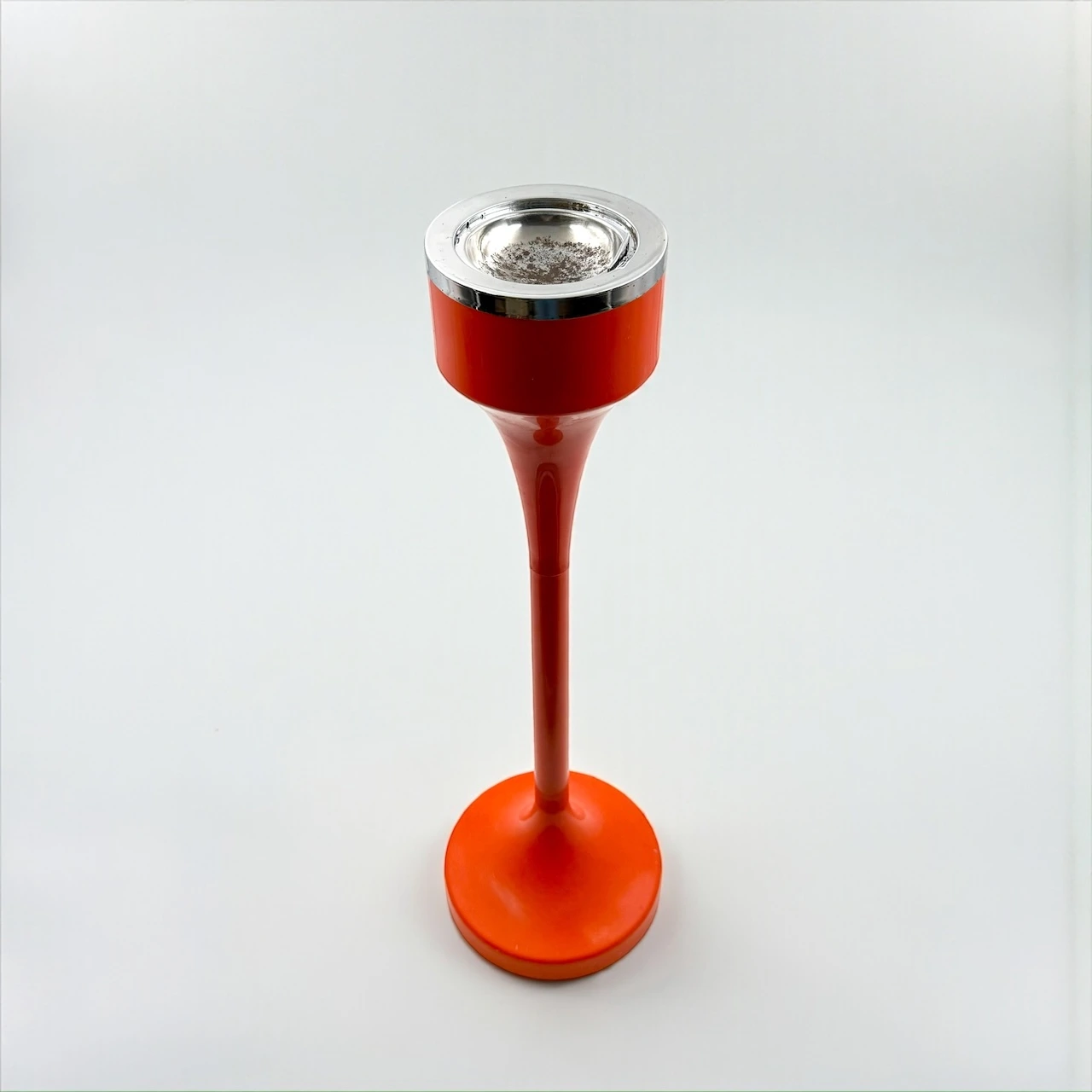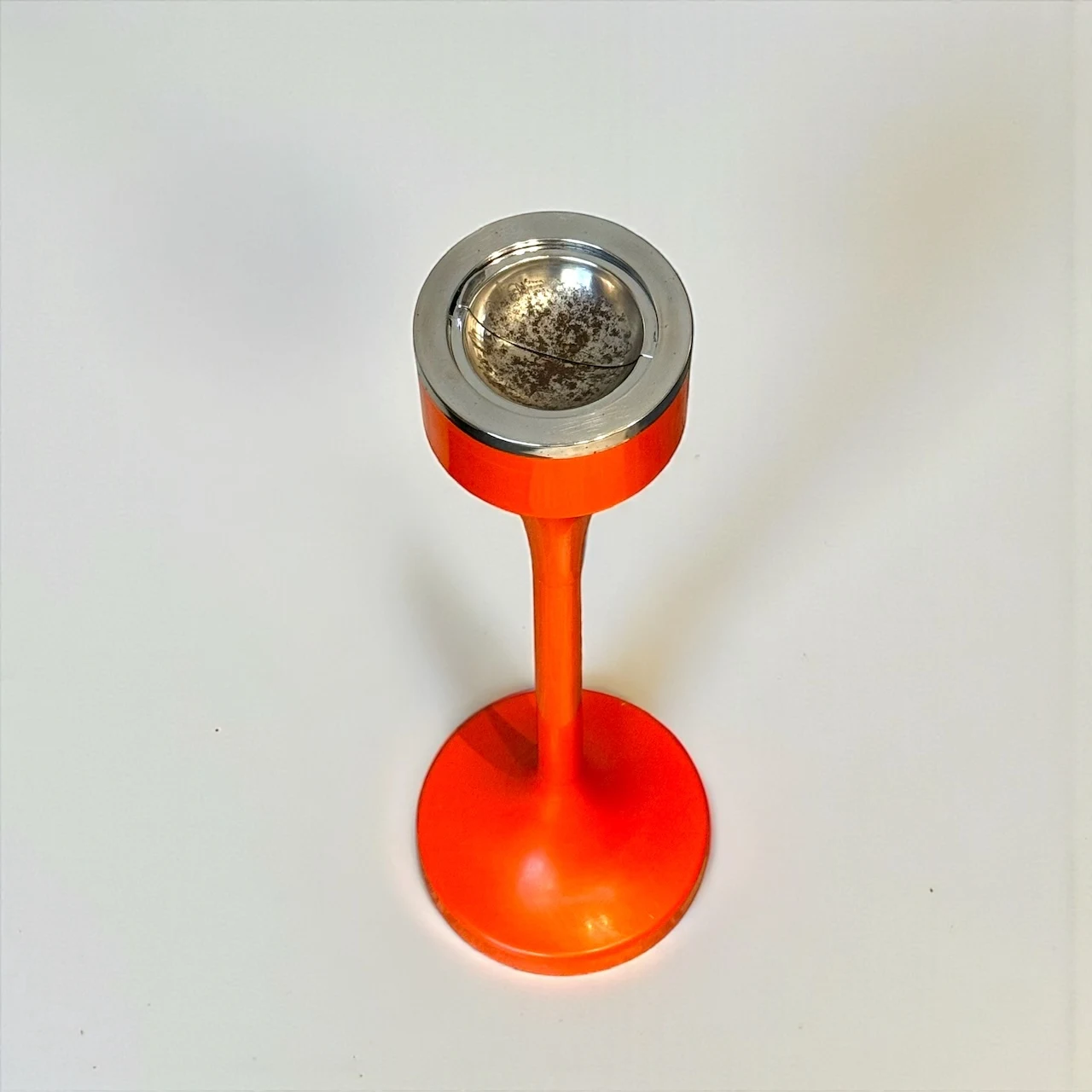 This Italian Space Age floor ashtray from the 1970s is a striking example of functional design transformed into a sculptural object. Defined by its slender vertical profile, flared base and bold orange plastic body, it reflects the experimental spirit that shaped Italian interiors during the Space Age era. The chromed metal rim adds contrast and a refined industrial note, while the patented mechanism allows the ashtray compartment to open and close smoothly, concealing its function when not in use.
