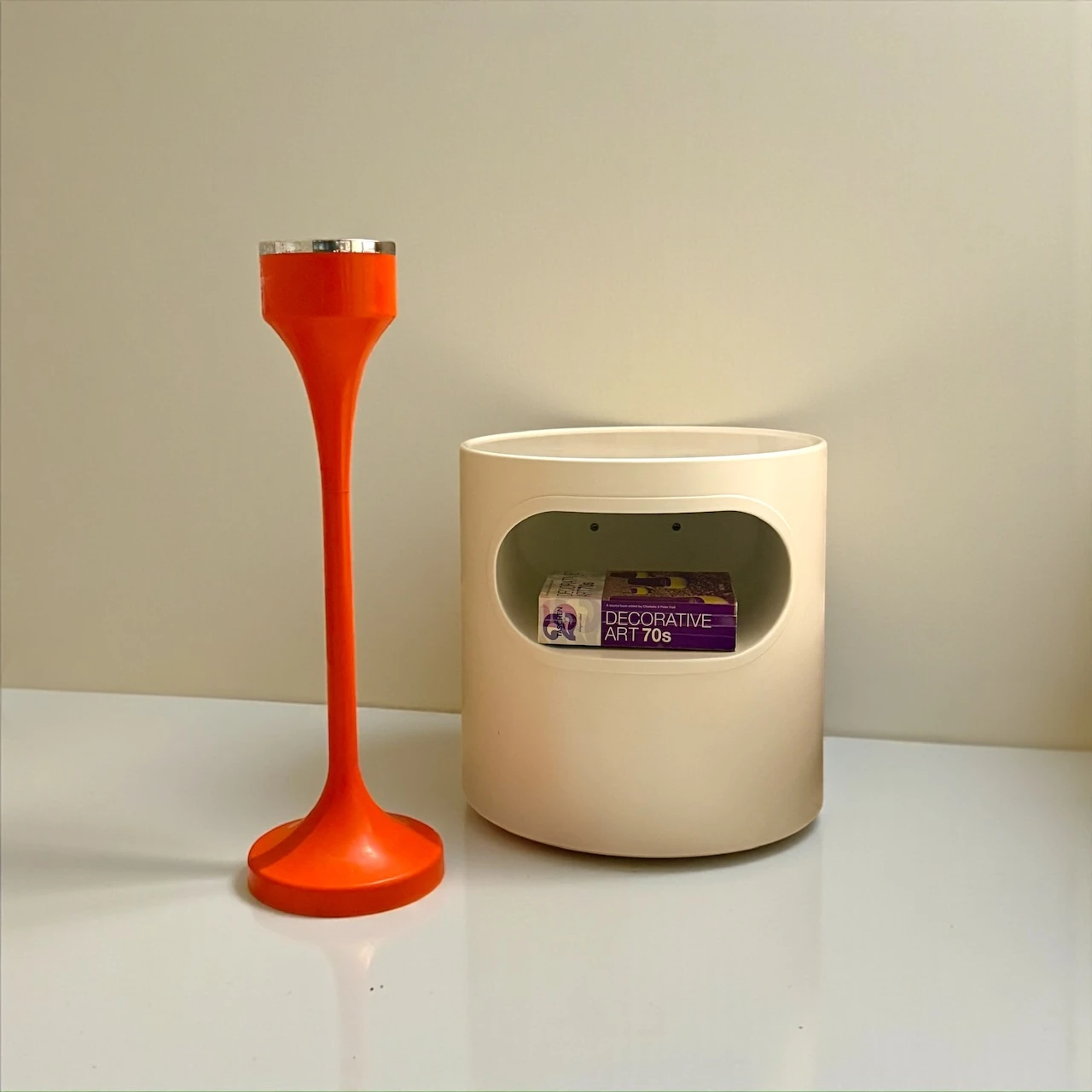 Designed and produced in Italy, this space age ashtray balances practicality with visual impact. Its proportions make it ideal as a floor-standing piece beside a sofa, lounge chair or reading corner, where it becomes part of the interior rather than a secondary accessory. Even without use, it reads as a sculptural accent, echoing the optimism and plastic innovation of 1970s design culture.