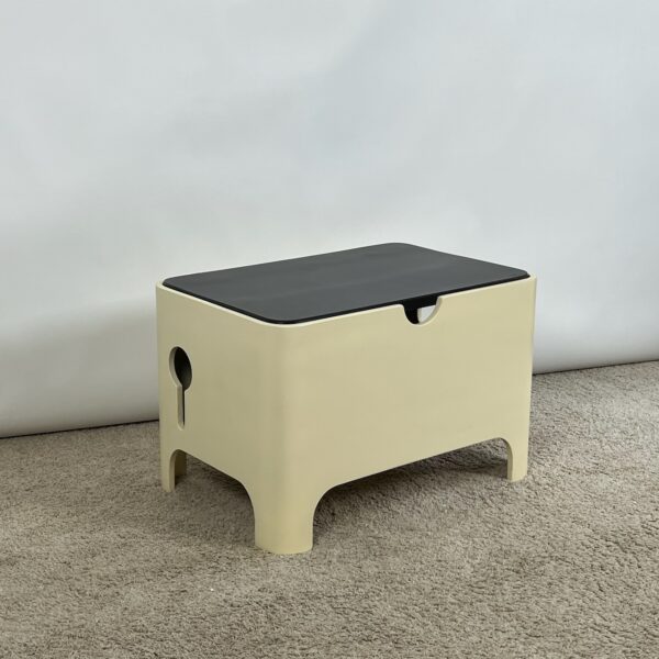item. bench with storage containerdesigner. Carlo De Carlimaker. Fiarmperiod. 1960scountry. Italymaterial. wood, lacquered woodcolor. cream, blackdimensions (cm). 60 x 40 x 40.condition. excellent vintage condition. the wood base has been restored / repainted in the past, keeping original colors. minor traces of wear (small scuffs and spots).