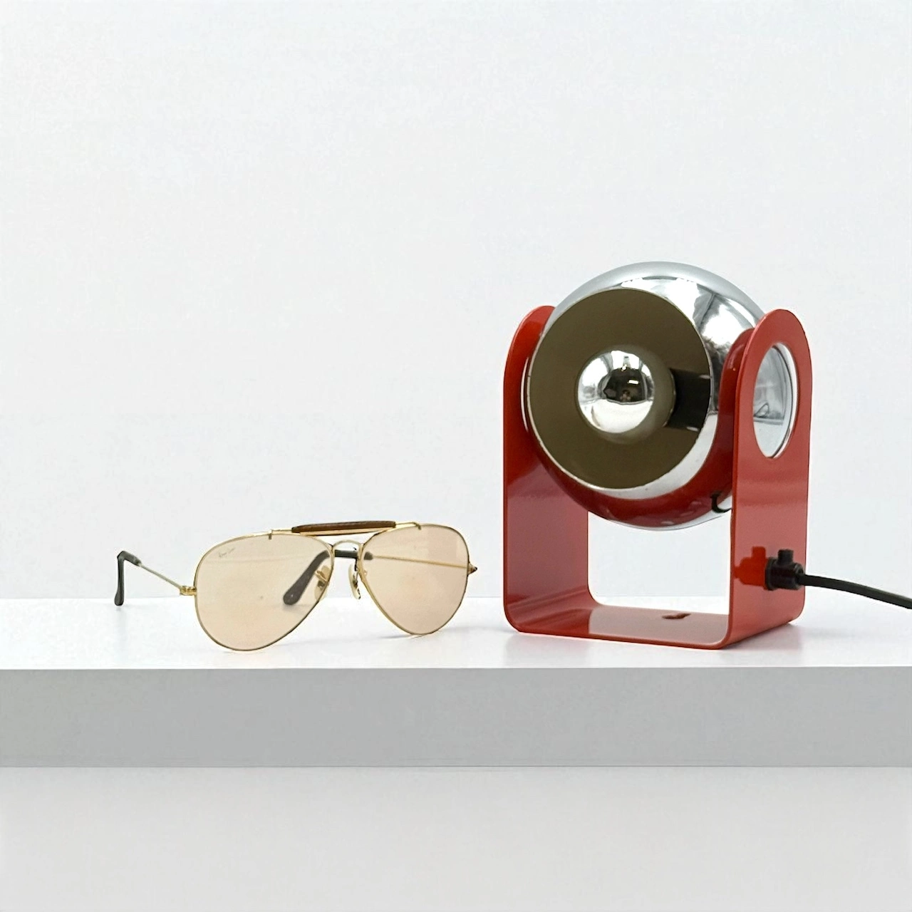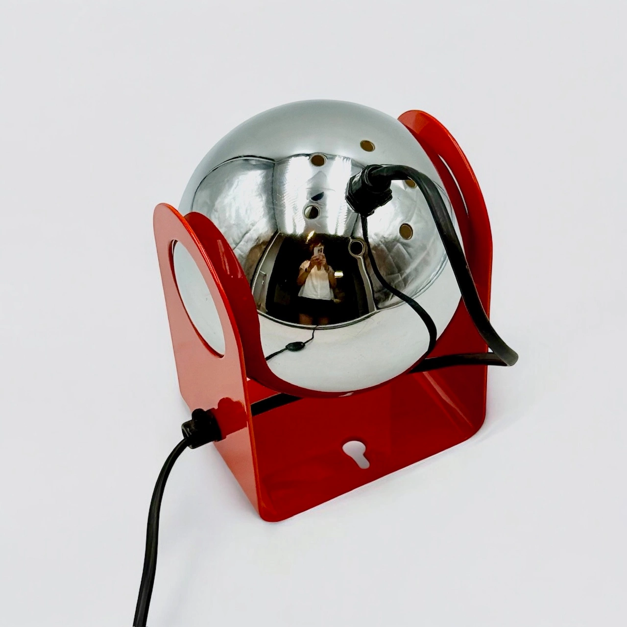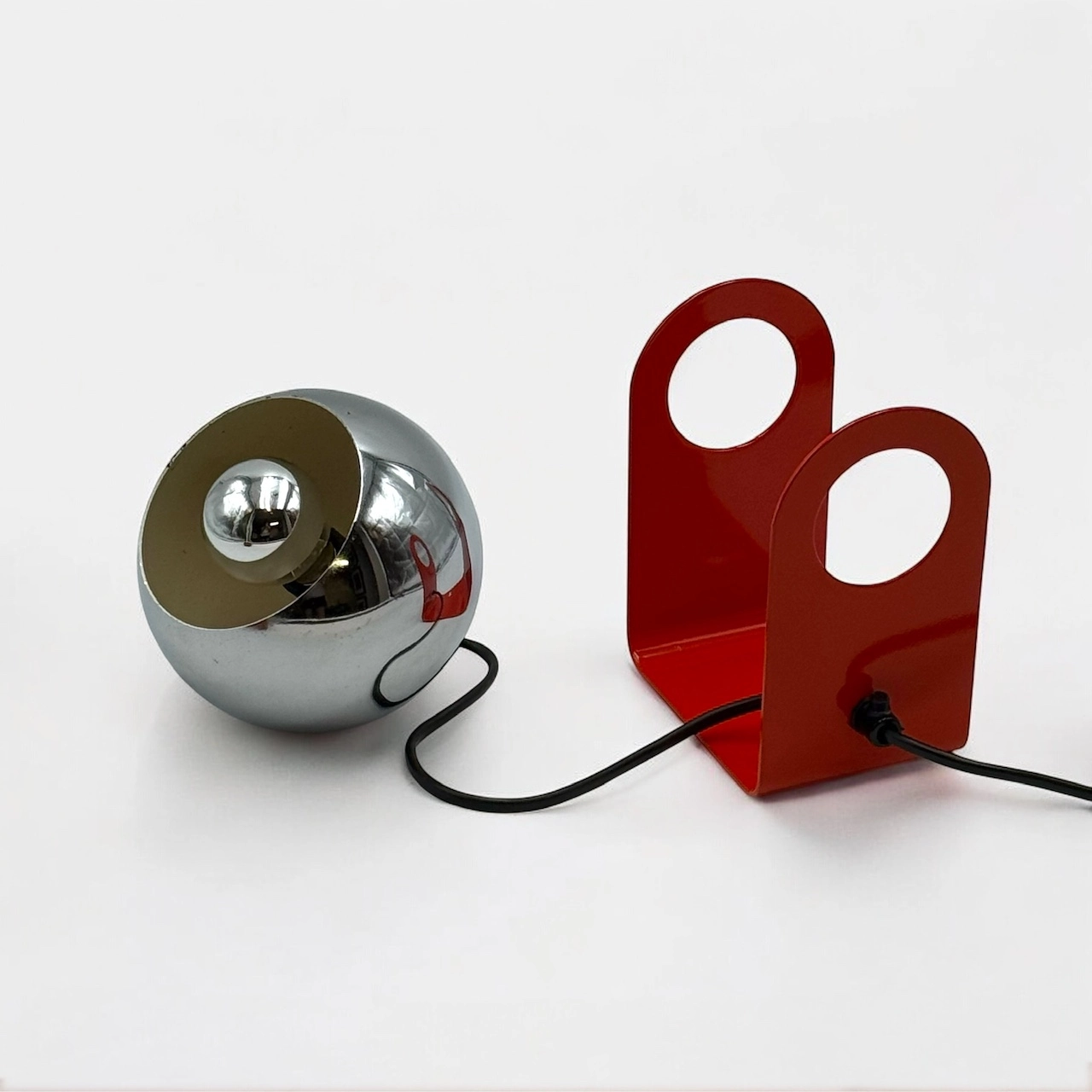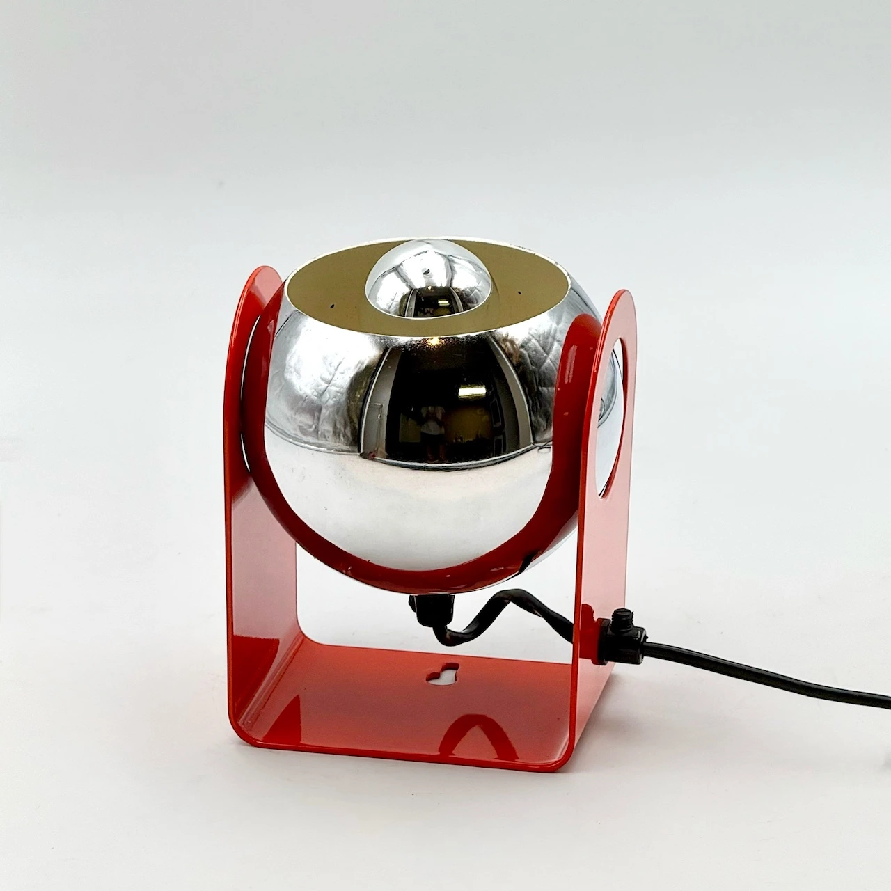 This amazing space age lamp from the 1970s combines retro-futuristic design with sculptural appeal. Its bold red U-shaped base and chrome eyeball reflector make it a true visual statement. The adjustable chrome sphere directs light precisely, enhancing any setting with a futuristic glow.