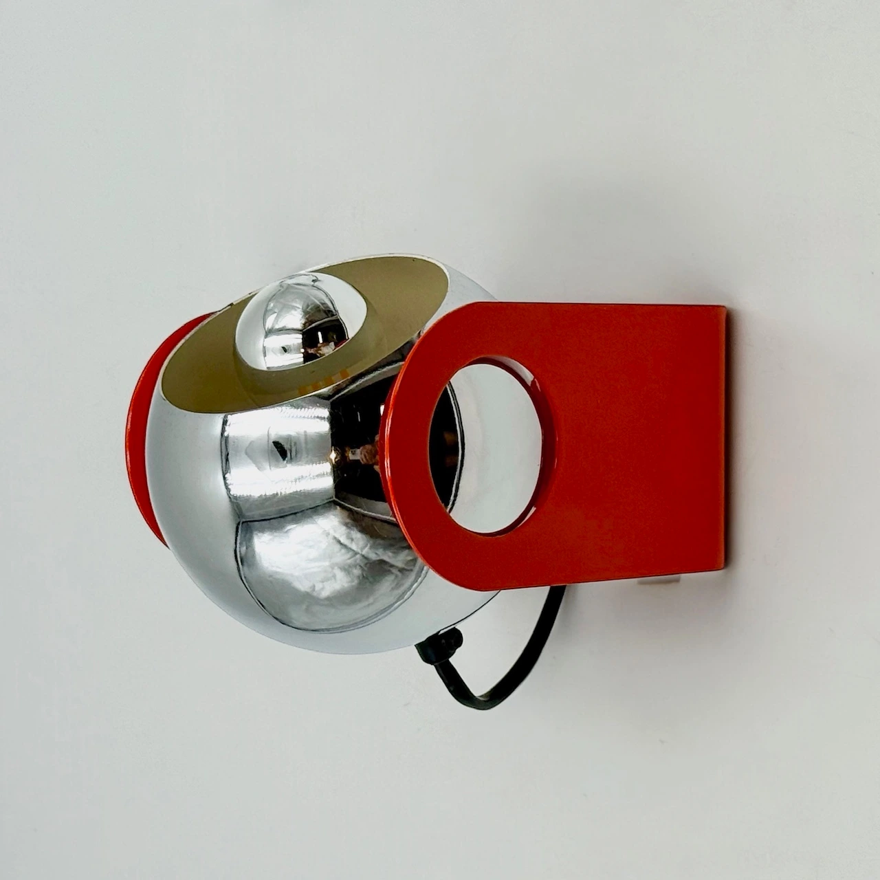 Amazing 1970s space age lamp with a bold red frame and chrome eyeball reflector. Sculptural, rare and functional—this striking design icon works as table or wall light.