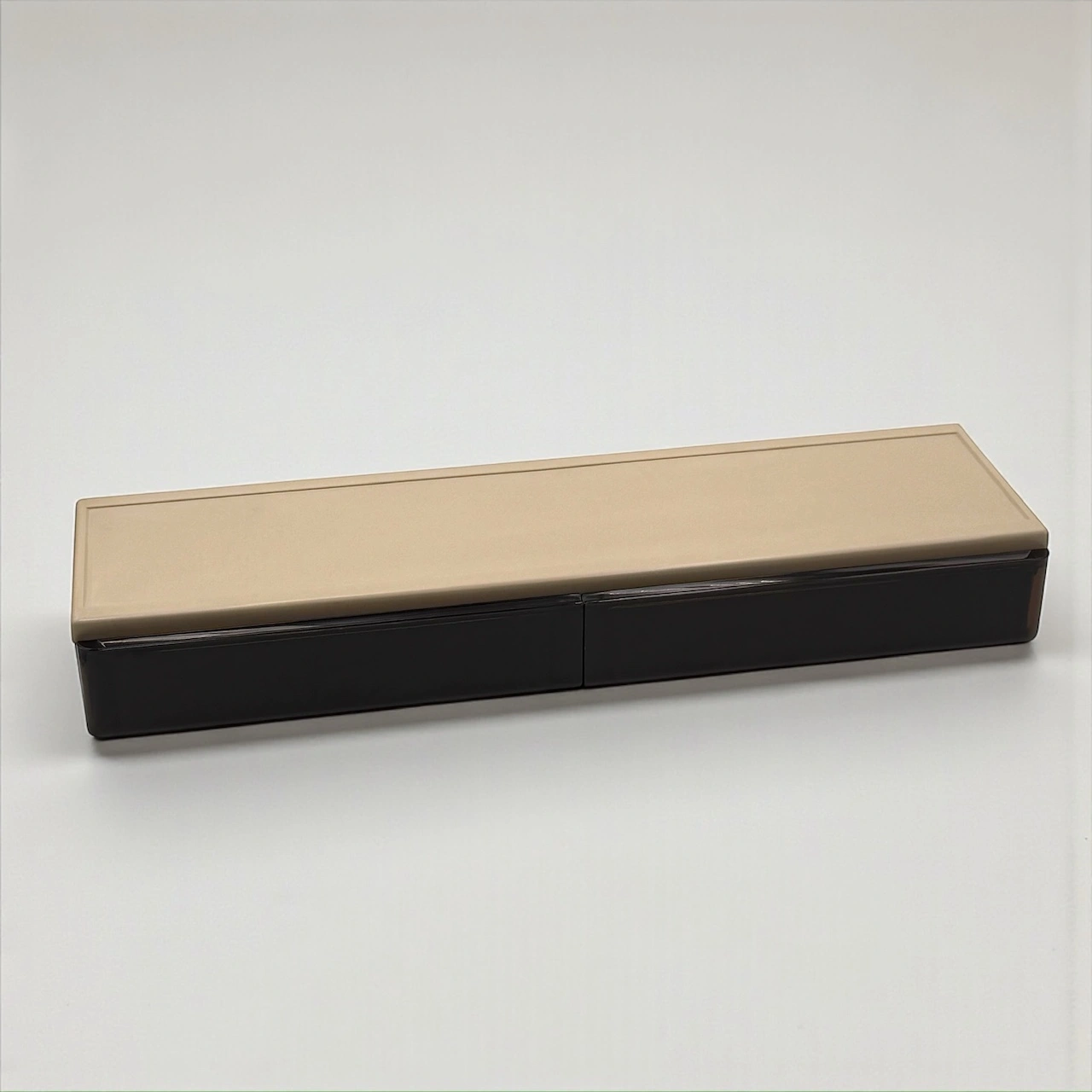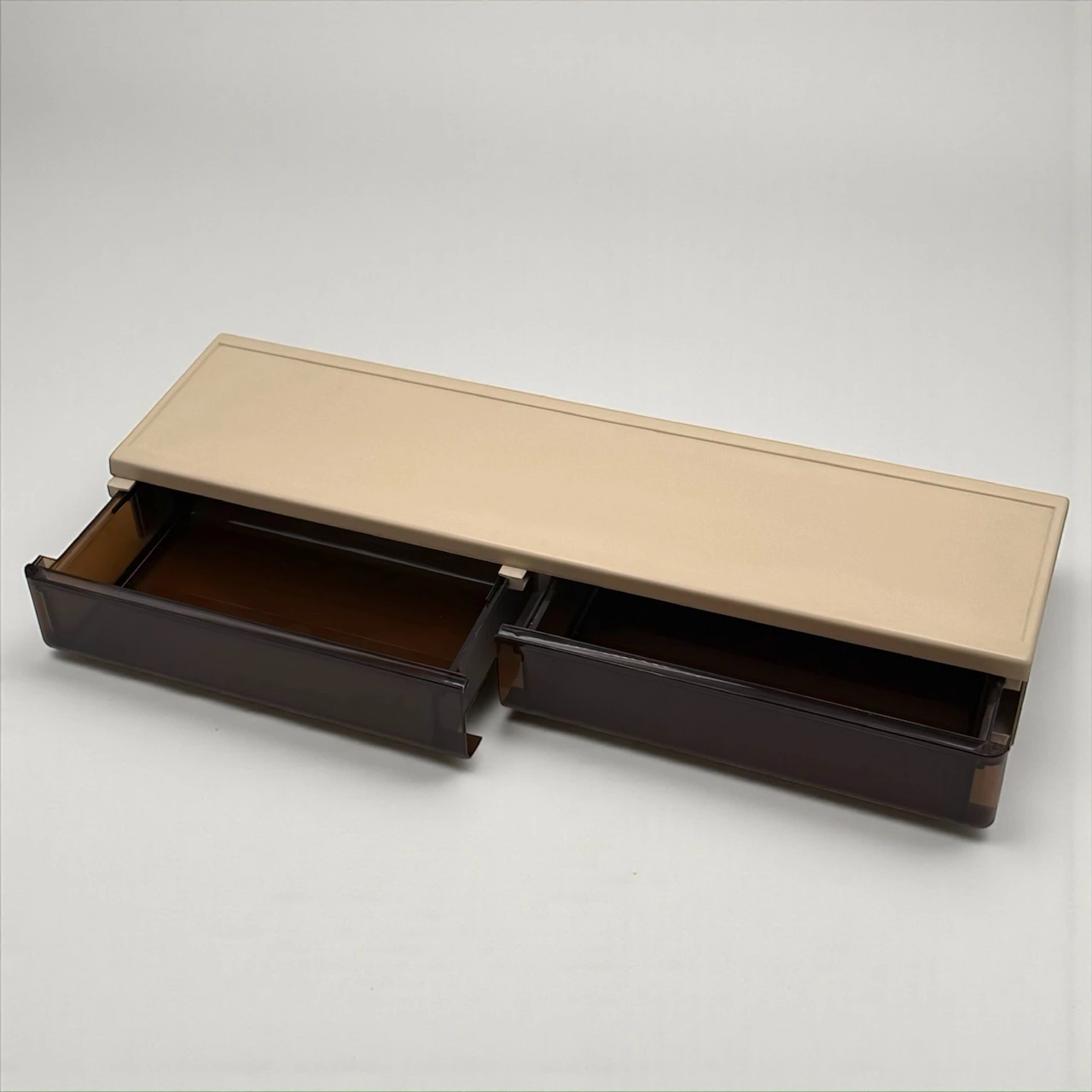 The piece is made of molded plastic with a smoked brown finish, contrasted by ivory toned structural elements. Original mold numbers are visible on the external plastic surfaces, a detail that supports the period attribution and highlights its industrial production quality. The design reflects the optimistic and futuristic language of French Space Age interiors, where plastic became a primary expressive material.