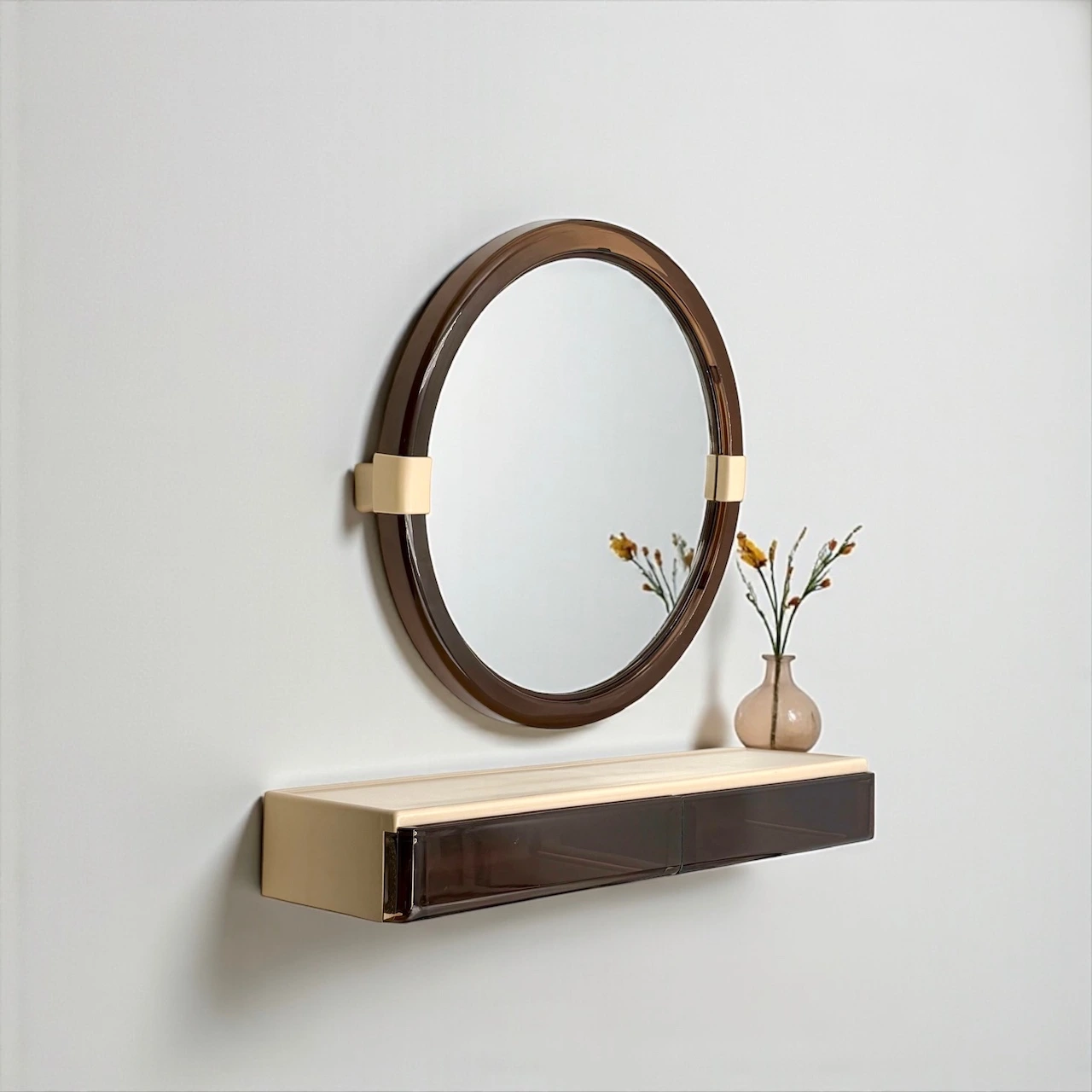 A sculptural Space Age mirror with coordinated shelf and drawers, attributed to Allibert. French mid 1970s design in smoked brown plastic with ivory details, combining functionality and bold futuristic character.