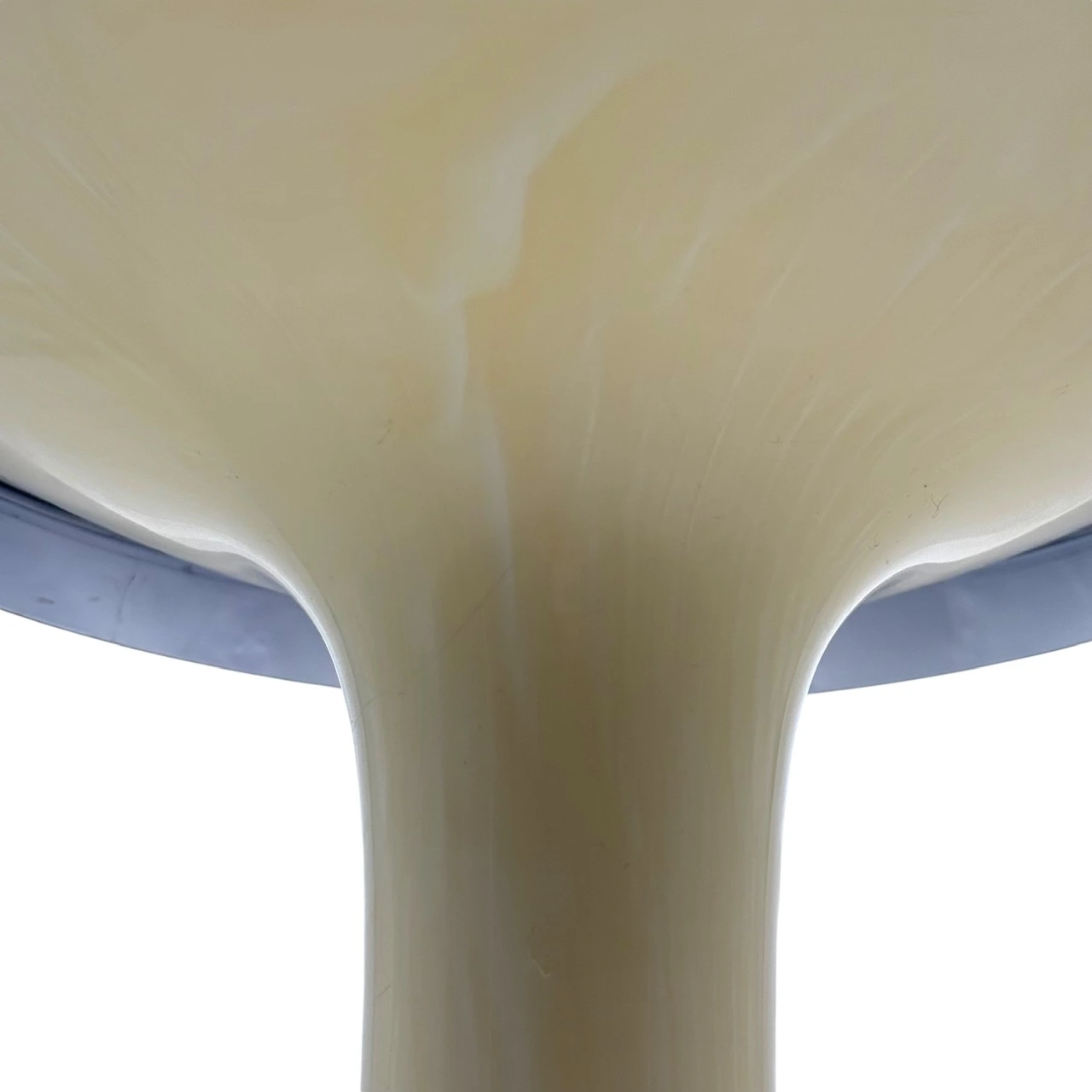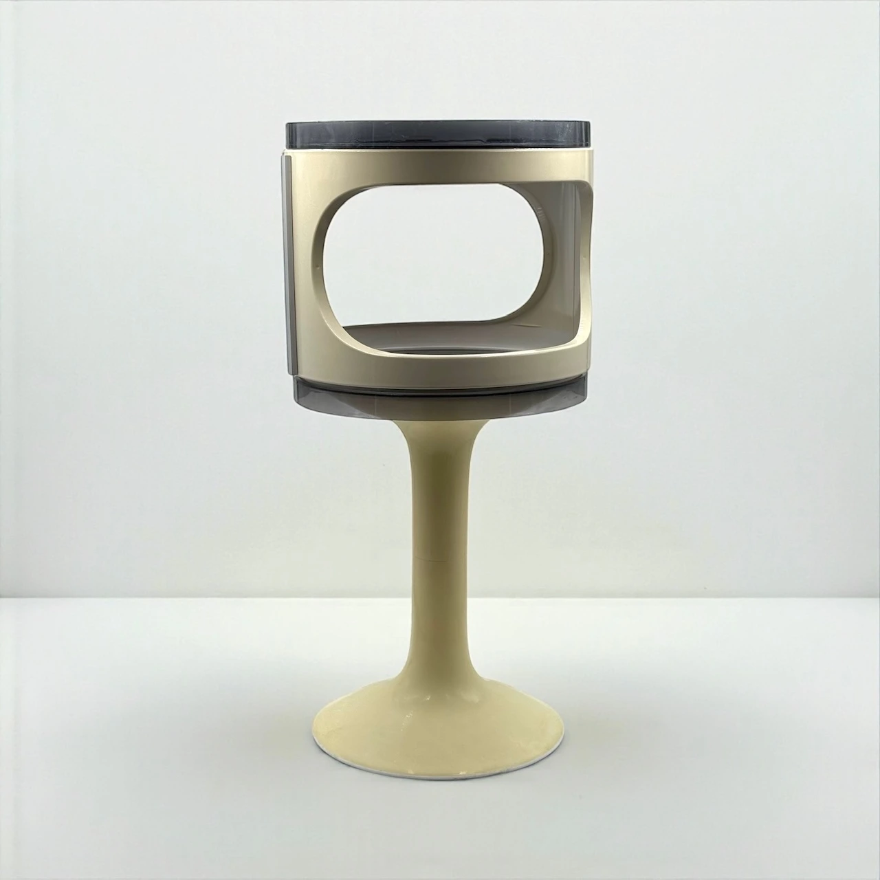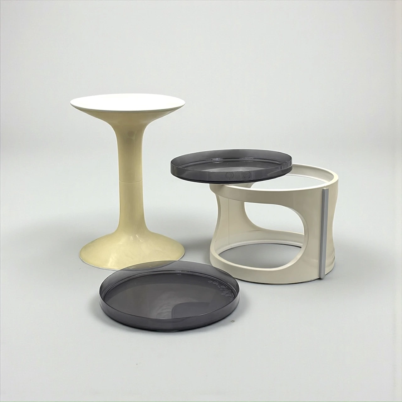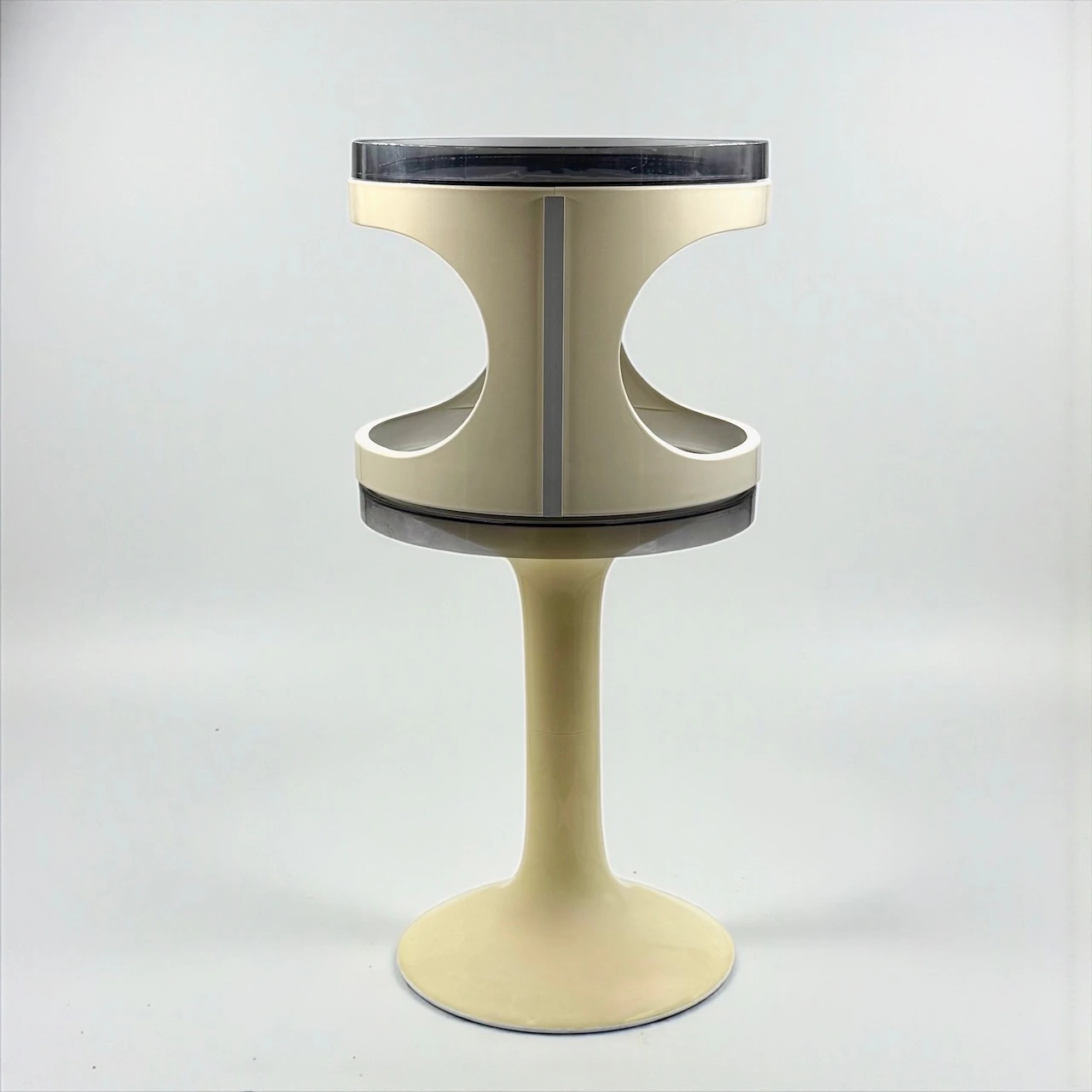 Constructed in injection molded ABS, the piece features a sculptural tulip pedestal supporting a cylindrical modular body with two removable smoked trays. The central unit is stabilized by integrated grey side brackets — a structural detail that highlights the engineering logic of the design. The sculptural tulip base and removable trays reinforce the architectural identity of this Space Age Modular Table.