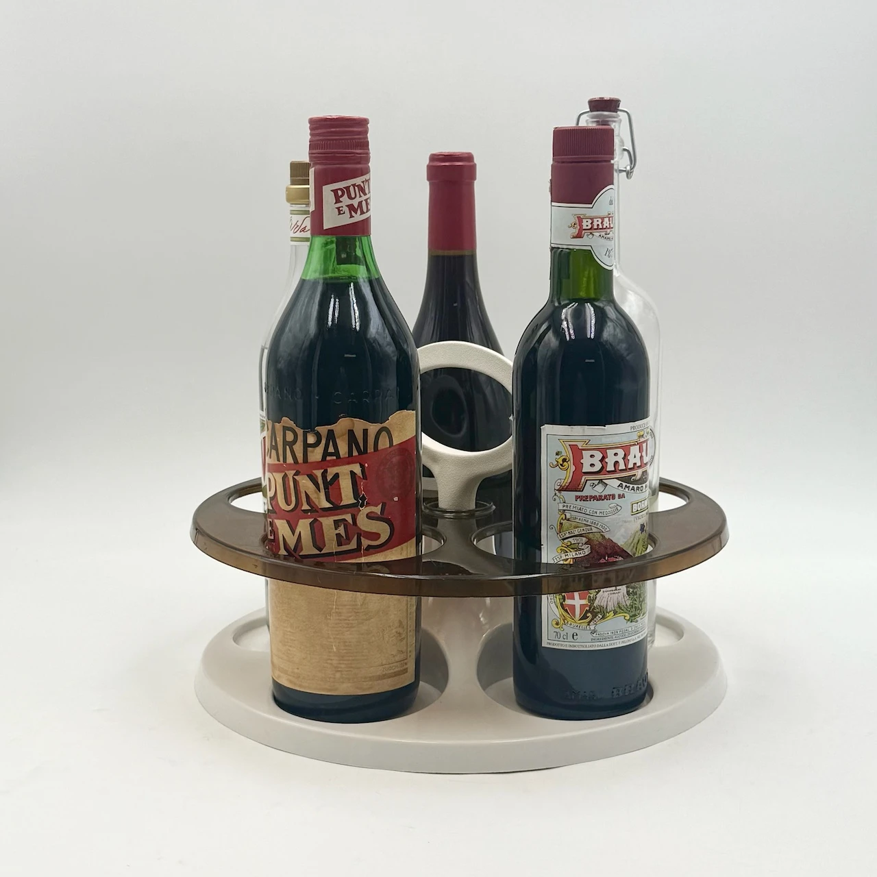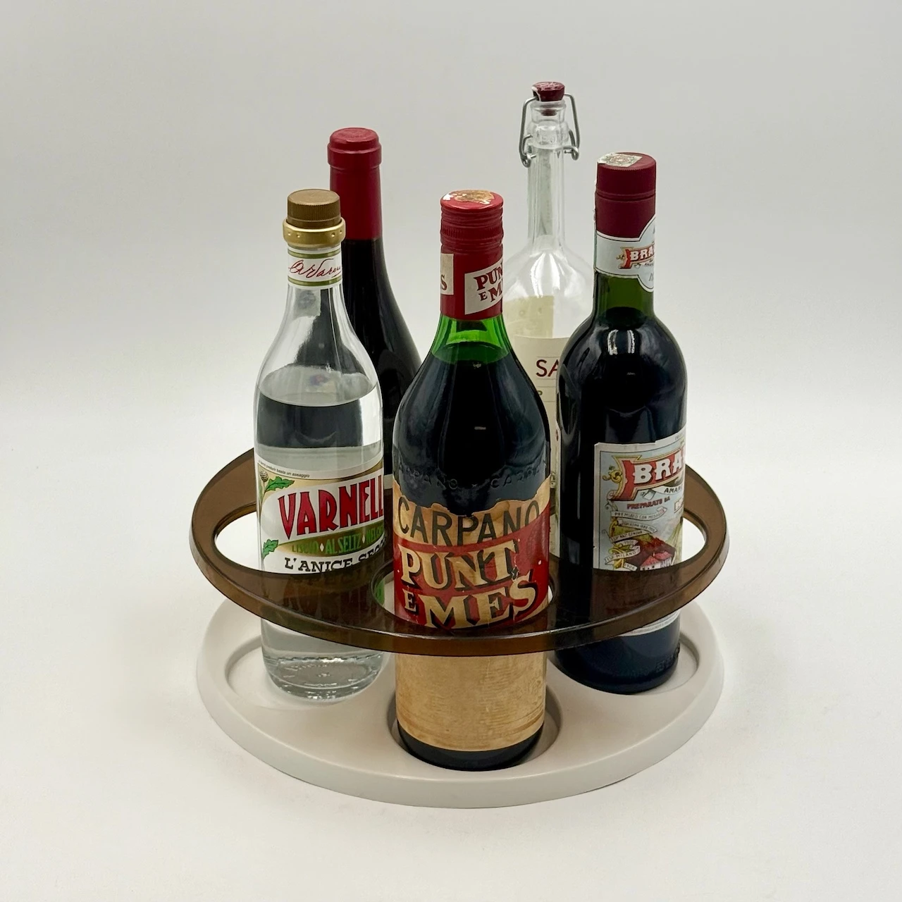 A rare rotating Space Age bottle holder made in Holland in the 1970s. Featuring five circular slots, a central handle, and sculptural lines in white plastic and smoked plexiglass — perfect for any retro-modern bar setup.