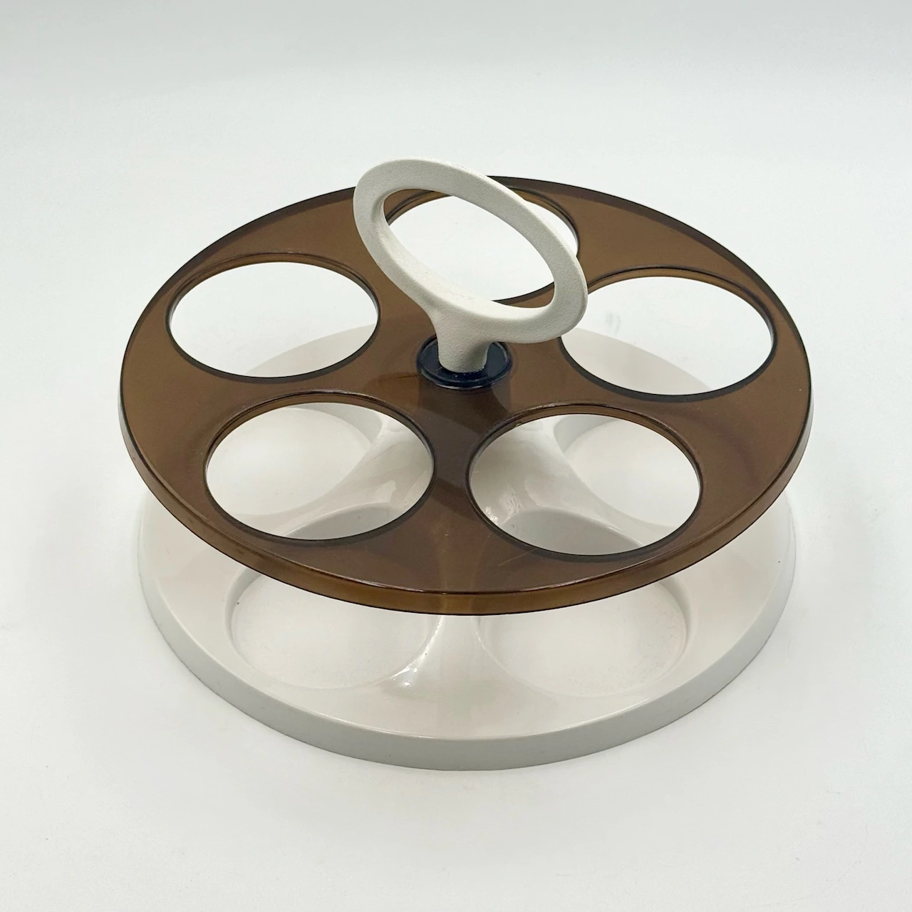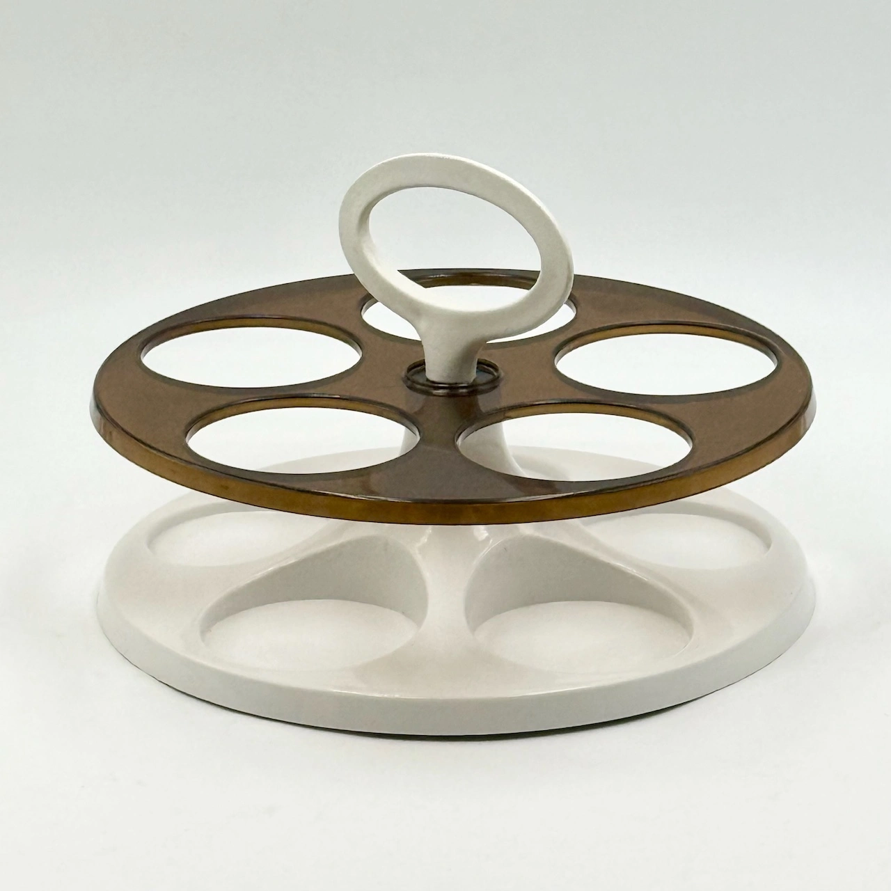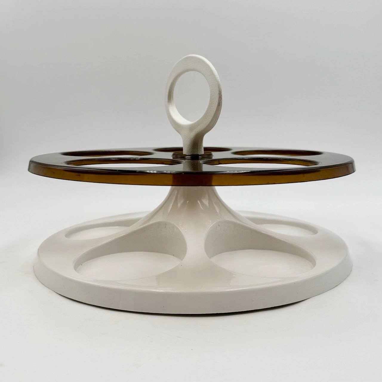 This sculptural Space Age bottle holder, made in Holland in the 1970s, brings both style and function to your vintage bar setup. Crafted from glossy white plastic with a smoked plexiglass top ring, it features five recessed bottle compartments arranged in a circular formation. The rotating base and central handle allow for easy access and portability — a design that is as practical as it is visually compelling.