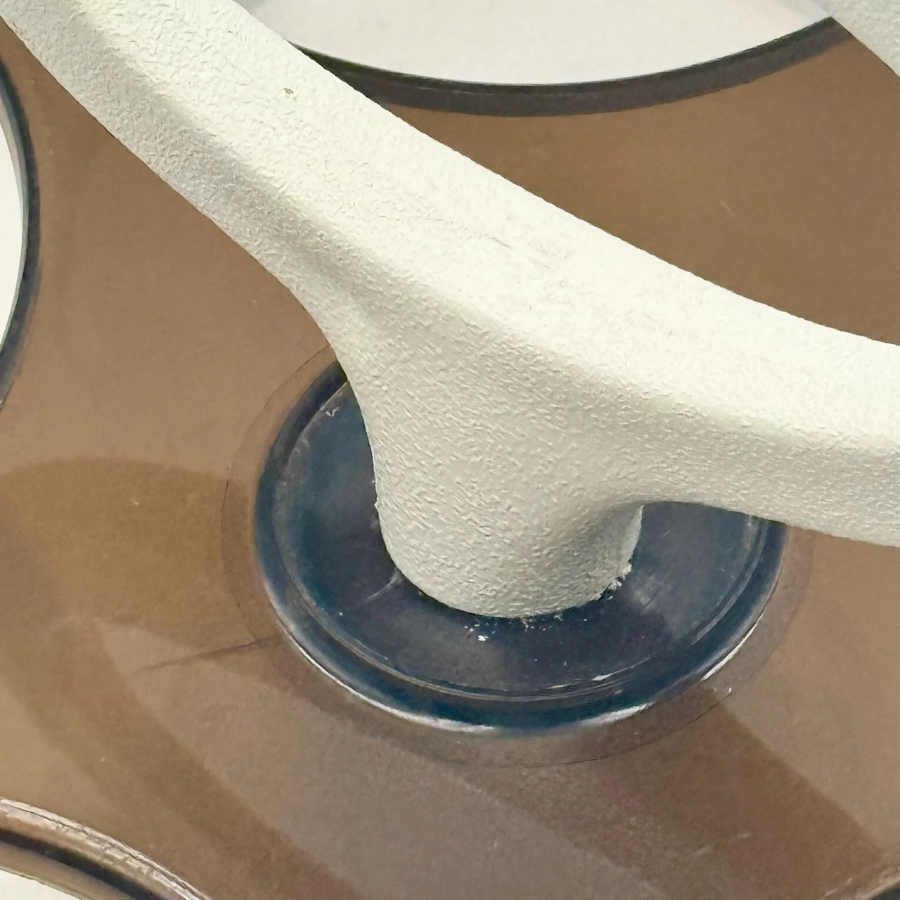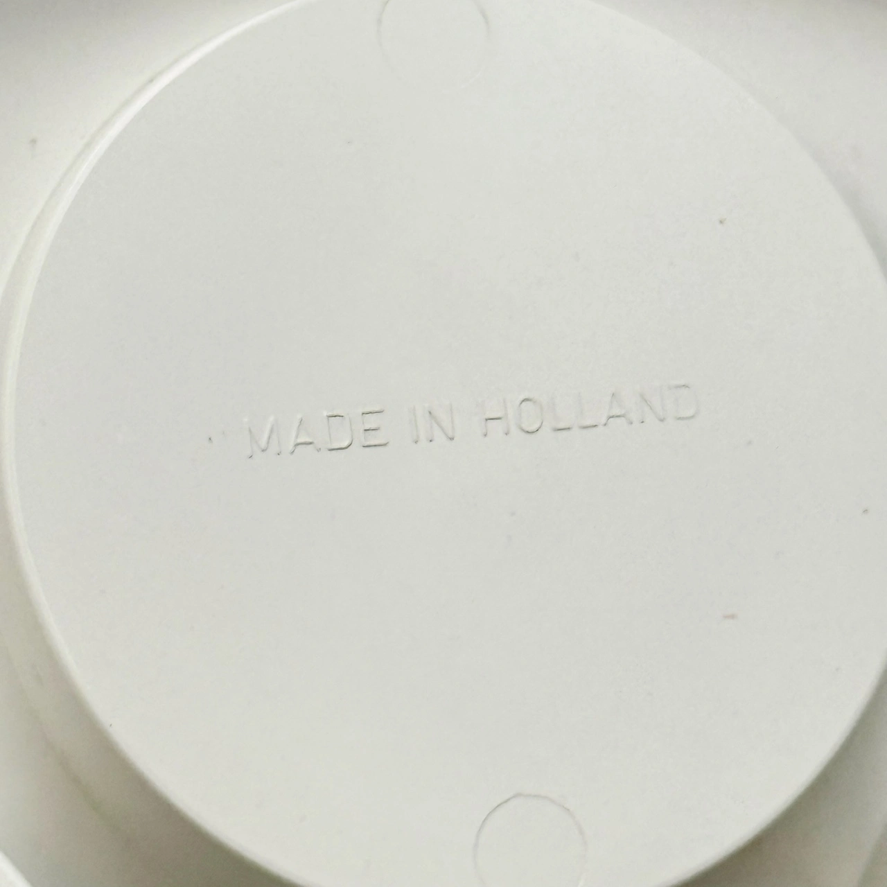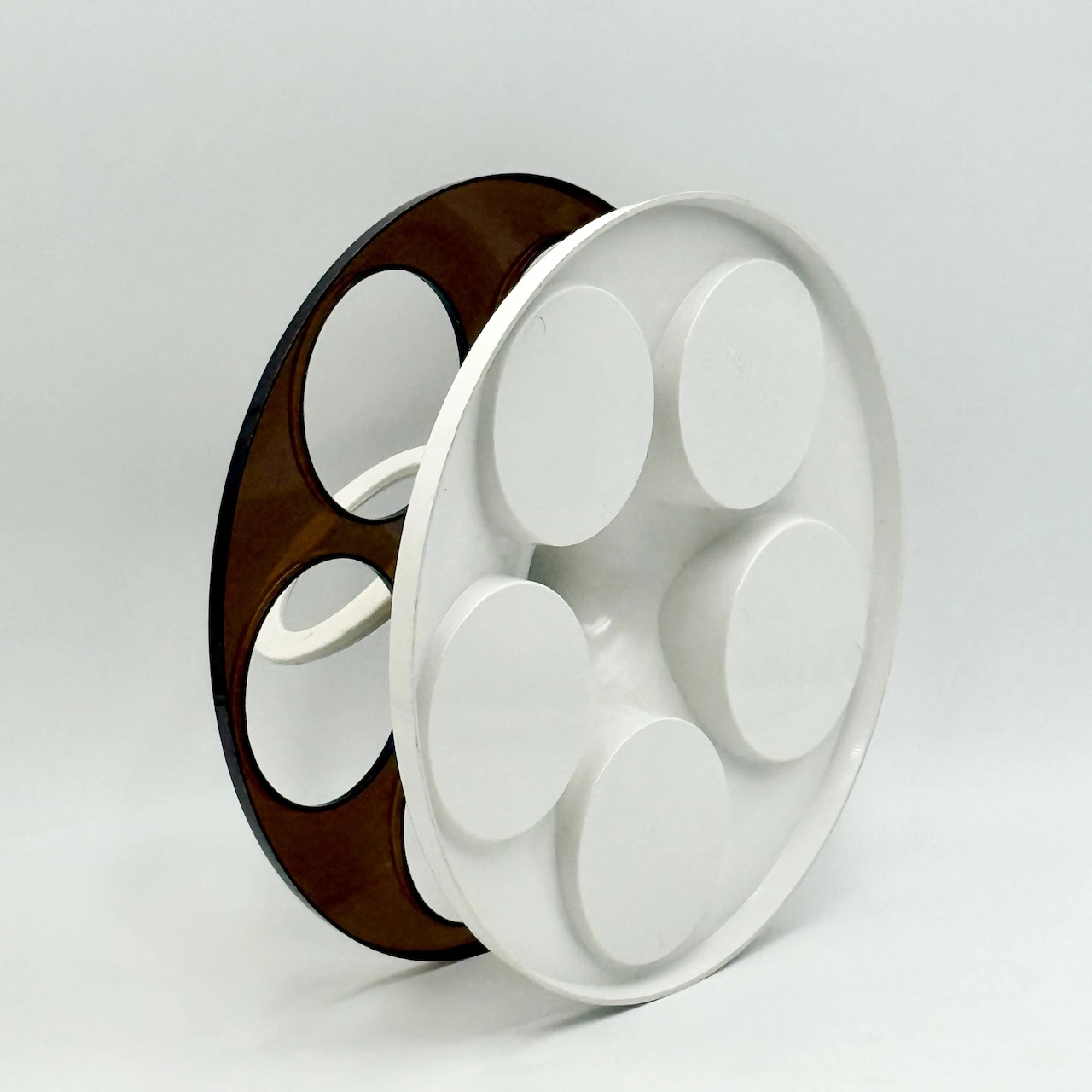 This sculptural Space Age bottle holder, made in Holland in the 1970s, brings both style and function to your vintage bar setup. Crafted from glossy white plastic with a smoked plexiglass top ring, it features five recessed bottle compartments arranged in a circular formation. The rotating base and central handle allow for easy access and portability — a design that is as practical as it is visually compelling.