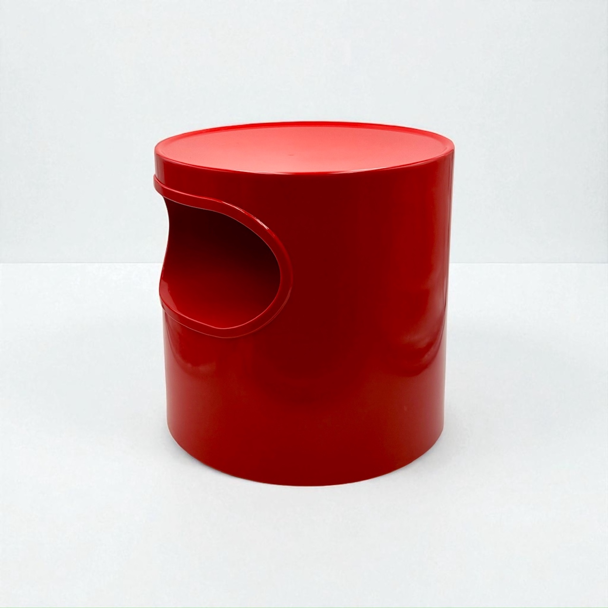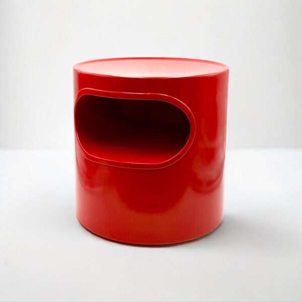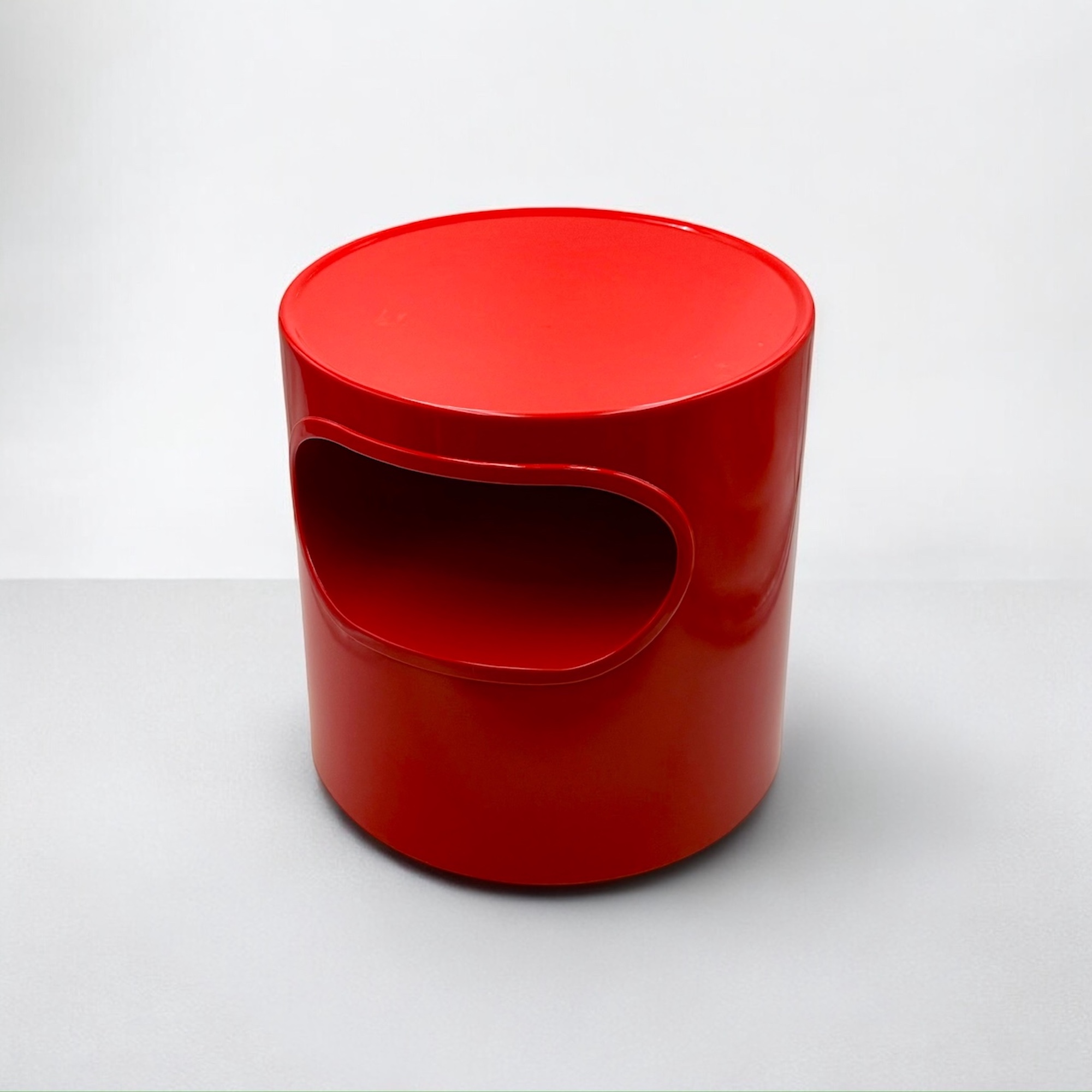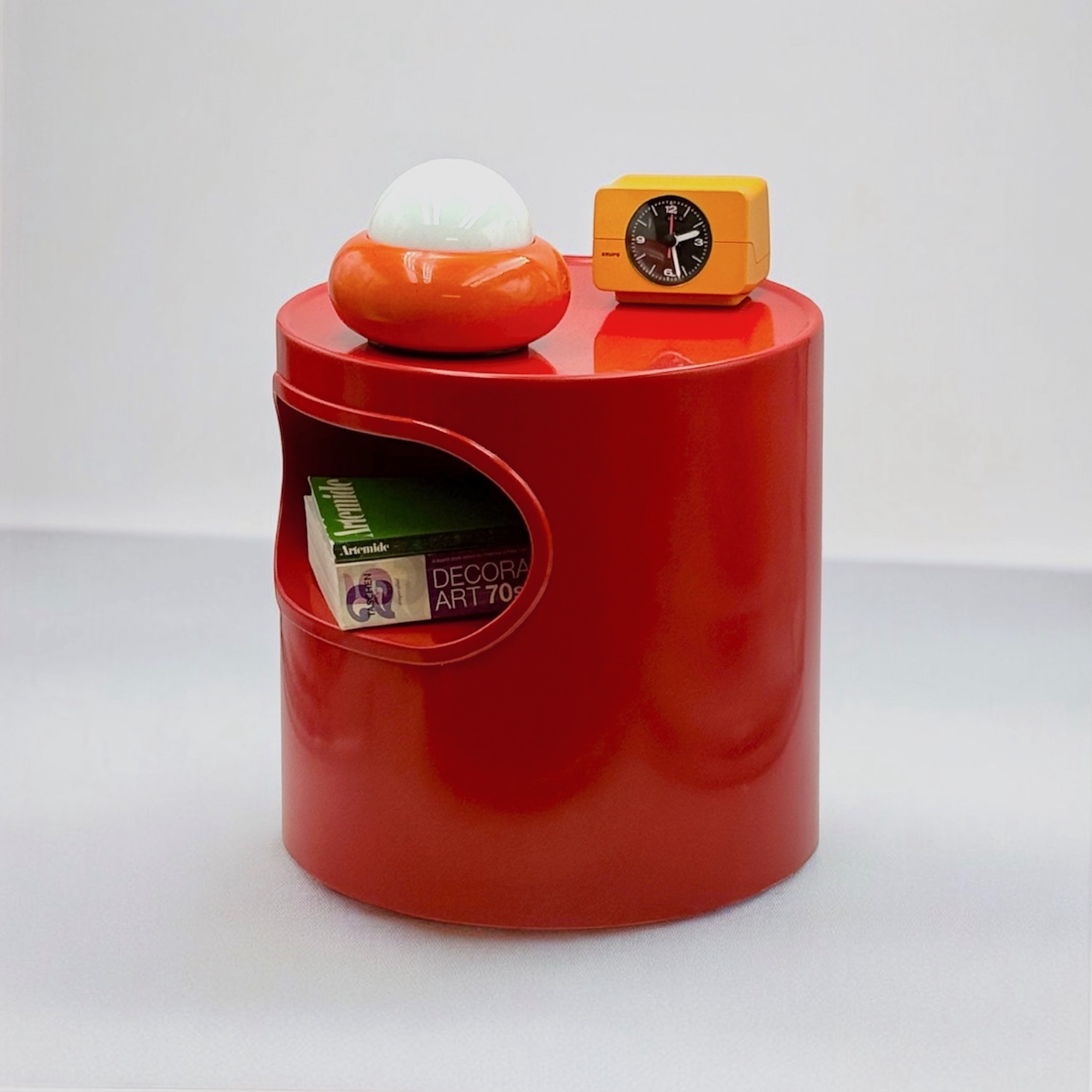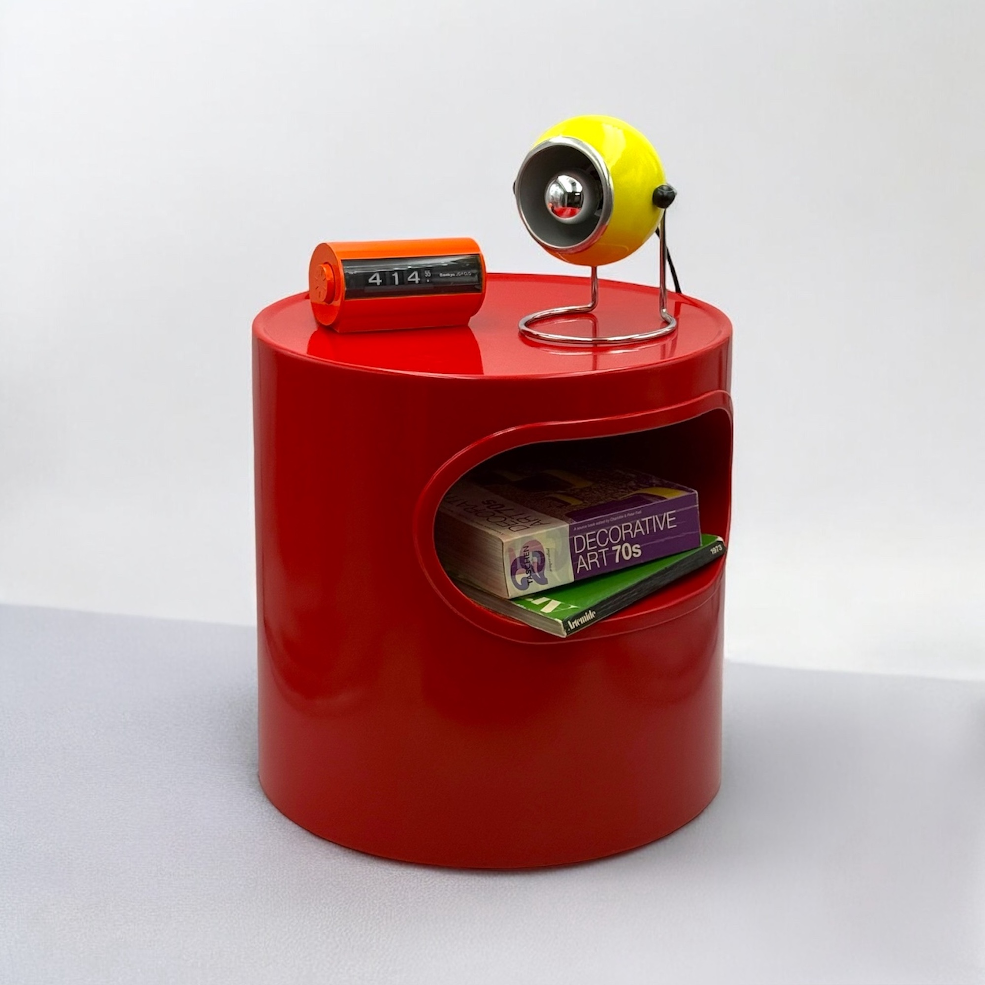 This striking Space Age side table—the Giano Vano—was designed by Emma Gismondi Schweinberger for Artemide in the late 1960s. Its capsule-like red body, sculptural curves and integrated storage reveal the radical elegance of Italian Space Age design.