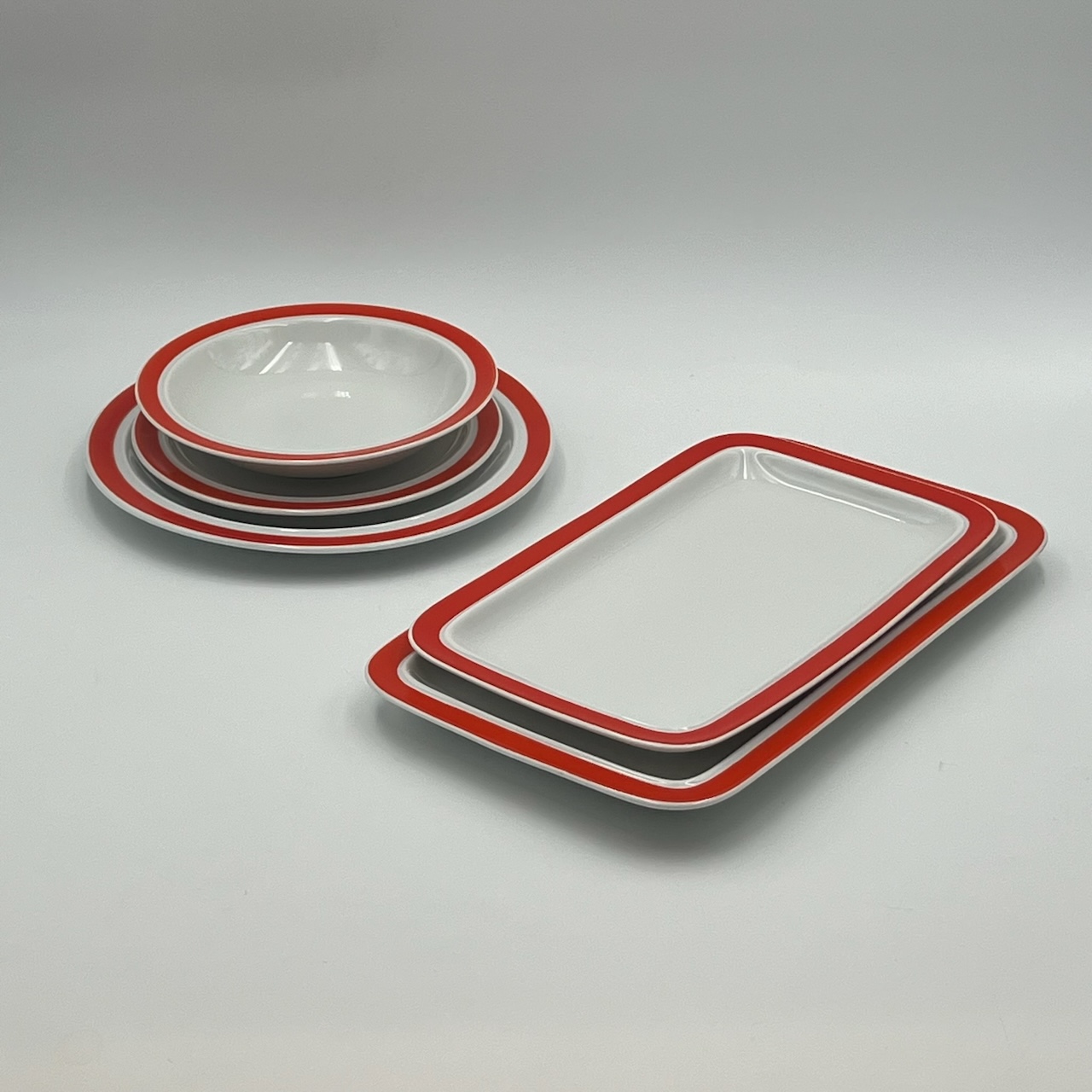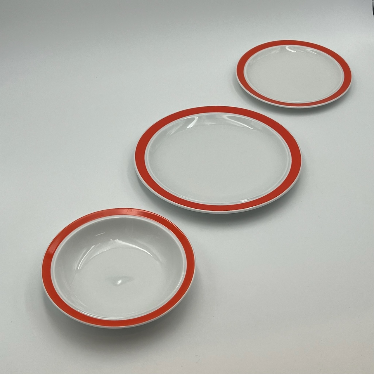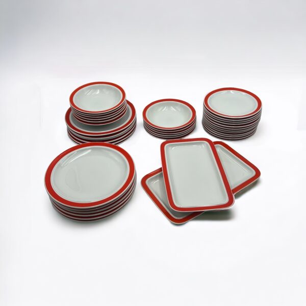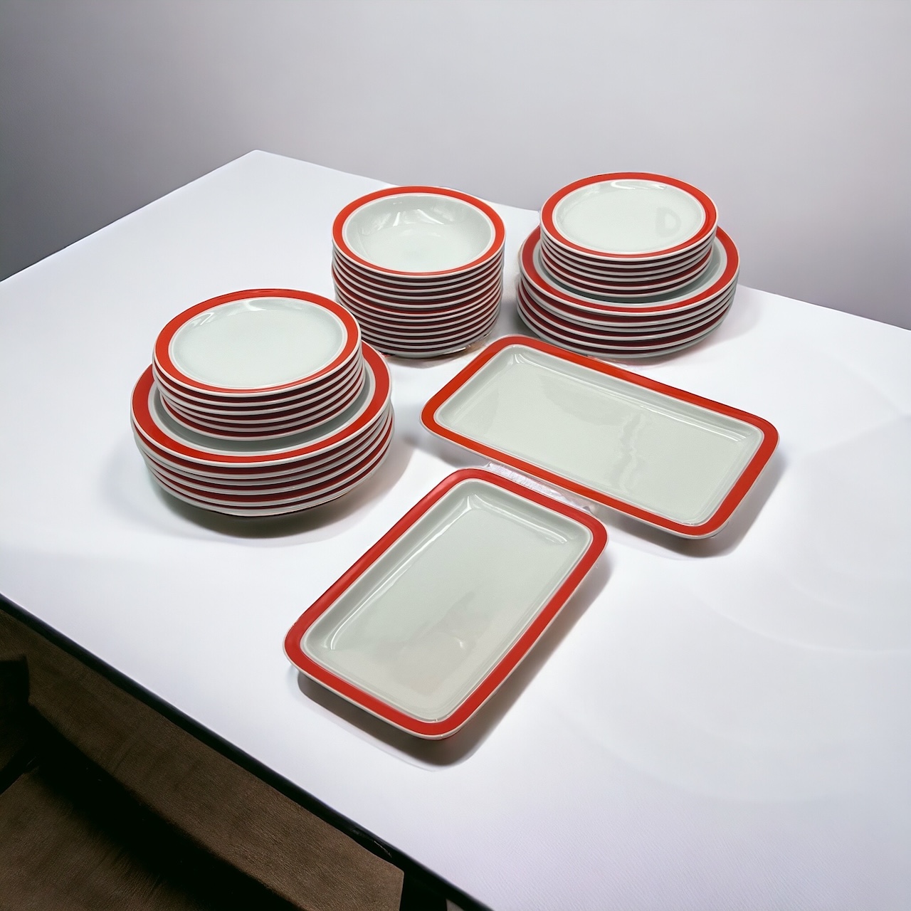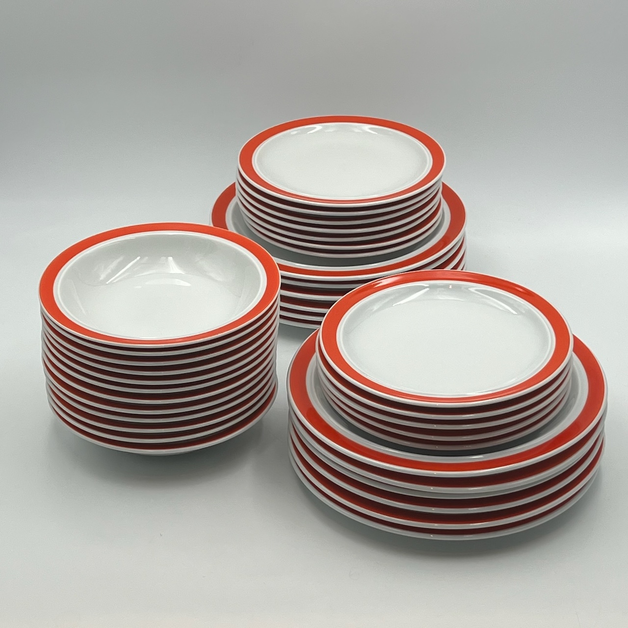 item. tableware set (38 pieces)maker. Thomas Rosenthalperiod. 1970scountry. West Germanymaterial. ceramiccolor. white, orange,dimensions (cm). 25 (dinner plates), 19 (soup plates), 19.5 (dessert plates), 33.5x20x2.5 (big serving dish), 29x18x2 (medium serving dish)condition. excellent conditions. very light discoloration of the orange pattern border in some pieces. art. no. 1347