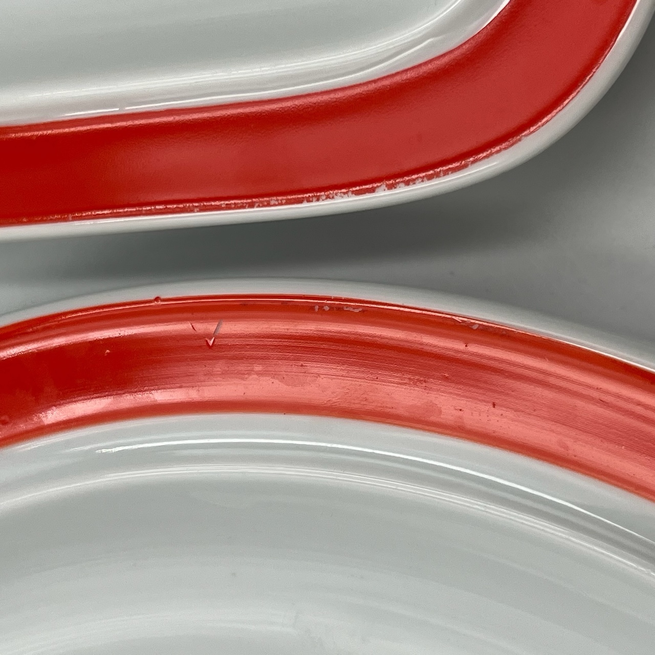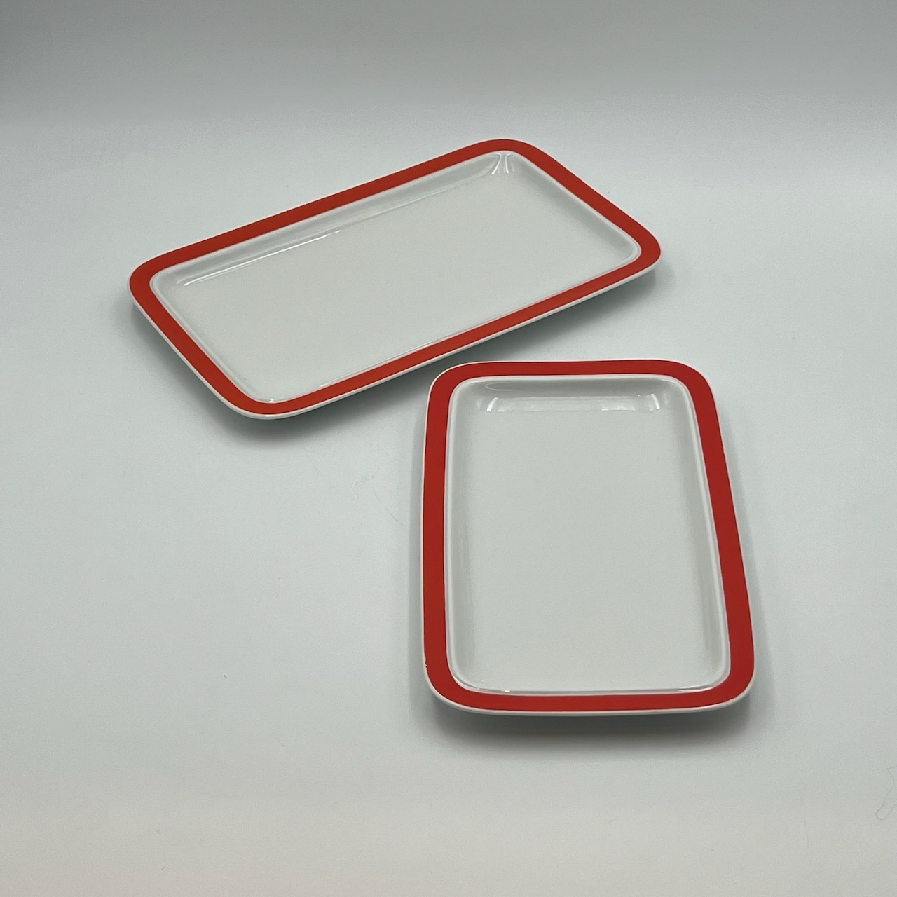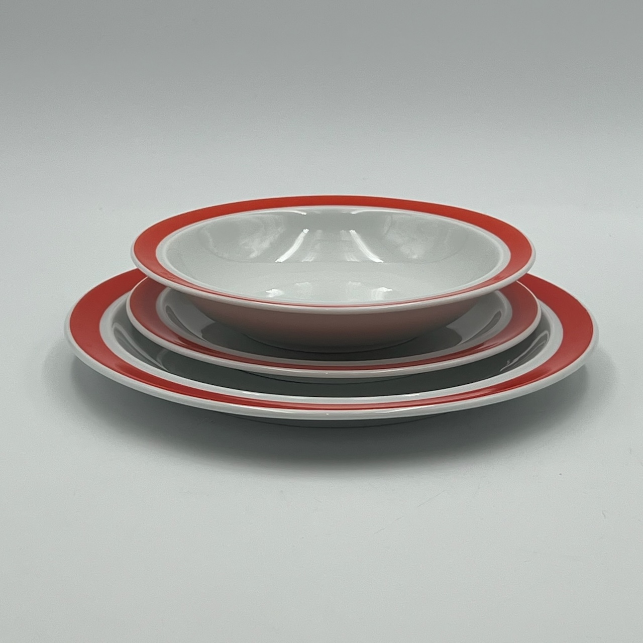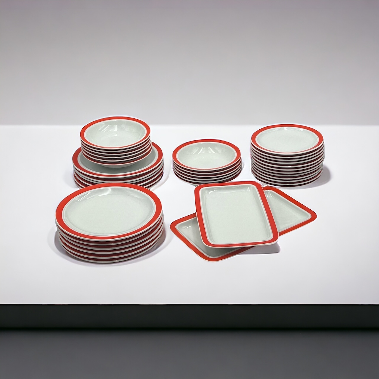 item. tableware set (38 pieces)maker. Thomas Rosenthalperiod. 1970scountry. West Germanymaterial. ceramiccolor. white, orange,dimensions (cm). 25 (dinner plates), 19 (soup plates), 19.5 (dessert plates), 33.5x20x2.5 (big serving dish), 29x18x2 (medium serving dish)condition. excellent conditions. very light discoloration of the orange pattern border in some pieces. art. no. 1347