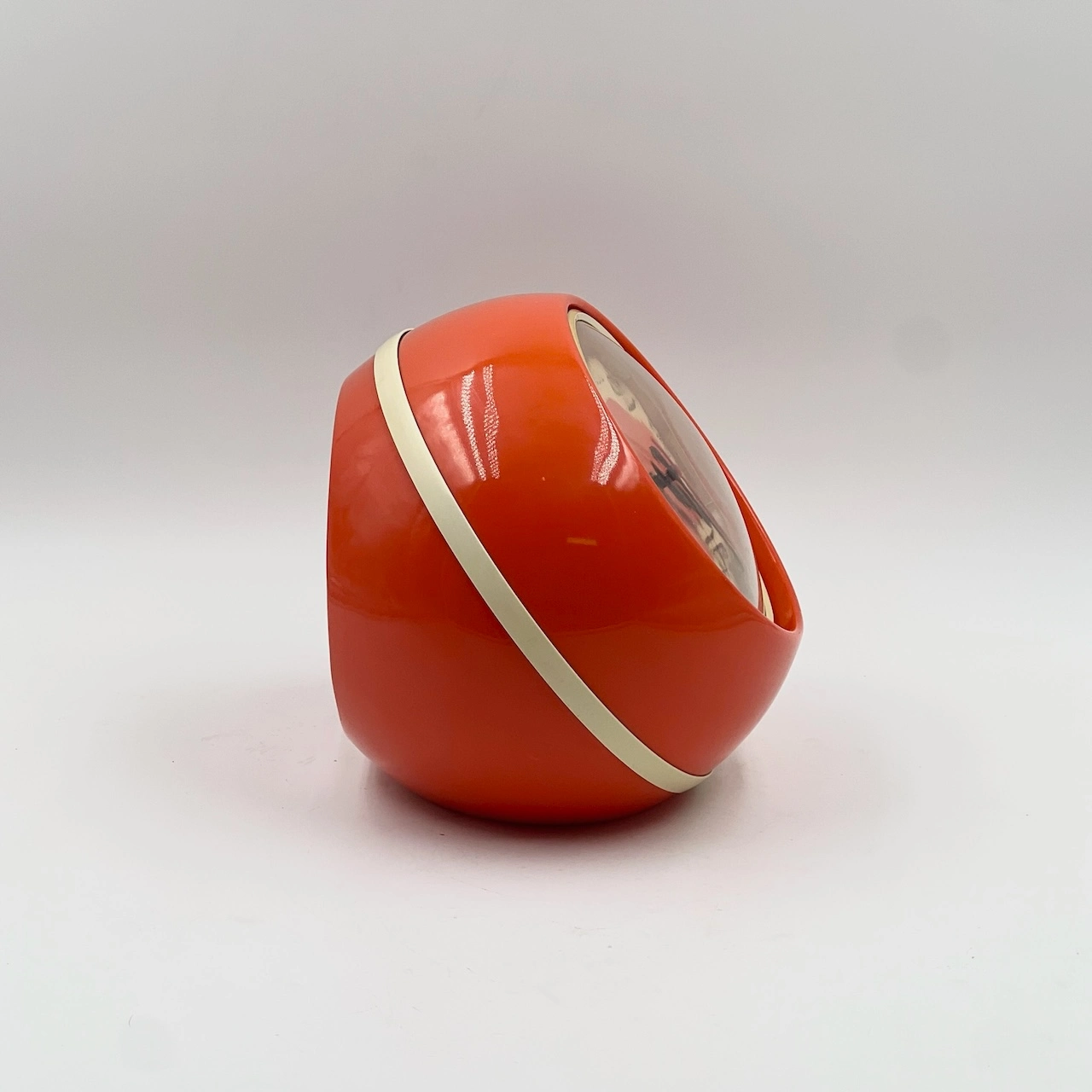 Space age 70s clock by Comsest crafted in Italy. Retro-futuristic design featuring a vibrant orange plastic structure and clear plastic dome-shaped cover.