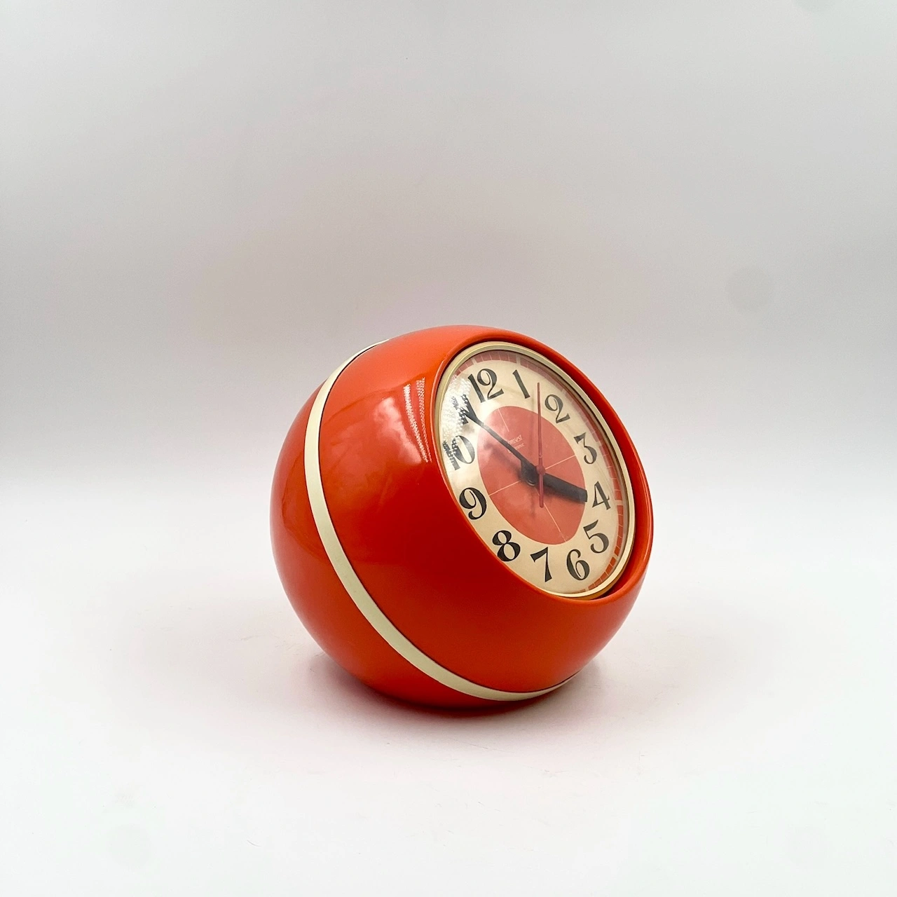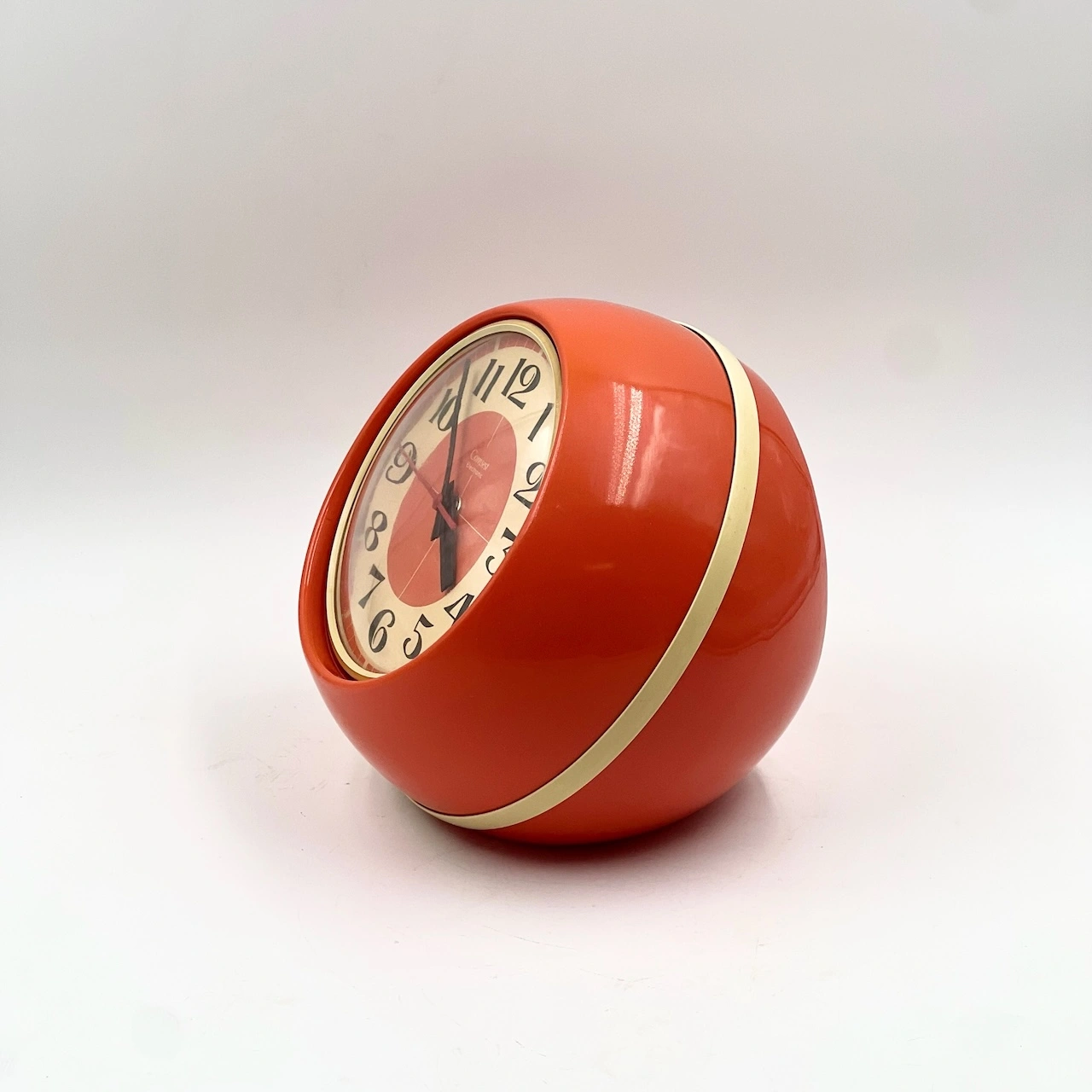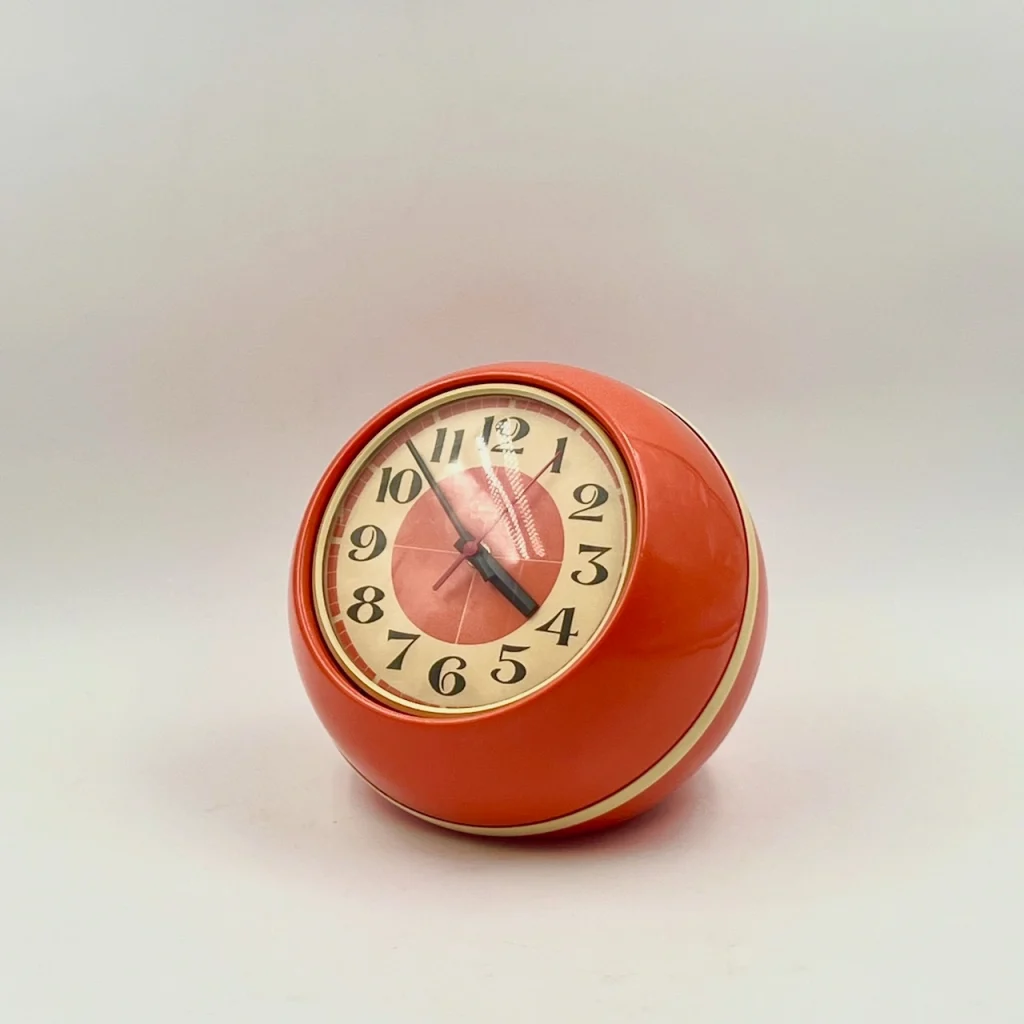 item. table clockmaker. comsestperiod. 1970scountry. Italymaterial. plasticcolor. orange, beigedimensions (cm). 24 x 20 x 24 Hcondition. excellent conditions with minor signs of age. art. no. 1540