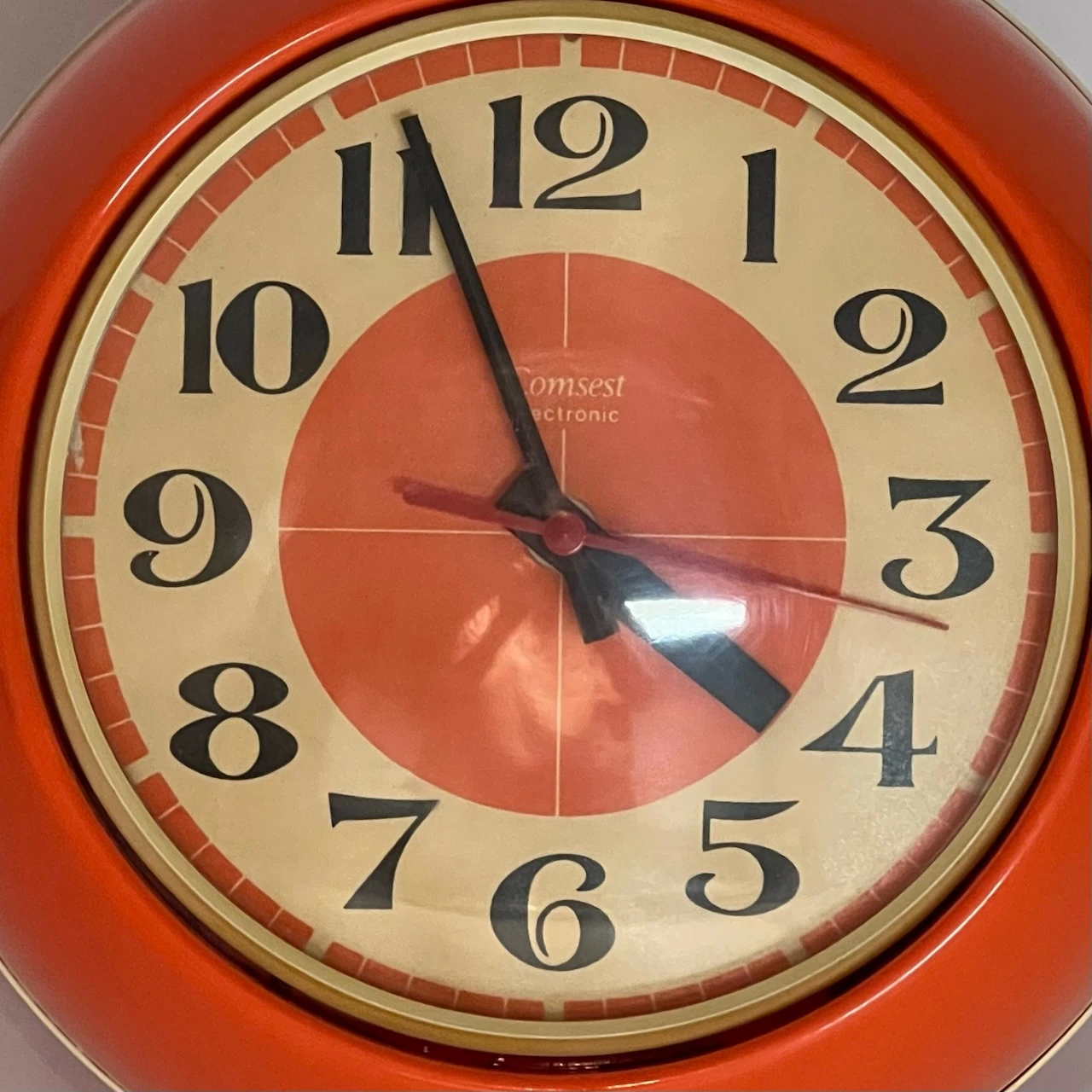 Elevate your interior with this striking space age 70s clock by Comsest, an iconic piece of Italian craftsmanship from the Seventies. Its vibrant orange plastic structure embodies the bold color palette of the era, while the clear dome-shaped cover offers both protection and an alluring retro-futuristic aesthetic.