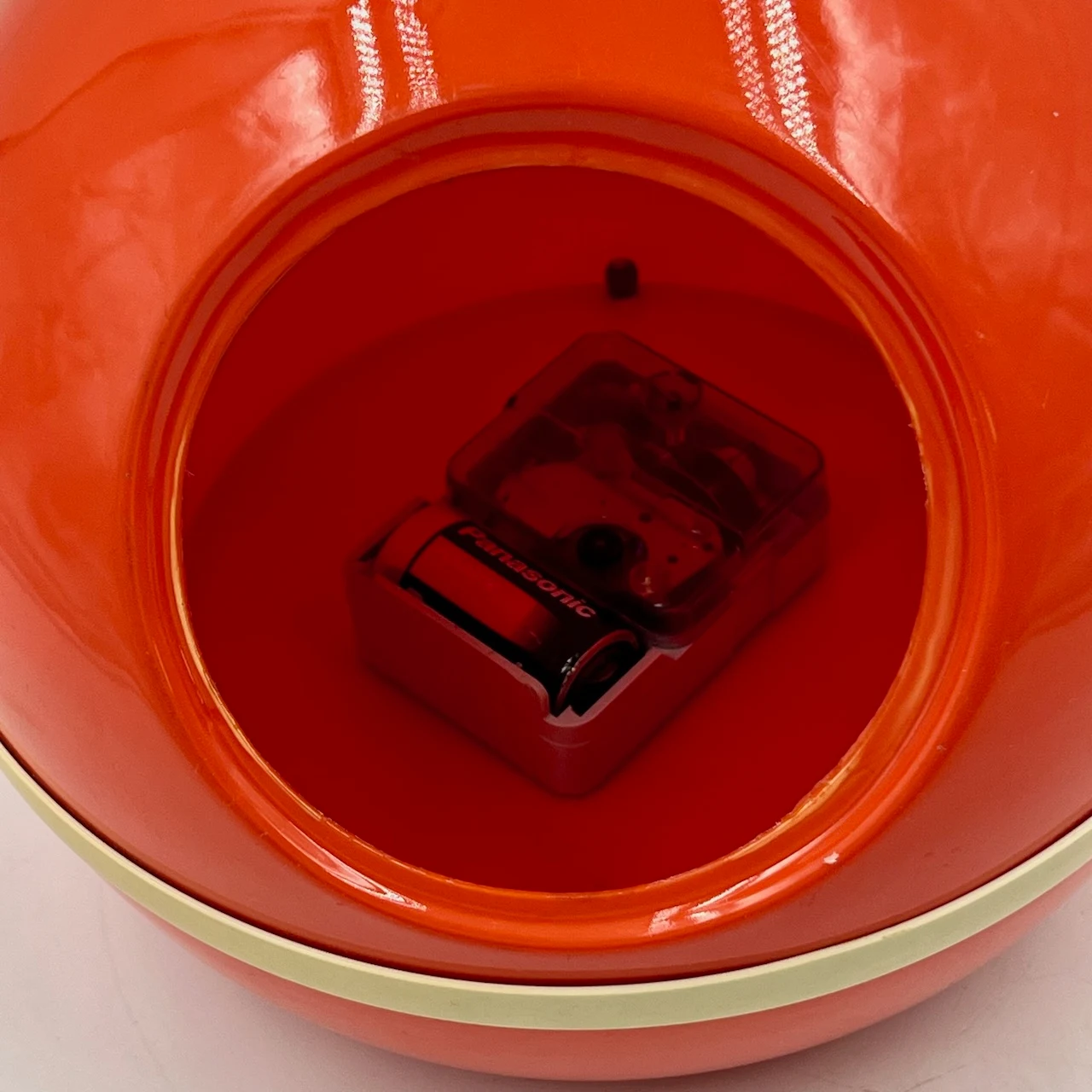 The clock face, crafted from cardboard, features exquisite 70s-style typography, enhancing the vintage appeal. Remarkably, the original German mechanism is still fully operational, a testament to the timeless quality of this rare design.