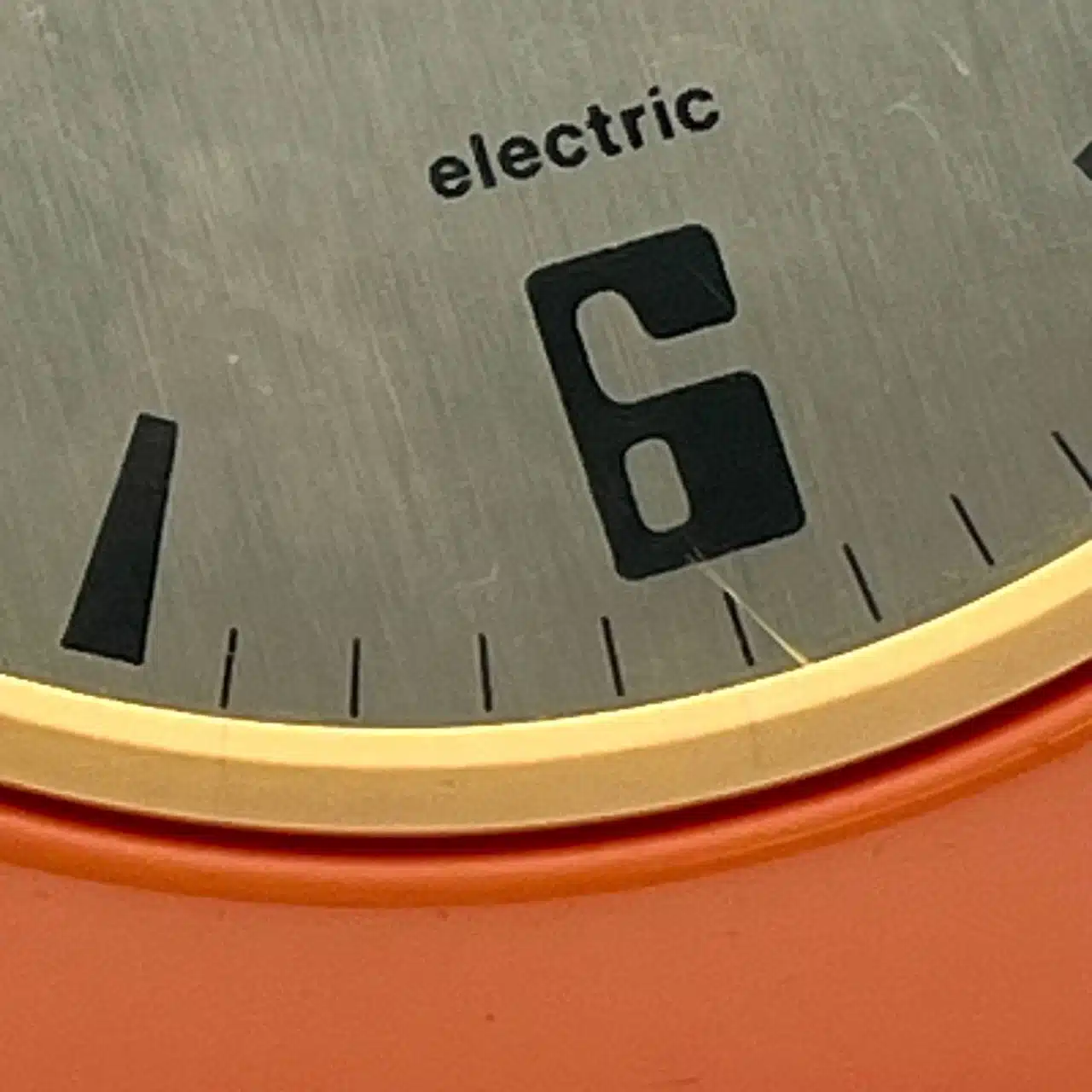 Space age 70s clock by Wetter crafted in Germany. Retro-futuristic design featuring a vibrant orange plastic structure, a sleek brushed aluminium dial and clear plastic dome-shaped cover.