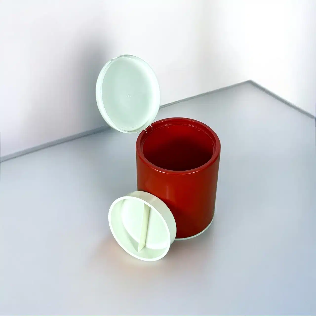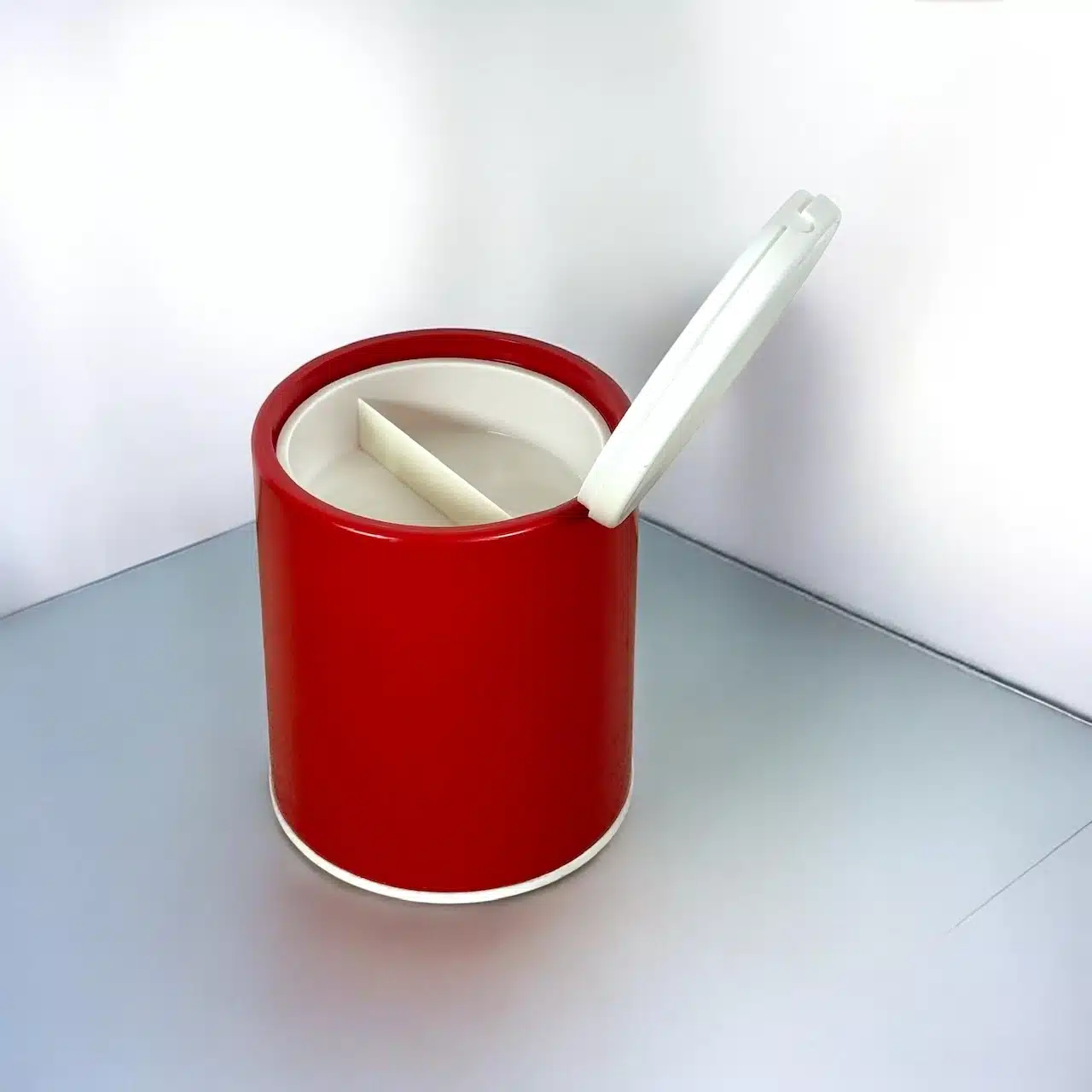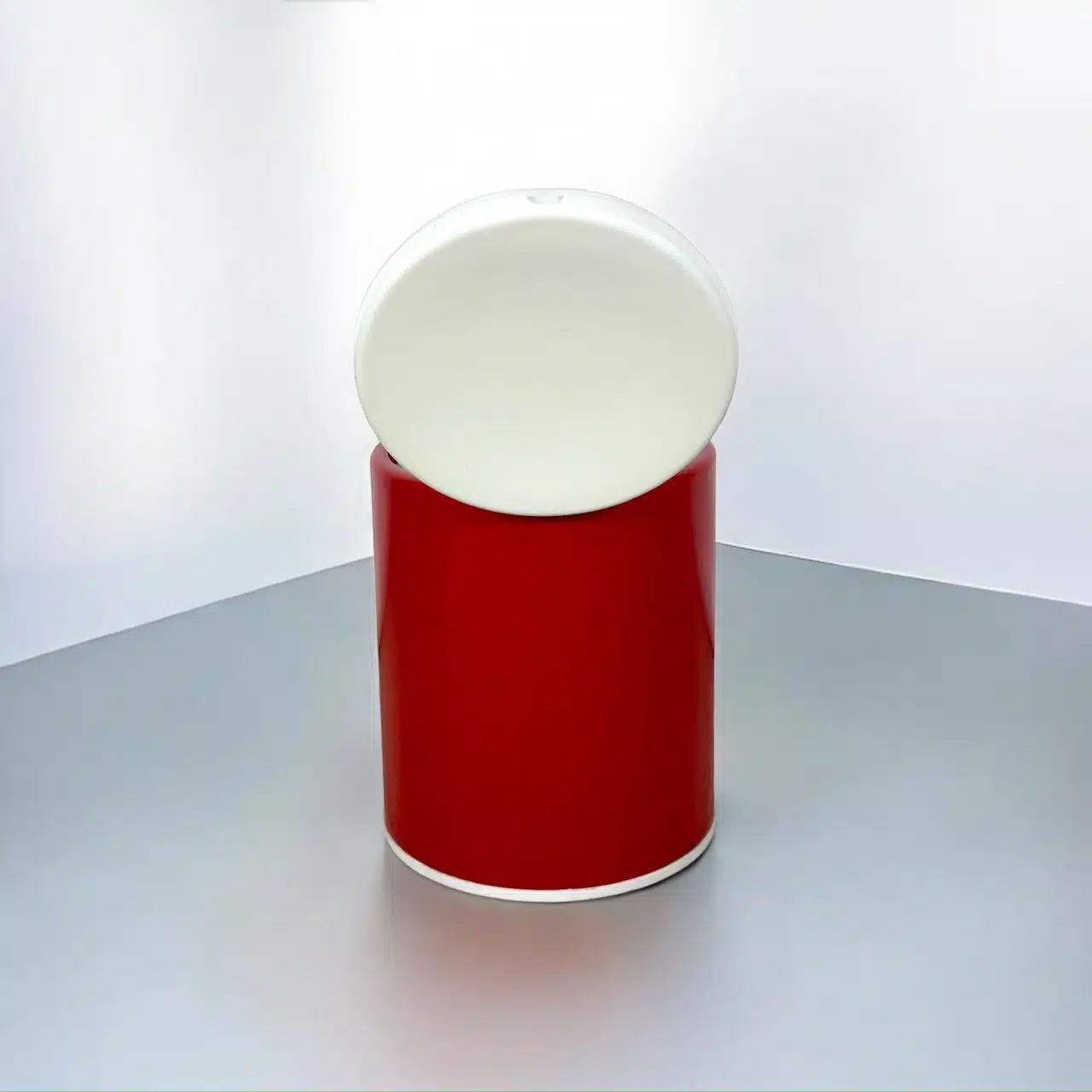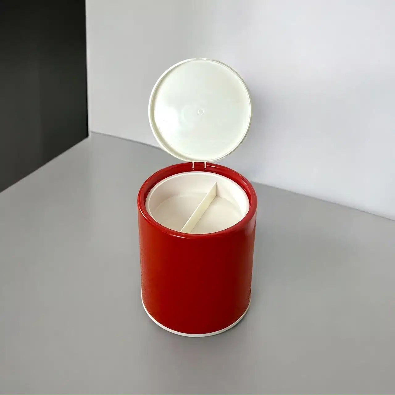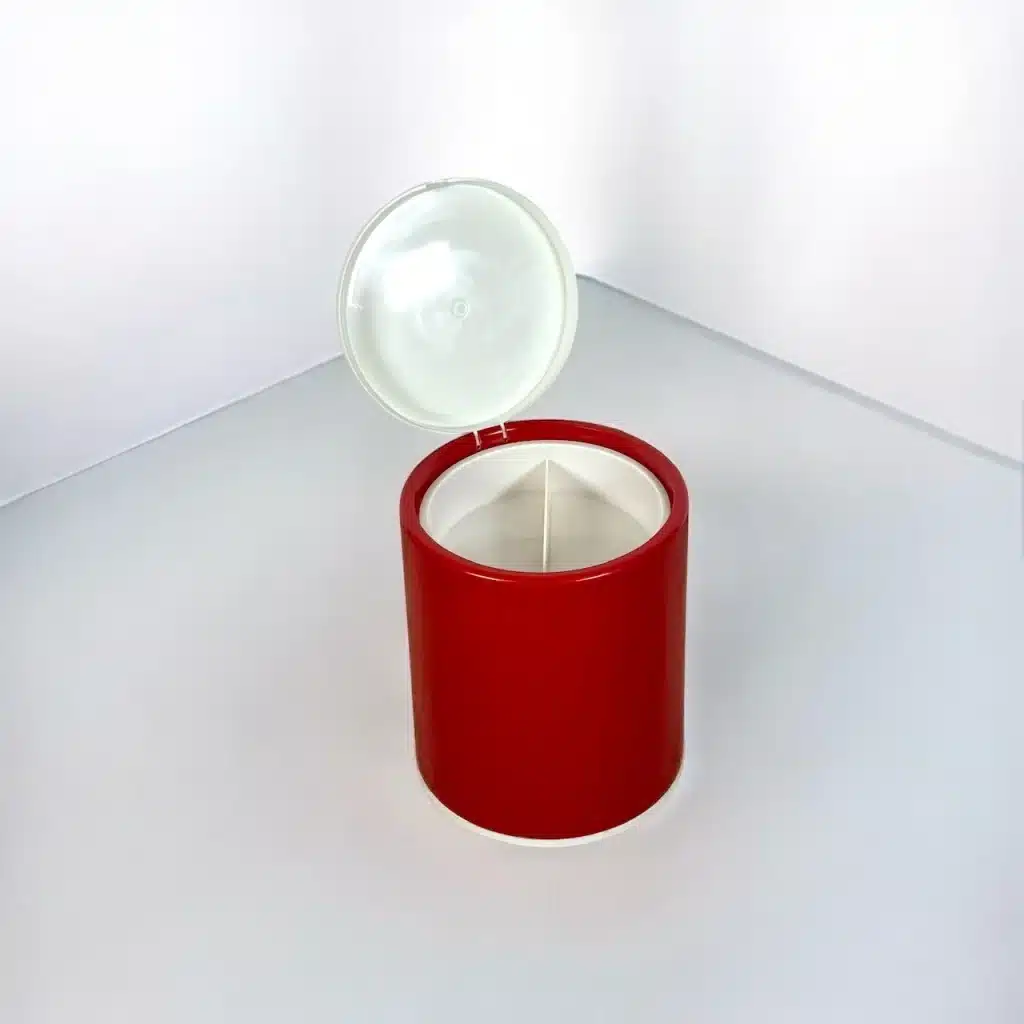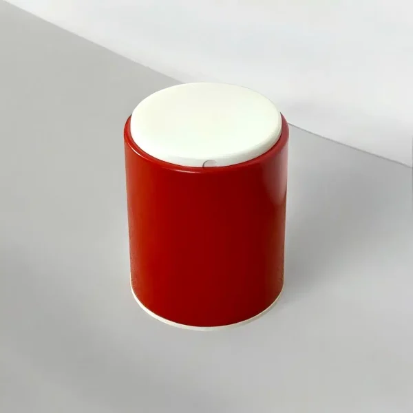 This round low stool has a compartment for small objects that can be removed to give access to the basket. The basket has a generous dimensions and can hold larger objects. The stool is made of glossy plastic materials, a signature of 70s products manufactured in Italy.