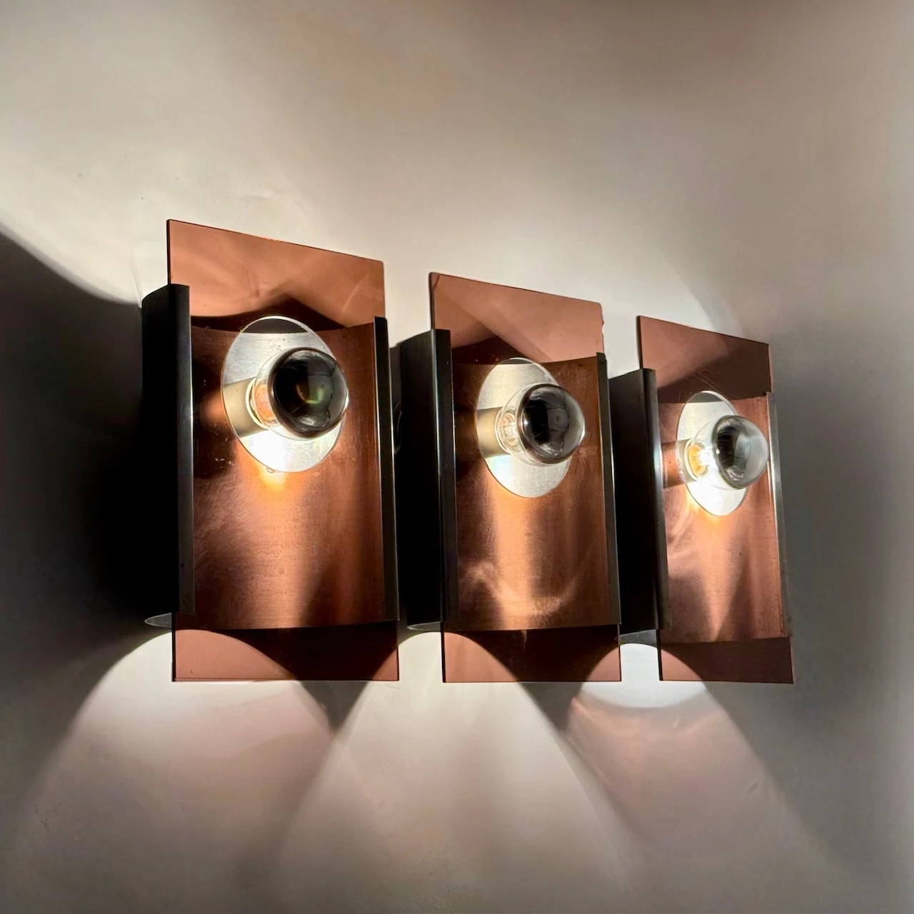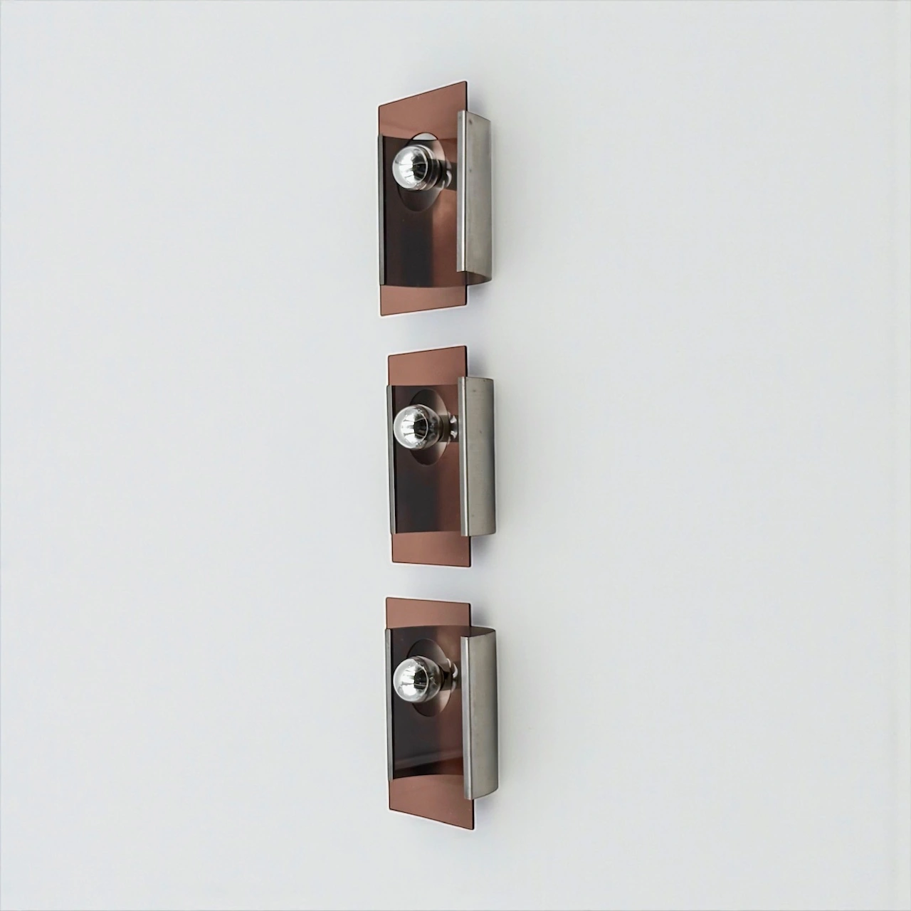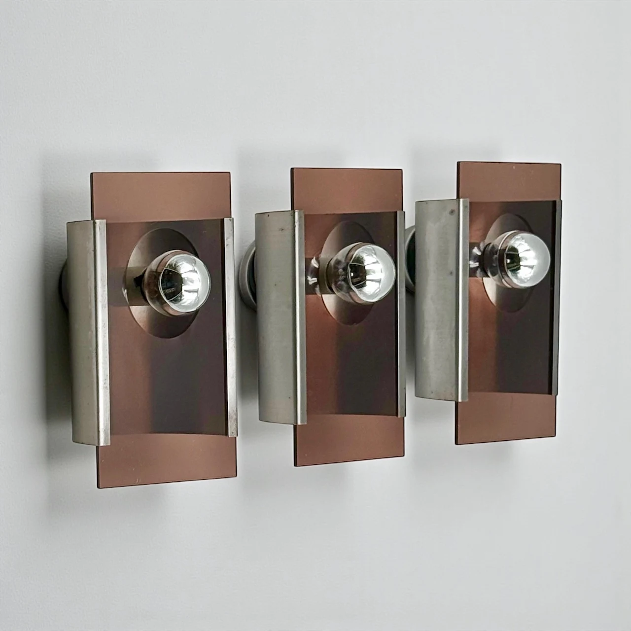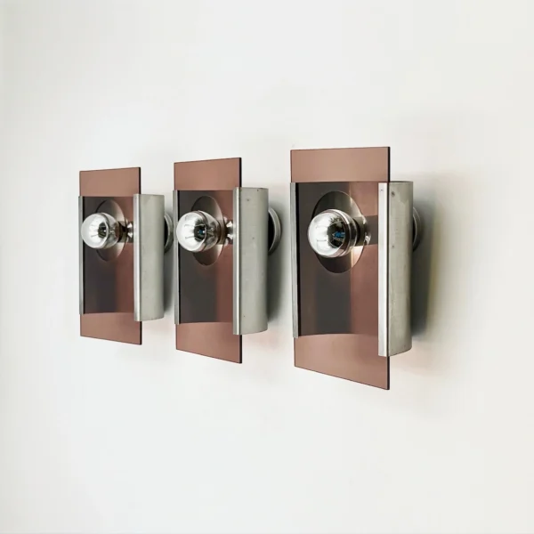 A sculptural set of three space age wall lamps from the 1970s, featuring smoked plexiglass panels and metal supports. Designed to create a dramatic visual rhythm on the wall, these lamps blend Italian experimental design with bold atmospheric lighting.