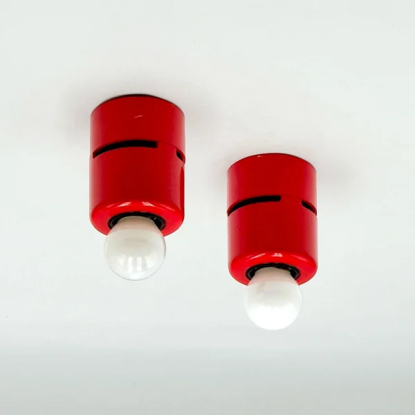 Pair of 1980s Stilnovo “Plafoniera” lamps in vivid red. Compact and geometric, they embody Italian modernism — rare vintage lights that combine color, proportion, and architectural grace.