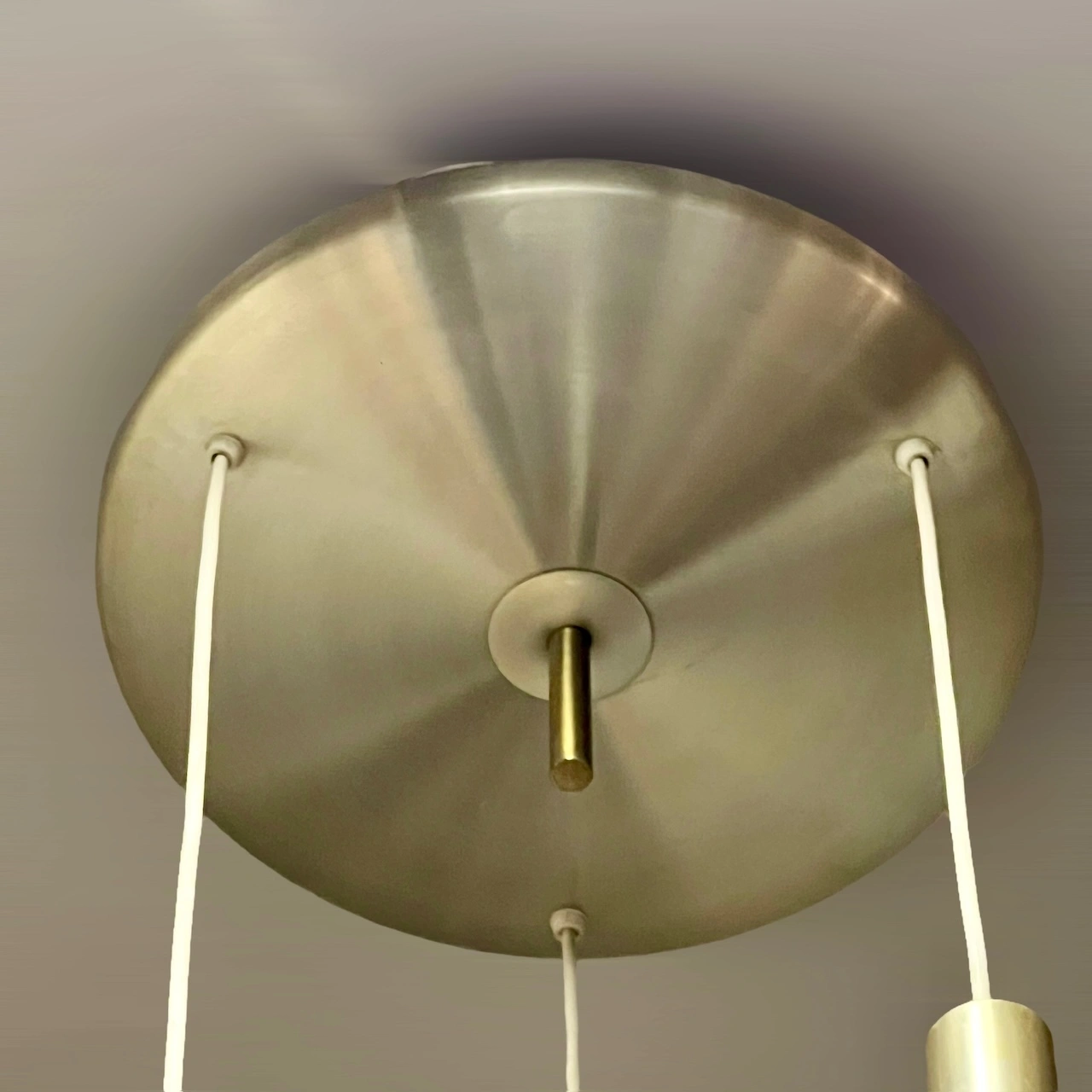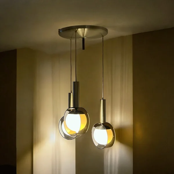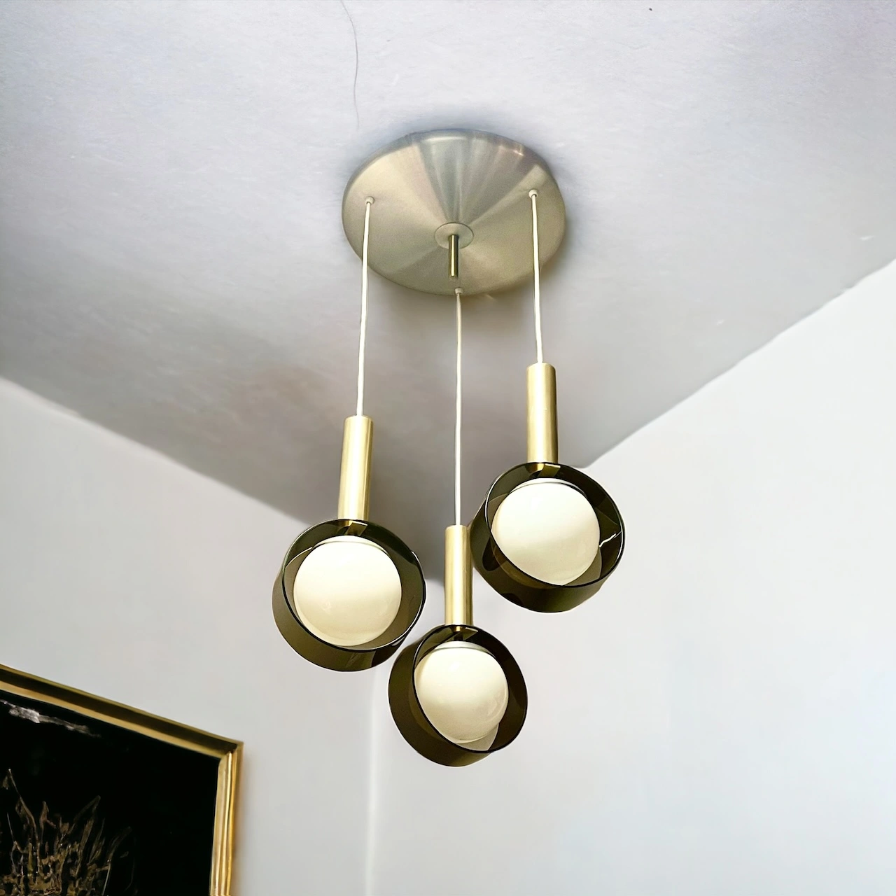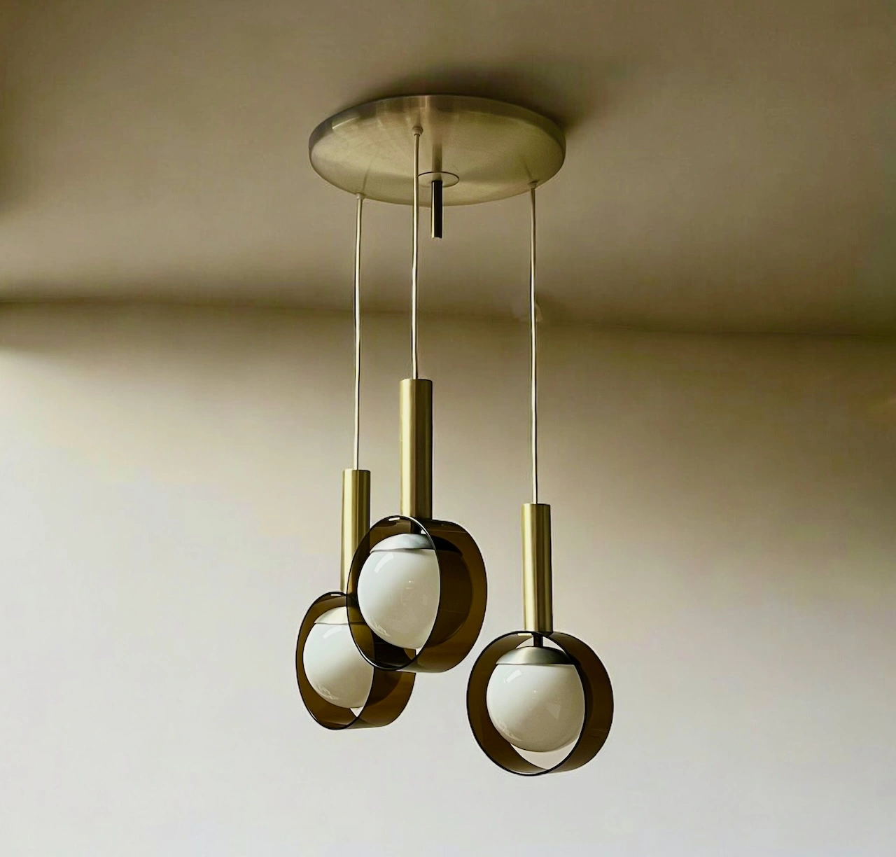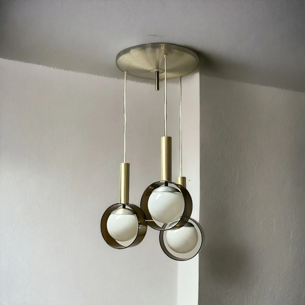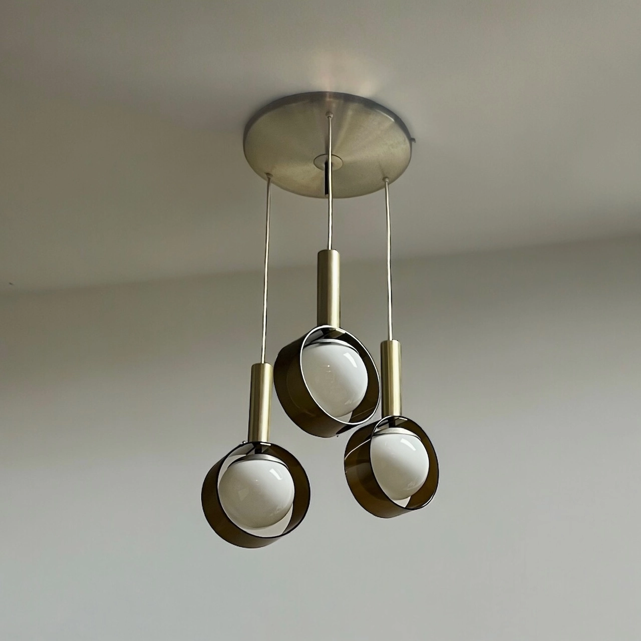 This chandeliers design embodies the futuristic aesthetics of the Space Age movement. Featuring three adjustable opaline white glass globes, it offers a mesmerizing visual impact, casting a soft, ambient glow that enhances any space. The globes are supported by a striking gold metal structure, while the brown perspex rings add a dynamic contrast, creating a sophisticated and eye-catching interplay of materials.