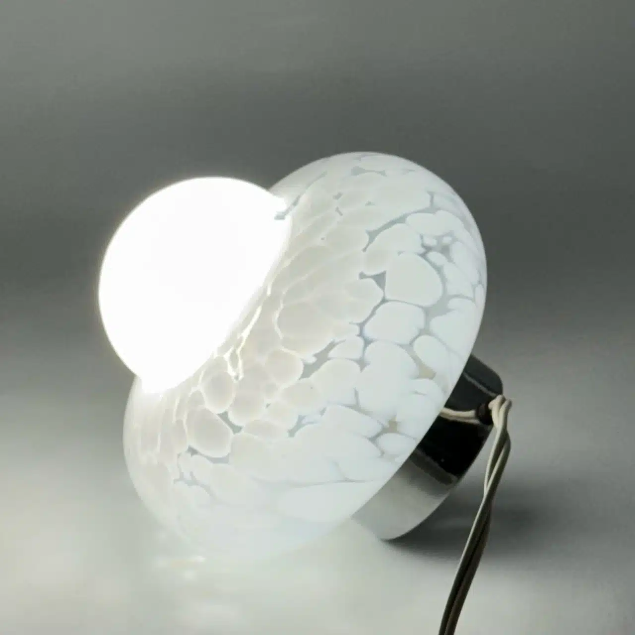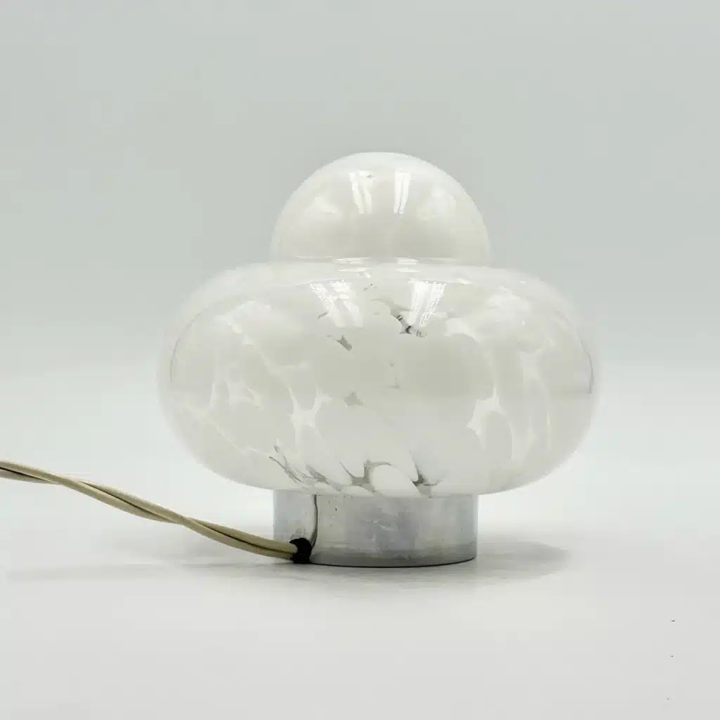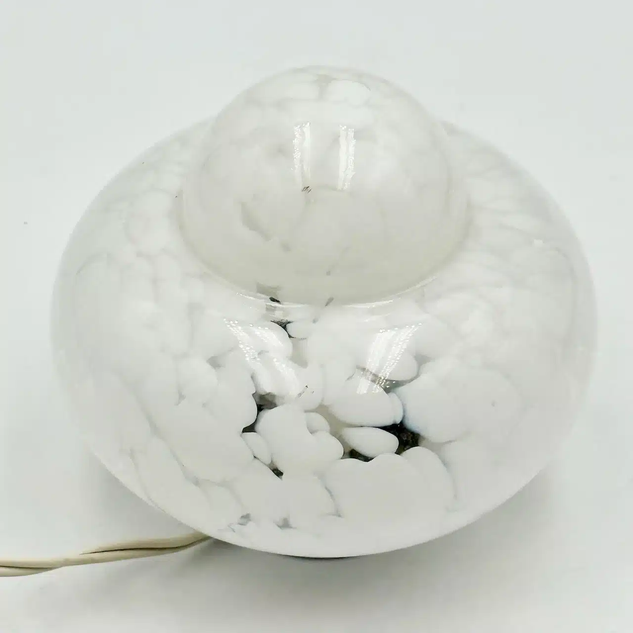 A captivating original 1960s UFO lamp, showcasing the iconic flying saucer silhouette and a unique hand-blown glass shade with a striking white marbled texture.