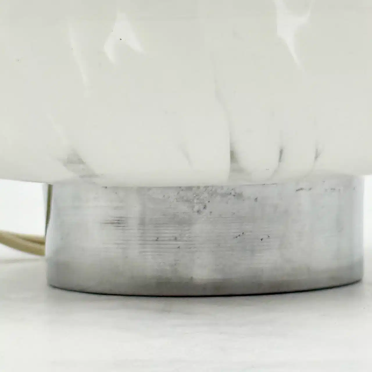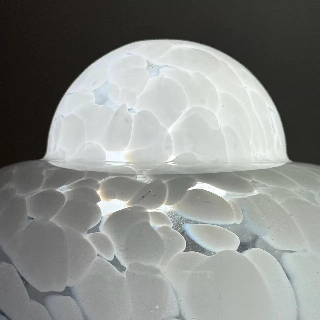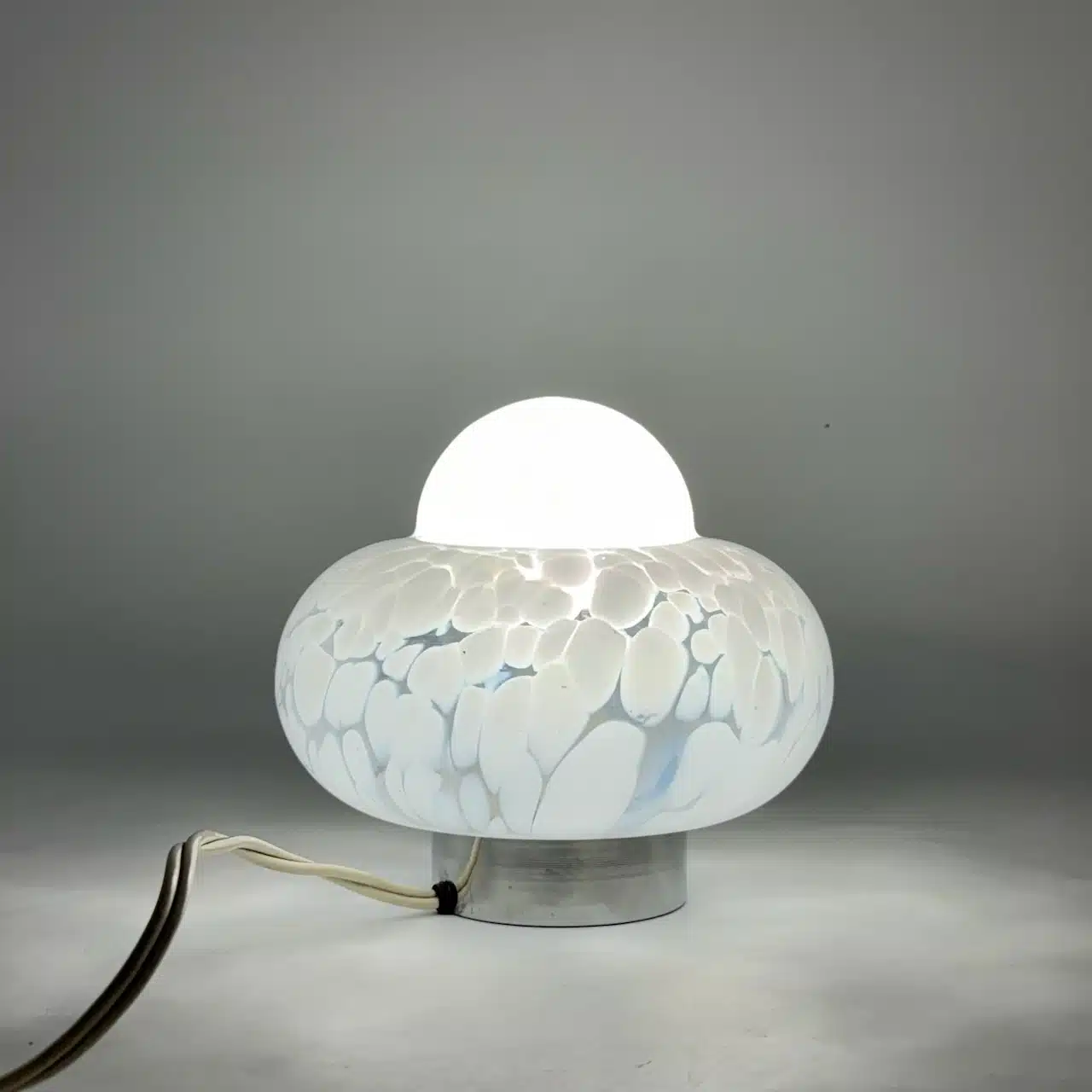 A captivating original 1960s UFO lamp, showcasing the iconic flying saucer silhouette and a unique hand-blown glass shade with a striking white marbled texture.