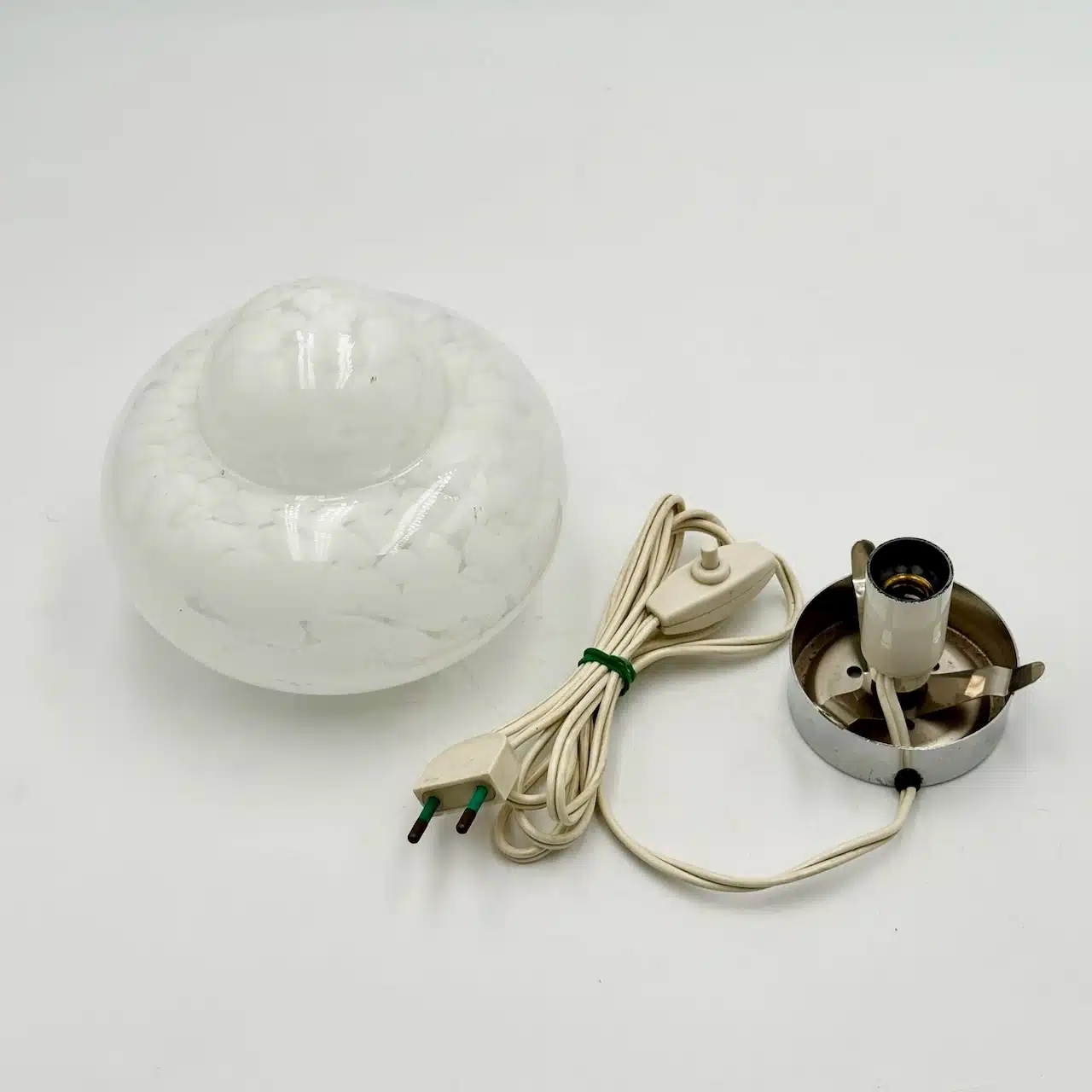 The glass is individually crafted, with delicate veining that gives it a distinct character. The lamp retains its original Bakelite lamp holder and the original switch and plug.