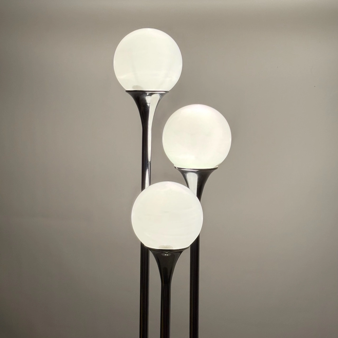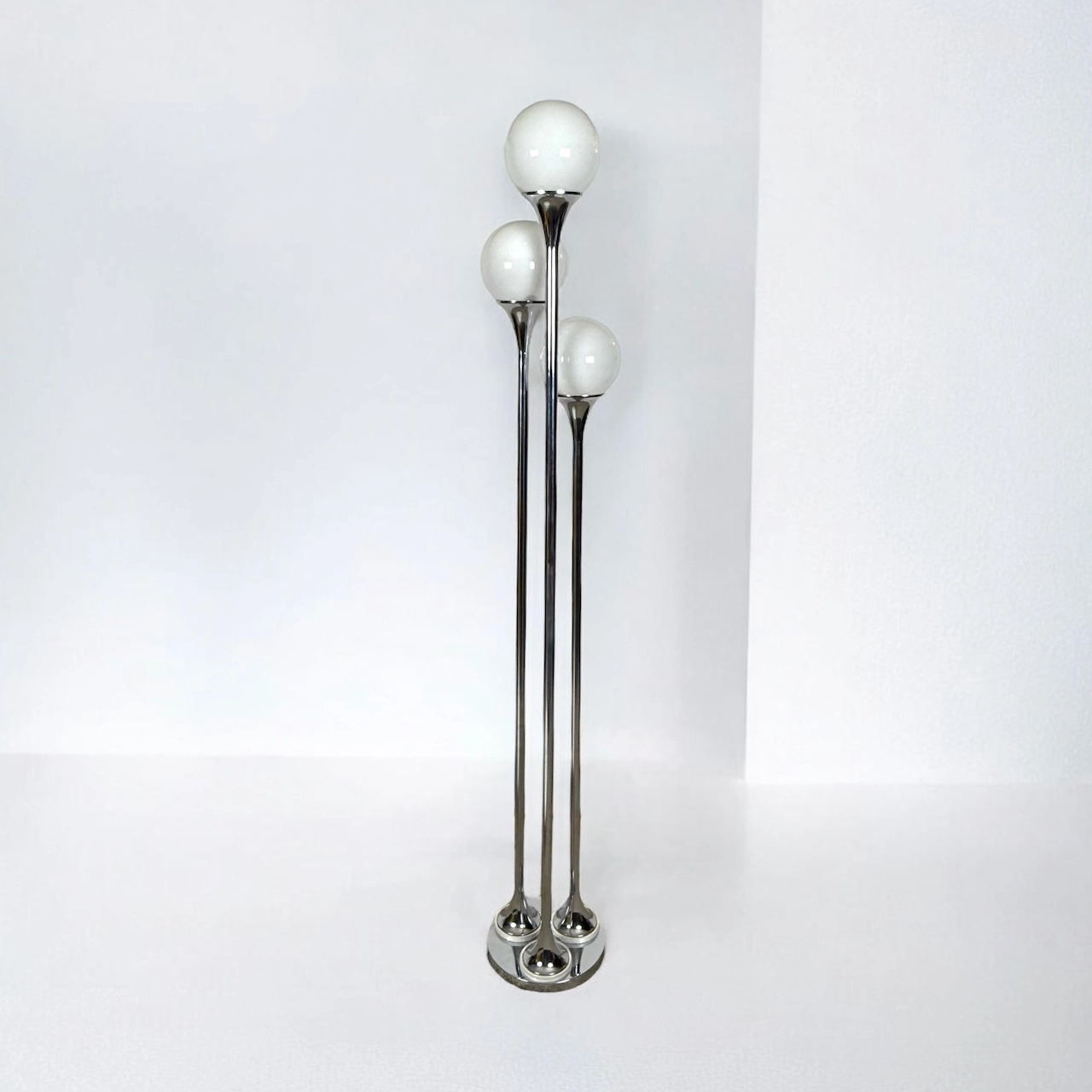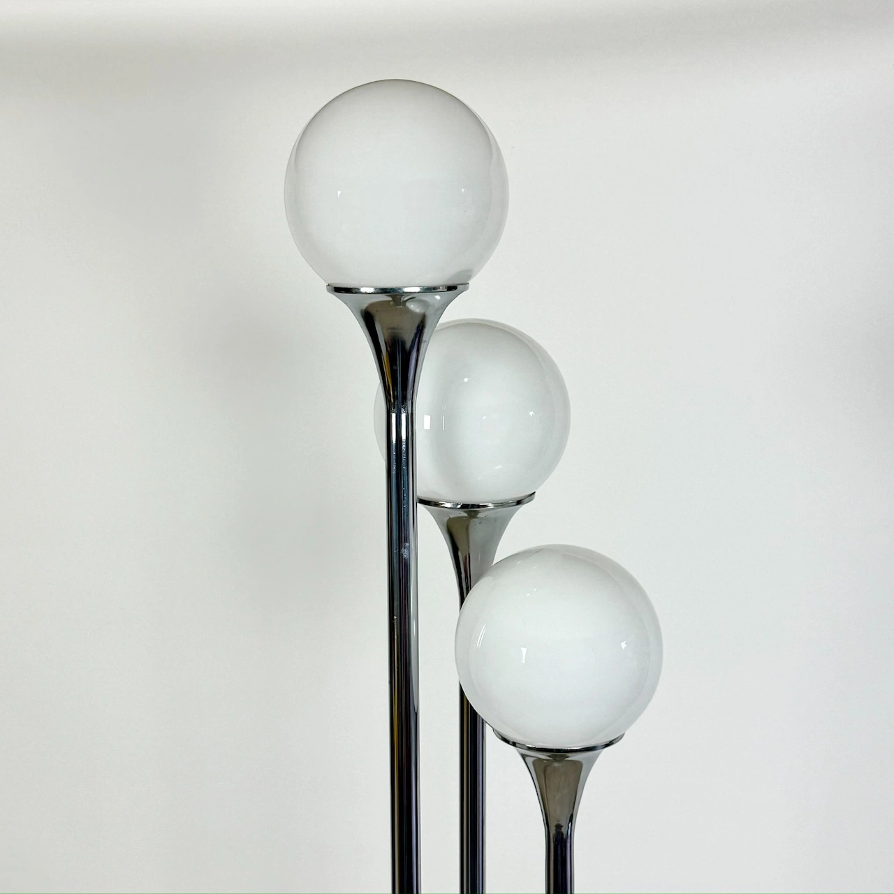 Elegant 70s floor lamp by Oma Padova with chrome stems and glass globes. A rare vintage lighting piece with stunning Space Age aesthetics.