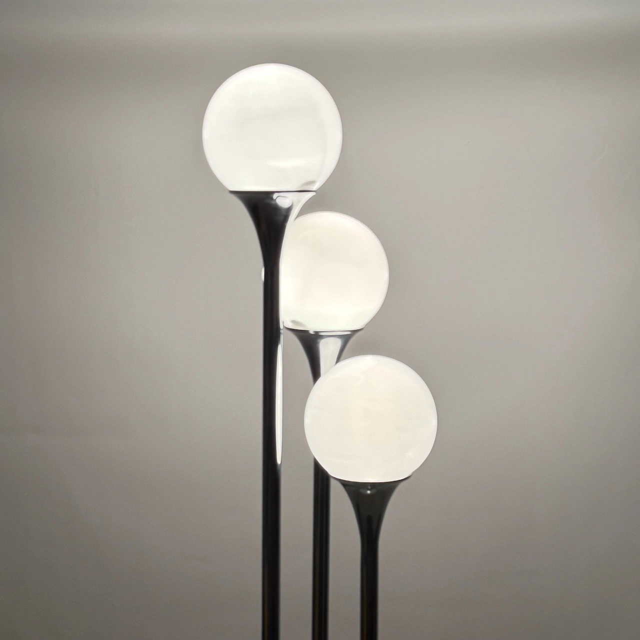A rare and elegant 70s floor lamp by Oma Padova, featuring a chrome metal base and sleek stems with glossy white glass diffusers. Its sculptural presence and refined materials make it a true statement piece of 1970s Italian design, perfect for adding a Space Age or Hollywood Regency touch to any interior.