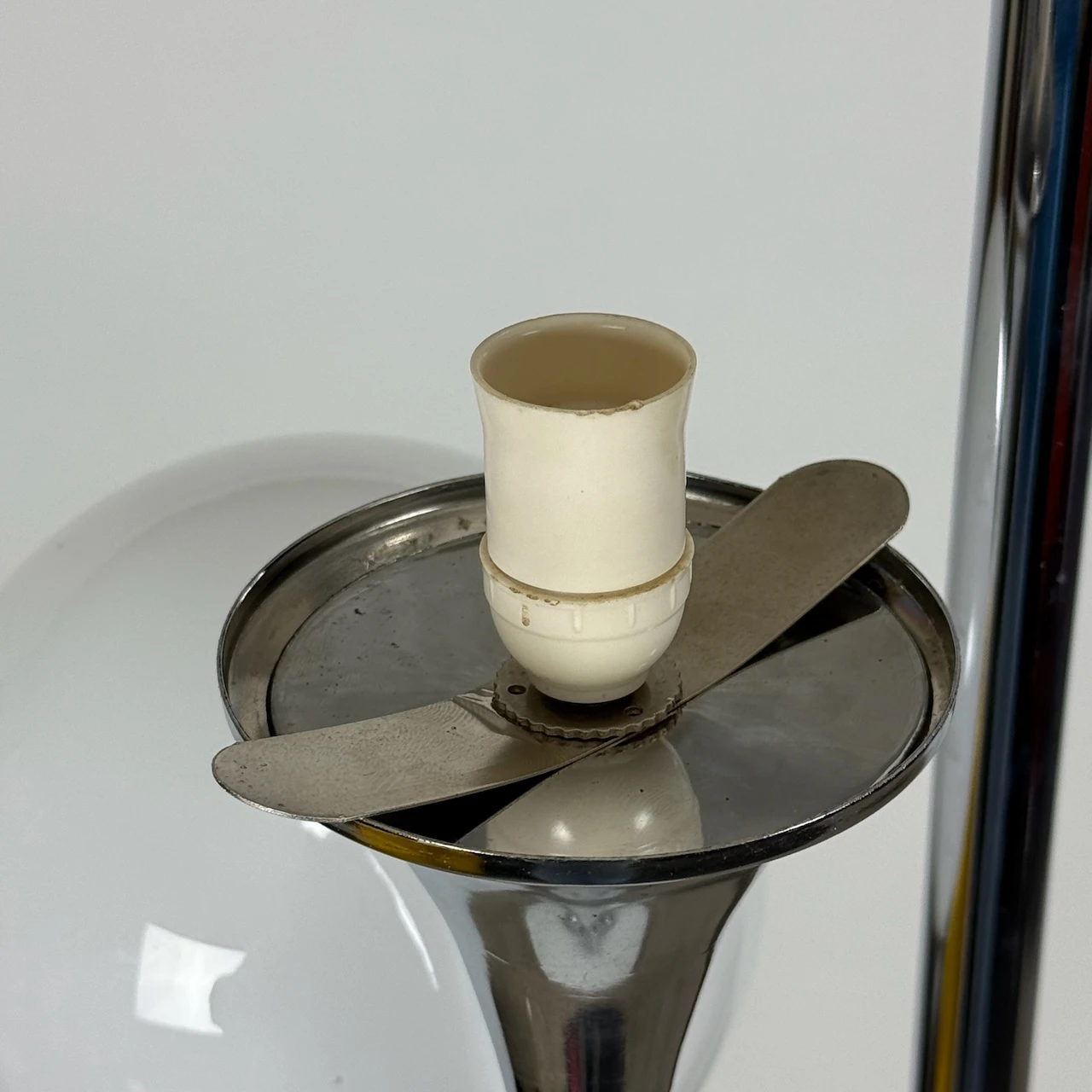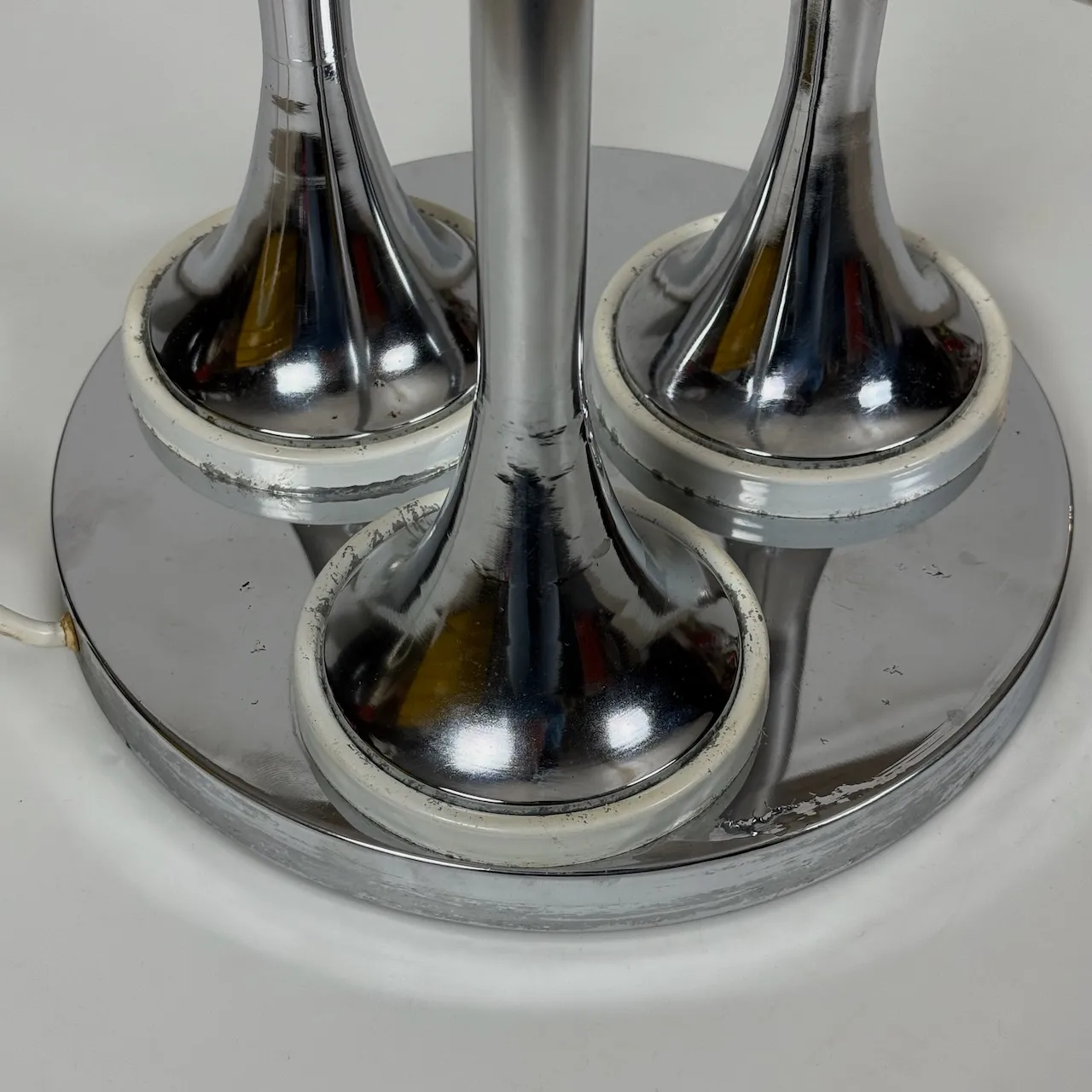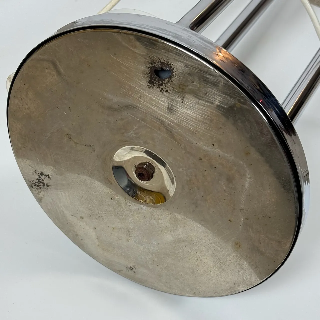 condition. very well preserved. the chrome plating is shiny. there are very slight and non-bothersome traces of oxidation, mainly concentrated on the base. the lower disc of the base has a small perforation due to rust (see photos). the switch and plug have been replaced. works with a 3 standard E14 bulbs. european plug – works outside Europe with a simple adapter.