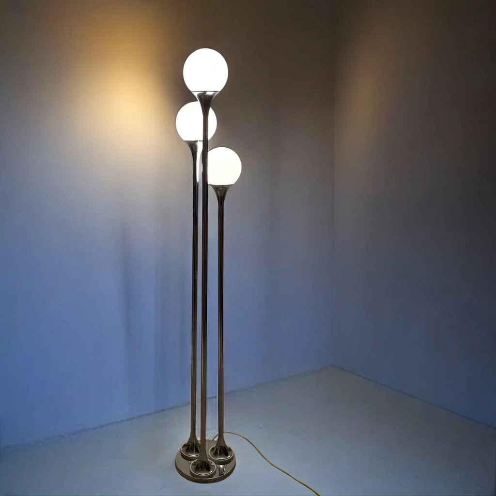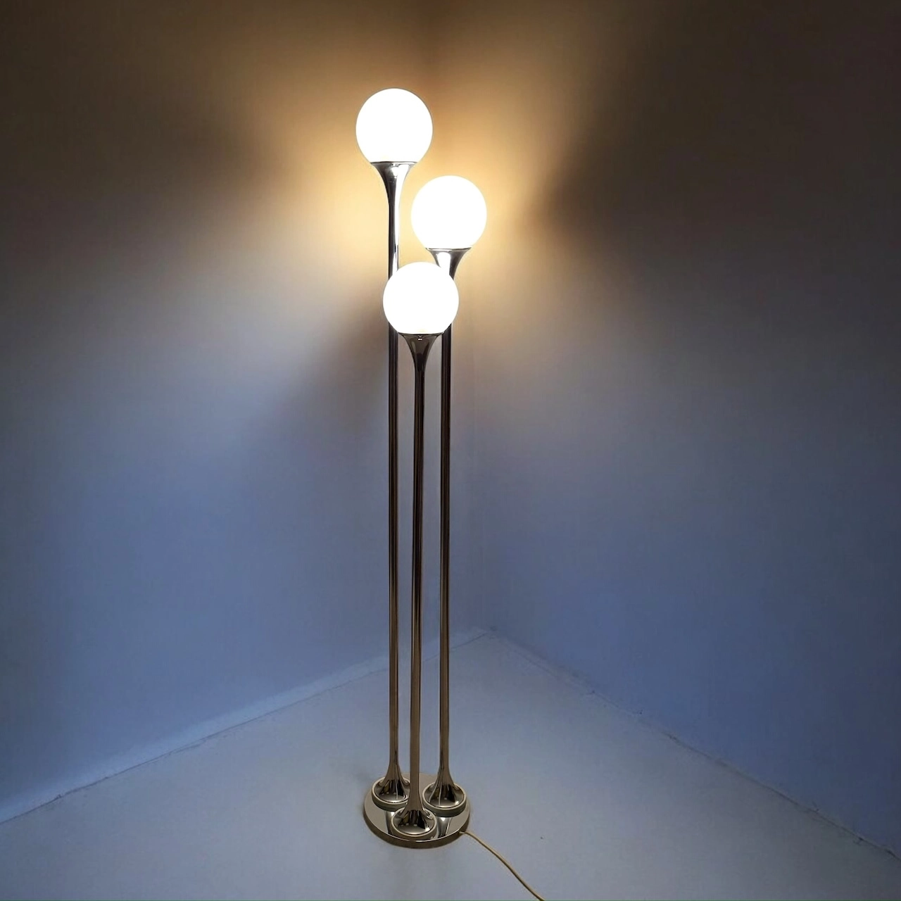 The three slender chrome stems rise gracefully, each crowned by a luminous glass globe, creating a striking visual effect both on and off. The high-quality chrome plating remains brilliant and reflective, enhancing the lamp’s luxurious aesthetic. With its height of 154 cm and a compact base diameter of 24 cm, it fits beautifully into various settings, from a vintage-inspired living room to an elegant contemporary space.