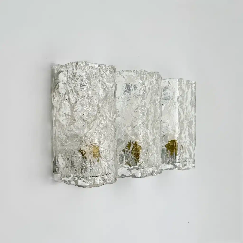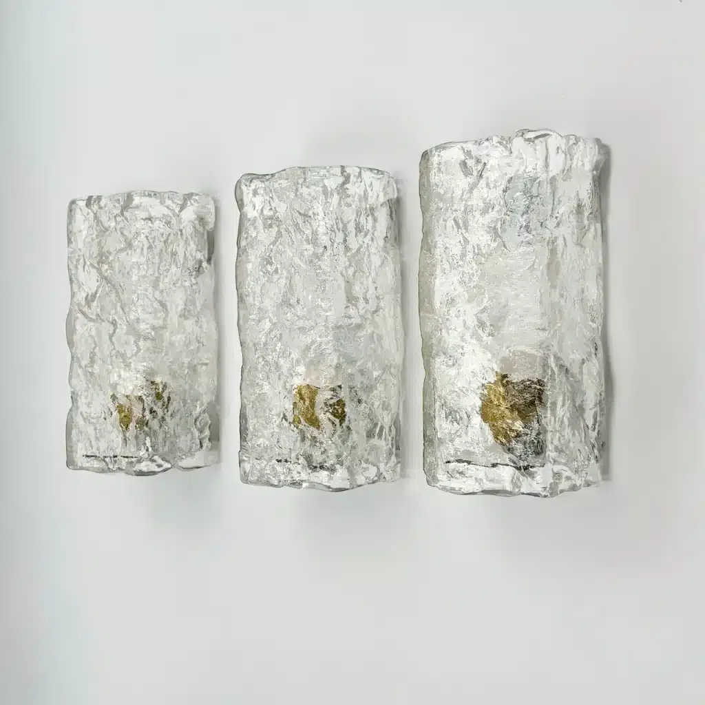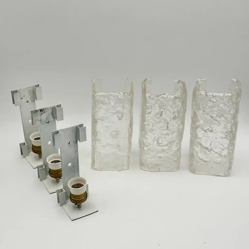Set of 3 vintage Murano ice glass sconces from the 70s in Kalmar Franken style. Each piece is unique and radiates timeless charm and sculptural beauty. Elegant, rare and collectible.