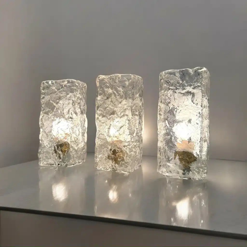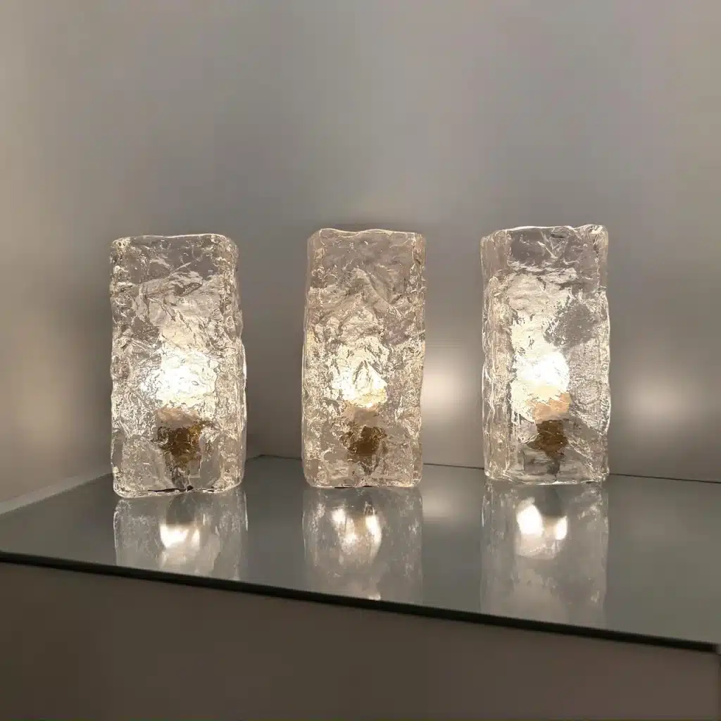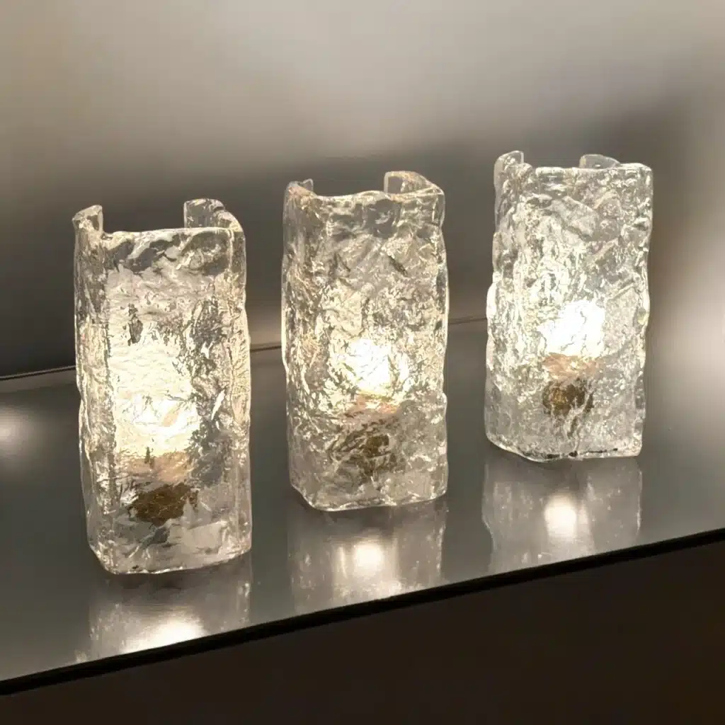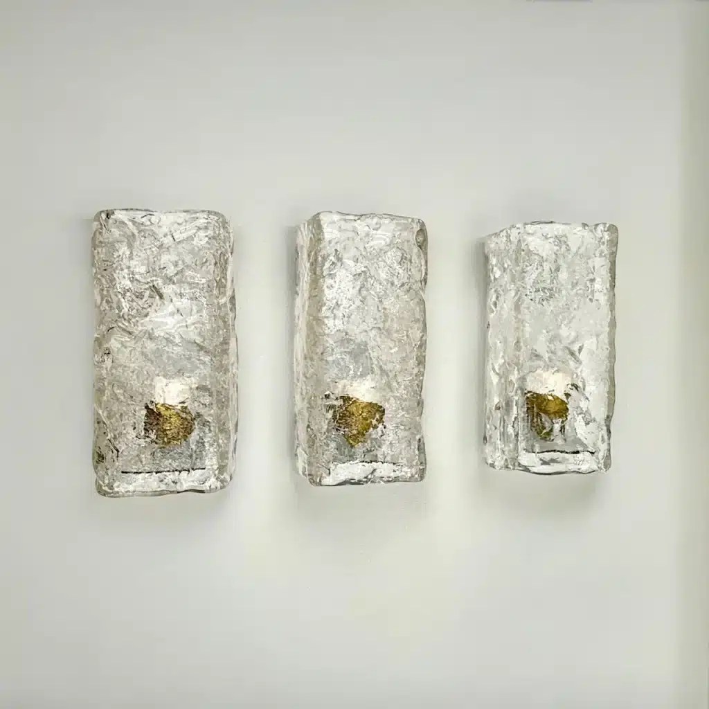 Set of 3 vintage Murano ice glass sconces from the 70s in Kalmar Franken style. Each piece is unique and radiates timeless charm and sculptural beauty. Elegant, rare and collectible.