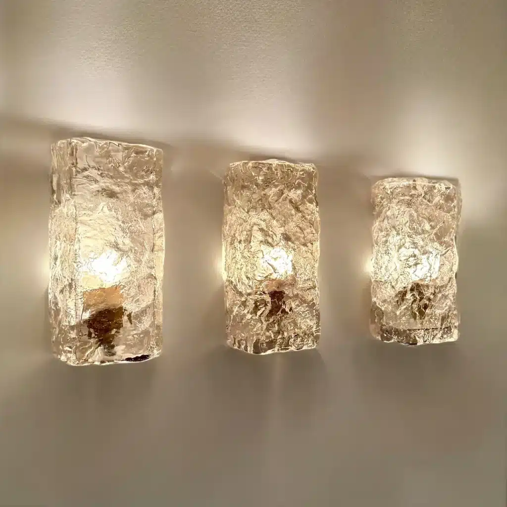 Elevate your interior with this stunning set of 3 Murano ice glass sconces from the 1970s.